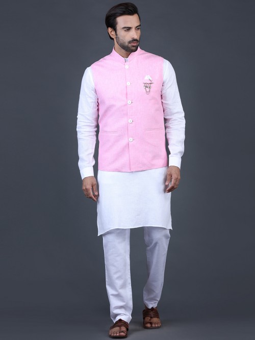 Make an impressive statement with this solid pink linen fabric party wear waistcoat set. It features a stand collar, full button placket, and vented hem, making it an ideal choice for any special occasion. The set includes a kurta suit to complete the look.