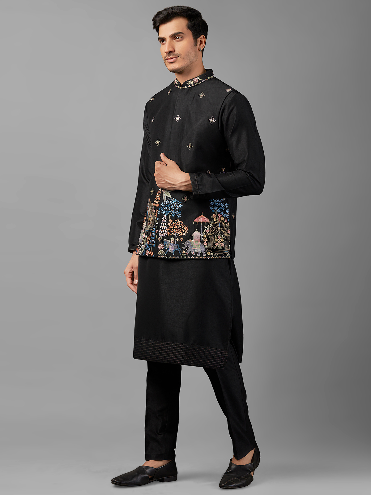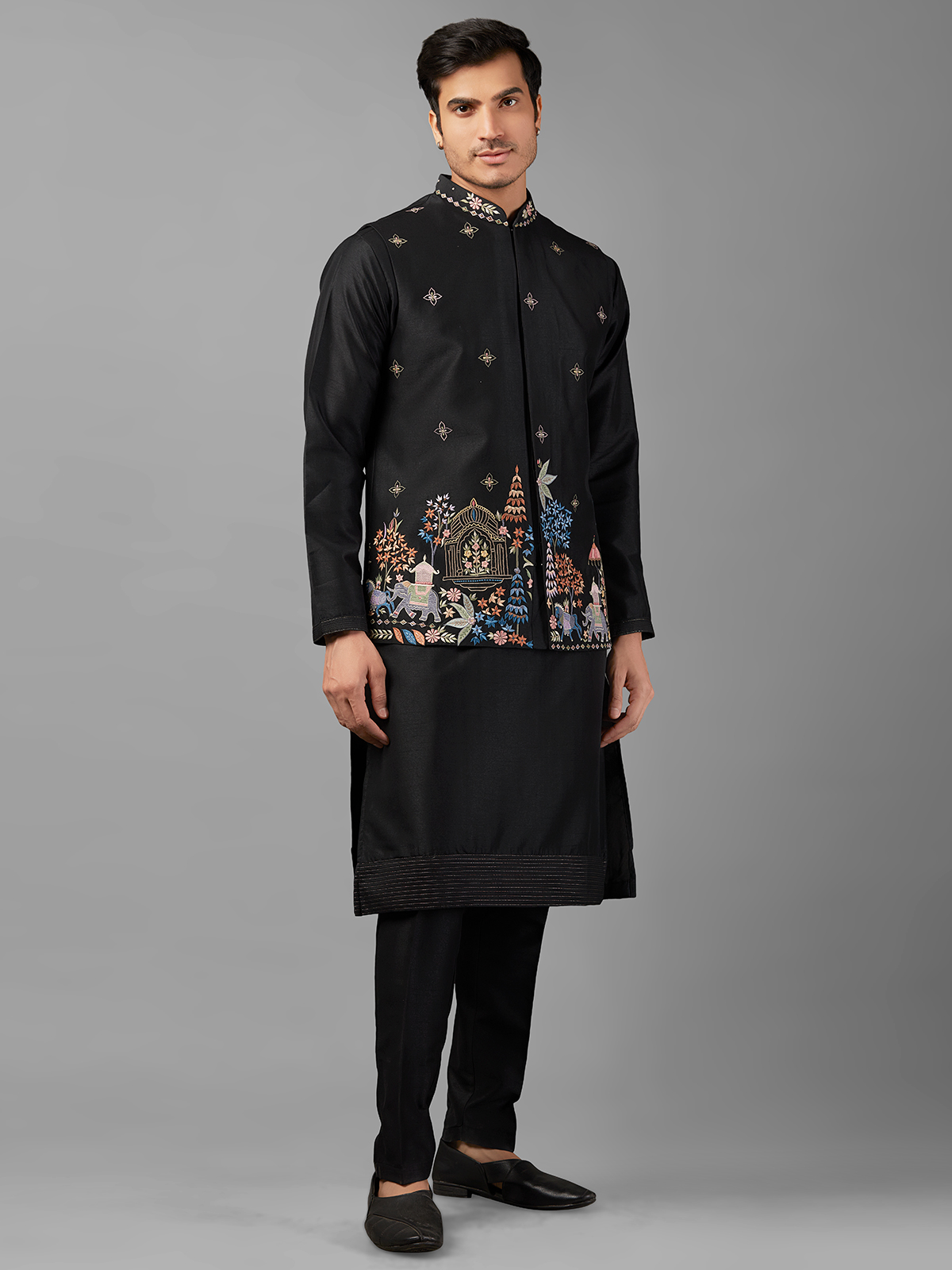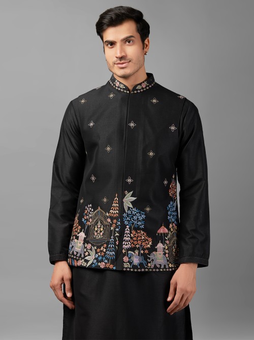 Stay on-trend with our stylish black silk waistcoat set adorned with intricate embroidery work. Perfect for complementing your ethnic wardrobe, this ensemble includes a coordinating bottom for a refined look.