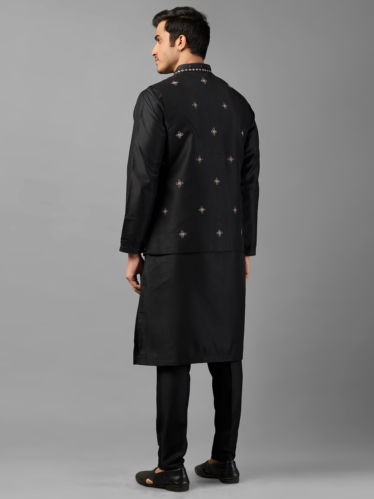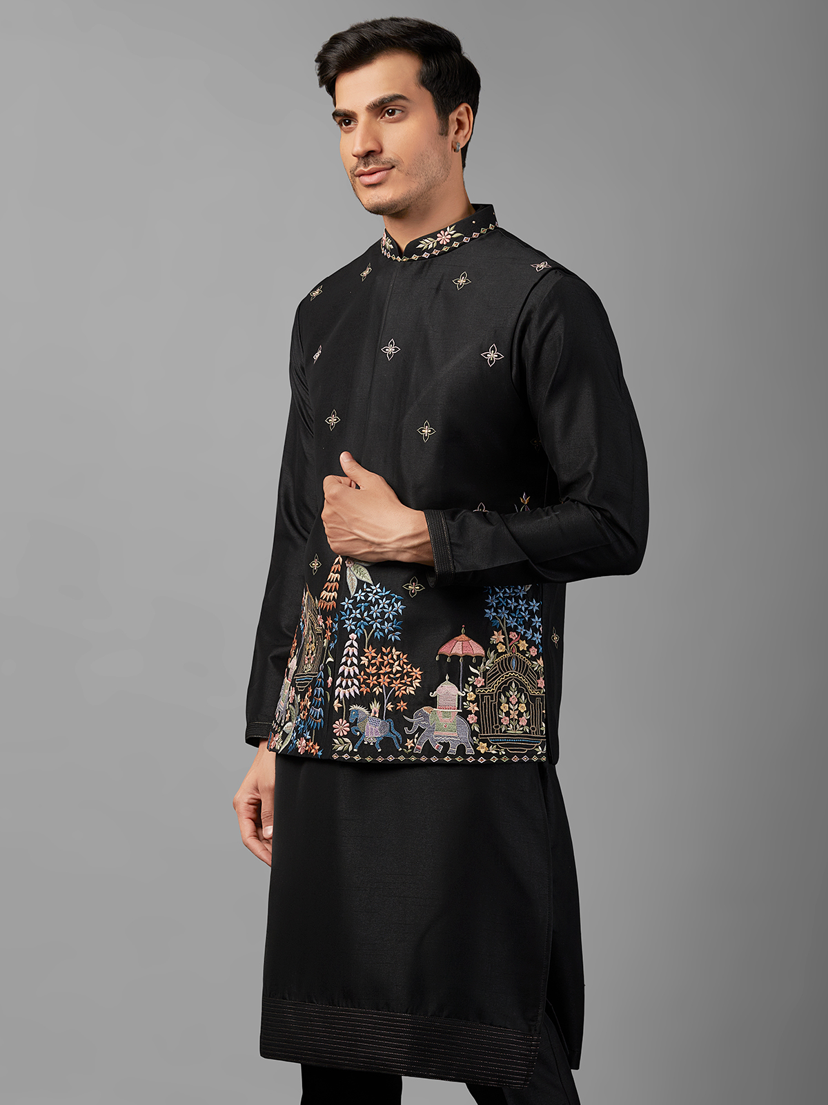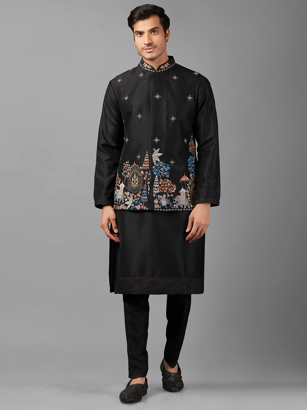 Stay on-trend with our stylish black silk waistcoat set adorned with intricate embroidery work. Perfect for complementing your ethnic wardrobe, this ensemble includes a coordinating bottom for a refined look.