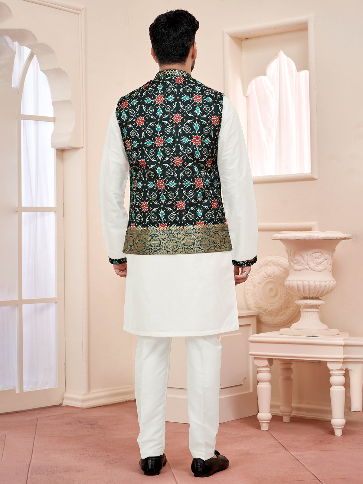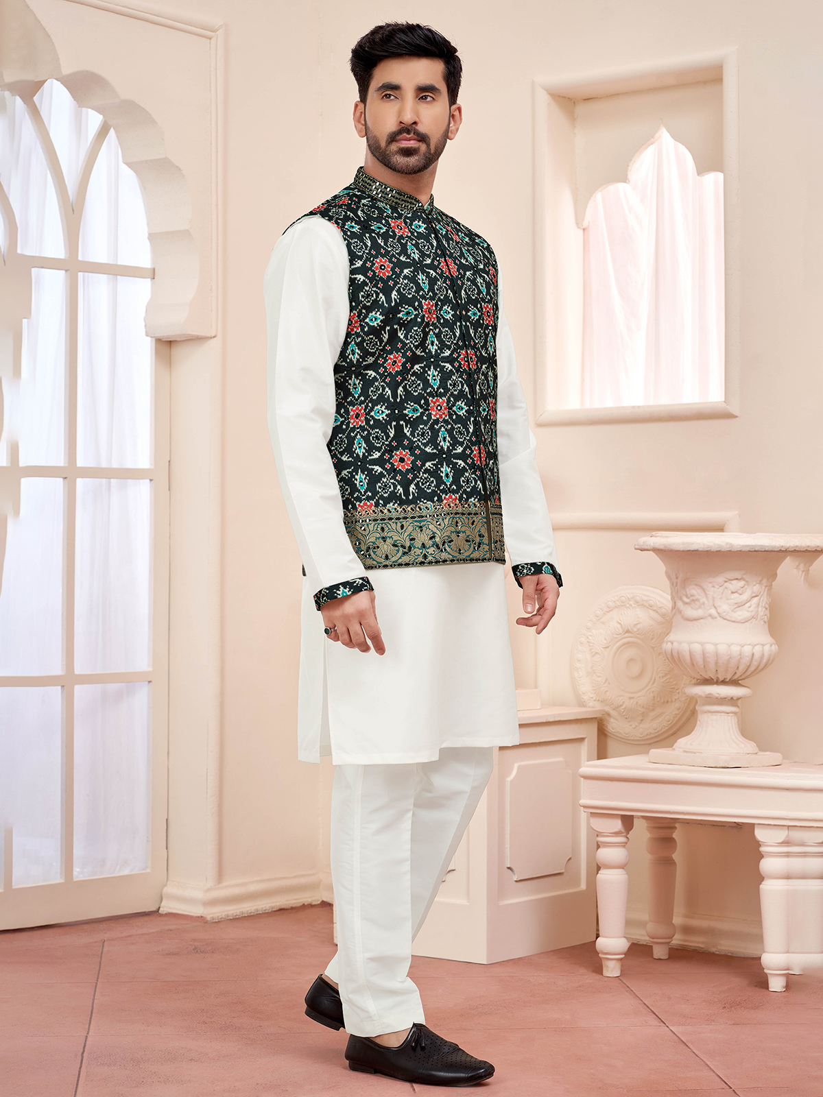 Stylish White And Green Waistcoat Set For Weddings And Festivals