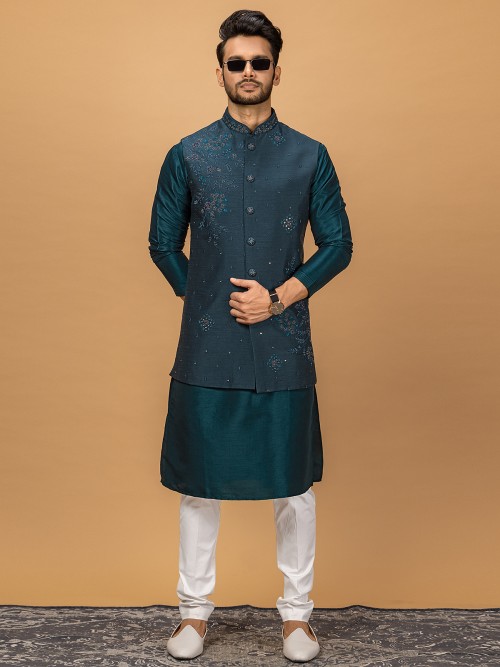 Add a timeless piece to your wardrobe with our classic teal blue silk waistcoat set featuring embroidery, resham, mirror, and cutdana work. This set includes a mandarin collar and classy front buttons placket, and comes with a bottom to complete the look.