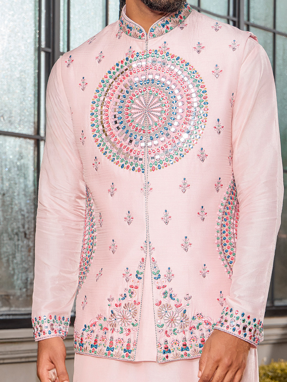 In soothing light pink soft art silk, this waistcoat set dazzles with thread, and aabla work for graceful charm. Completed with a Chinese collar and matching pants, it blends traditional craftsmanship with modern elegance, ideal for weddings, receptions, and festive occasions that demand refined style.