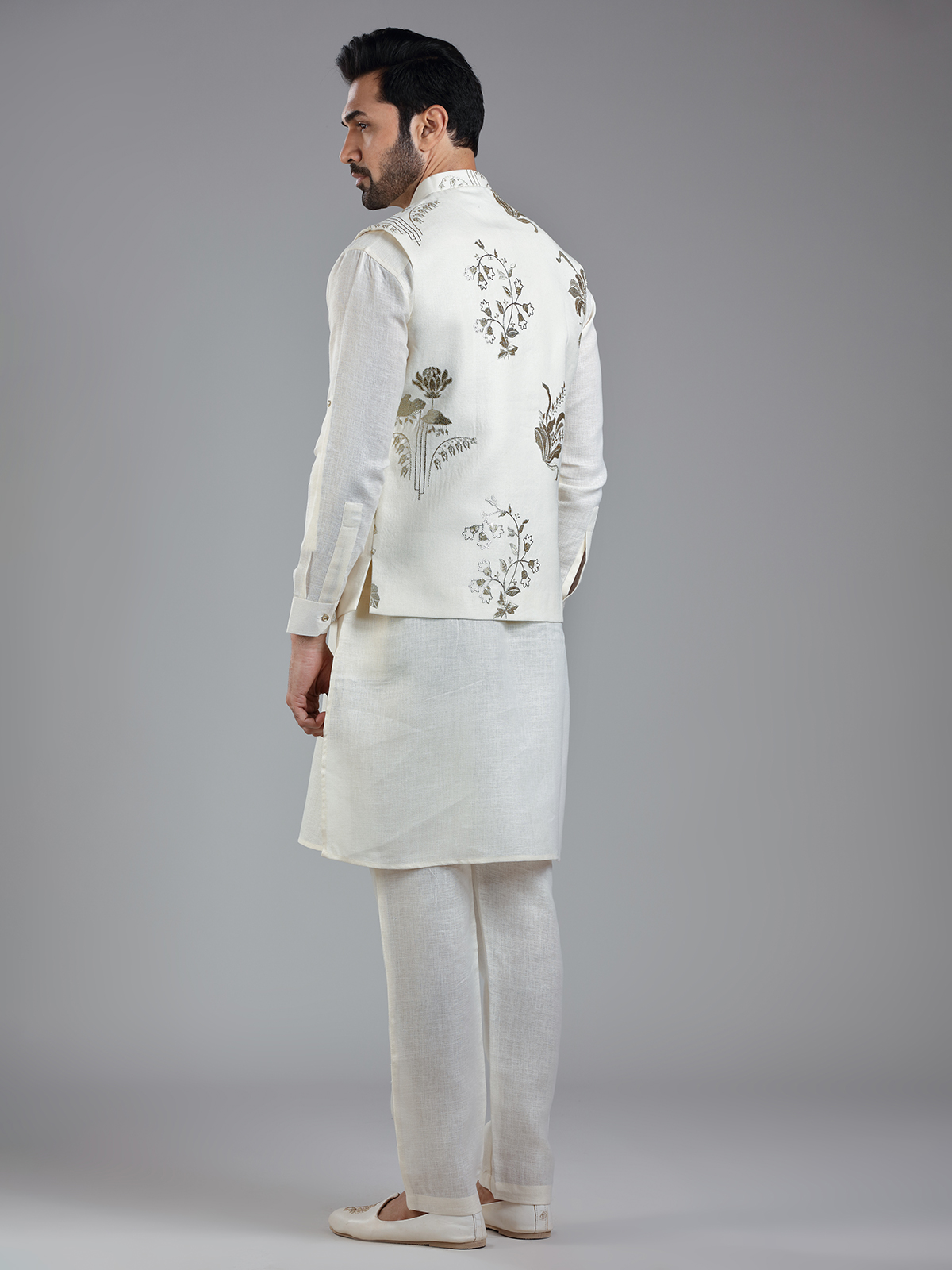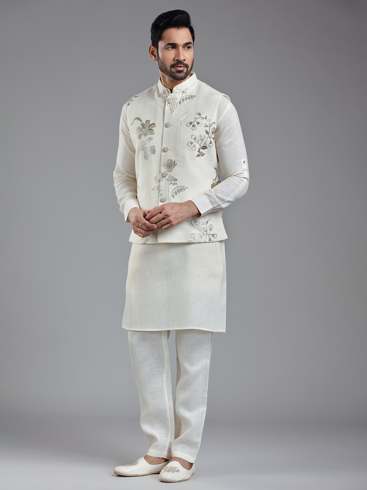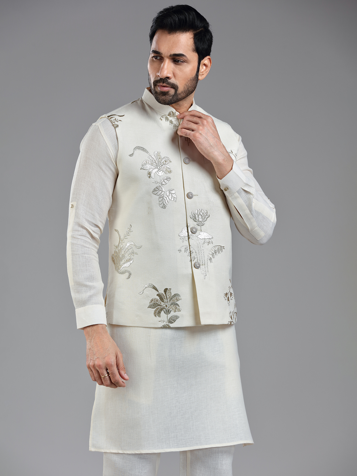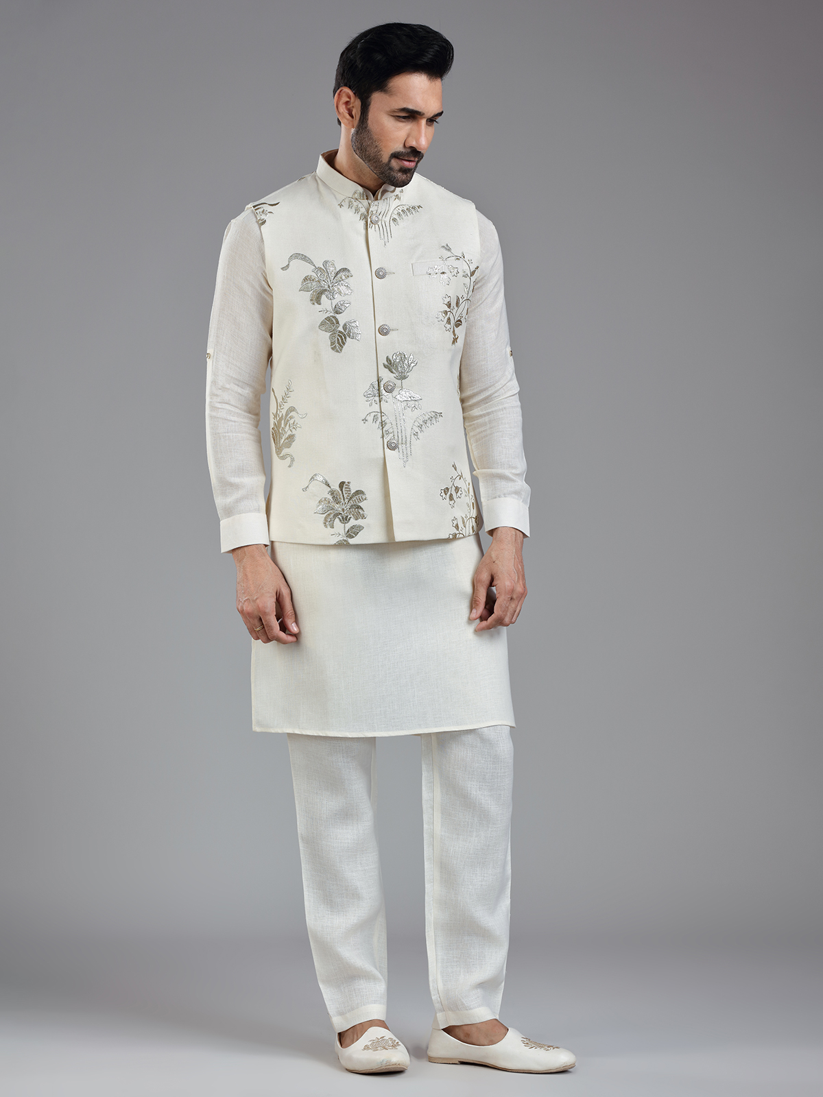 Traditional Cream Cotton Linen Kurta Jacket Set For Men