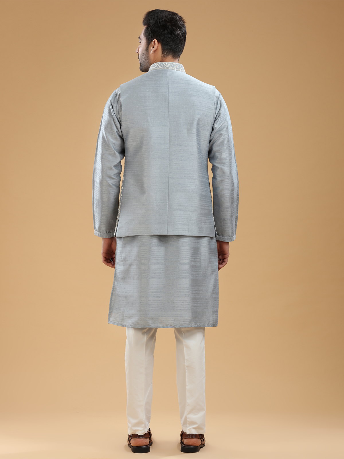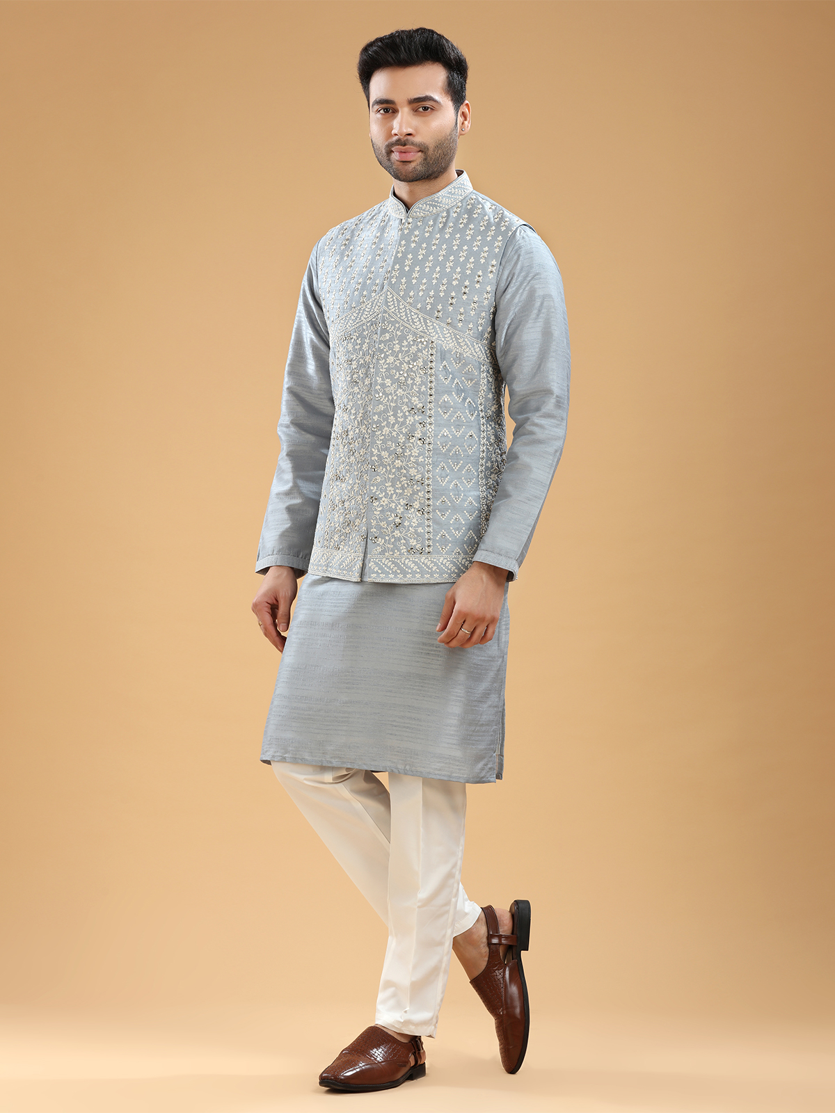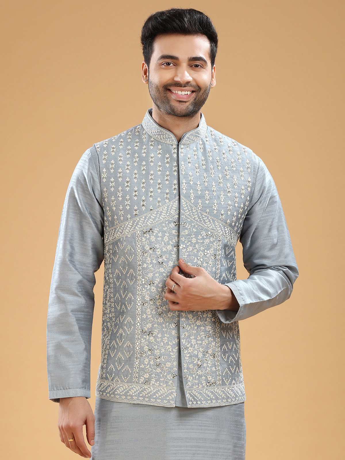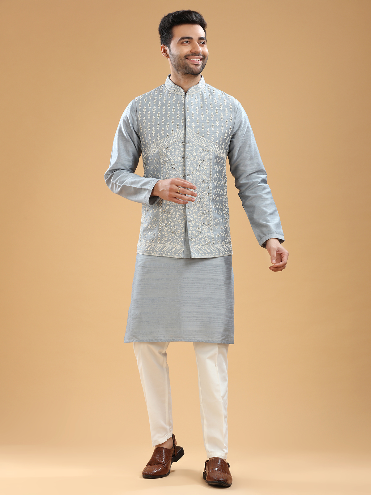 For a more traditional look, opt for our light grey silk waistcoat set that is embellished with embroidery, mirror, and zari work. This waistcoat features a mandarin collar and a sleeveless pattern, and comes with a full sleeves kurta and bottom to complete the look.