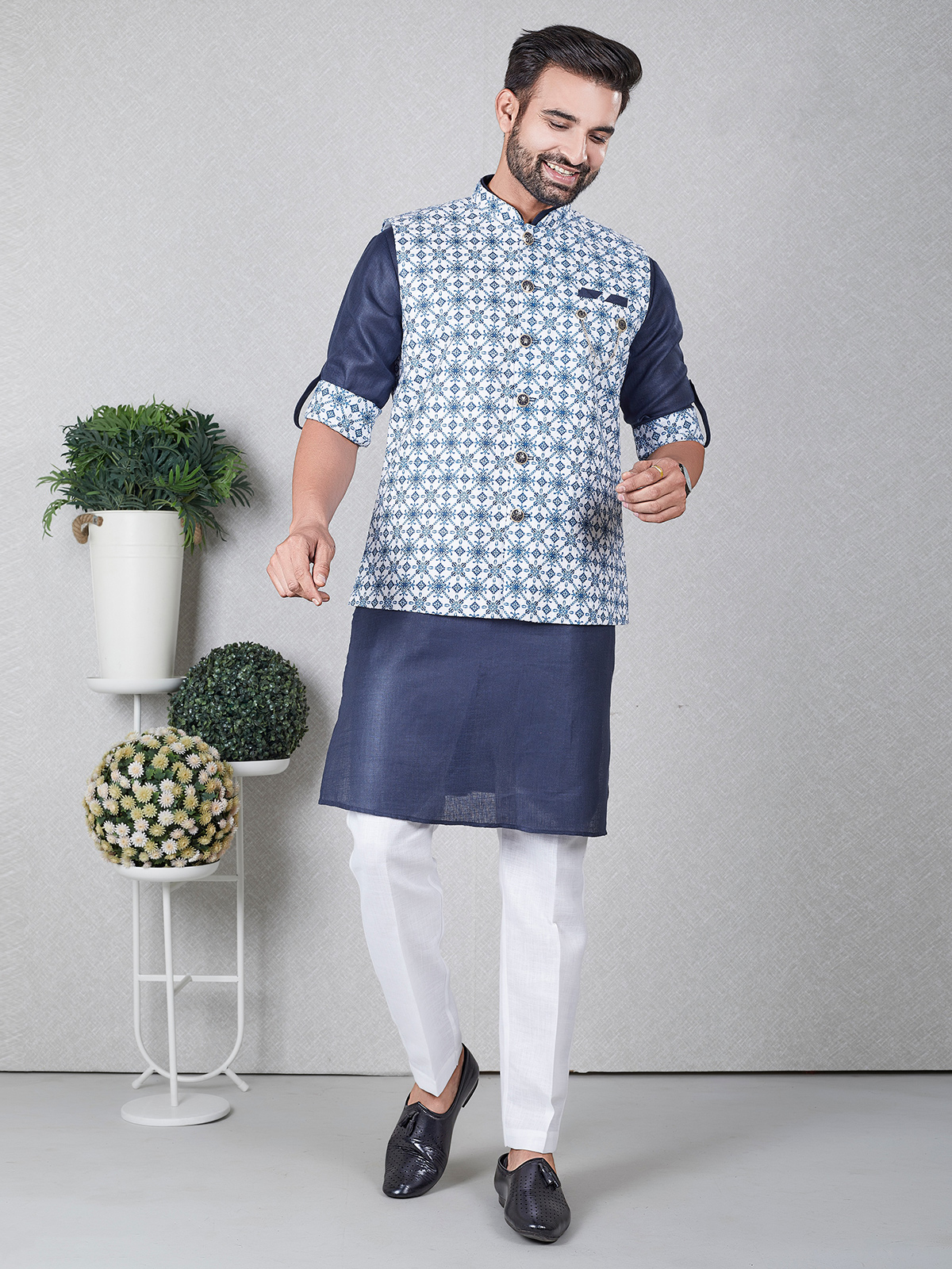 This This classy navy silk waistcoat set features an eye-catching print and embroidery work design. Comes with a bottom. navy silk waistcoat set features an eye-catching print and embroidery work design. Comes with a bottom.