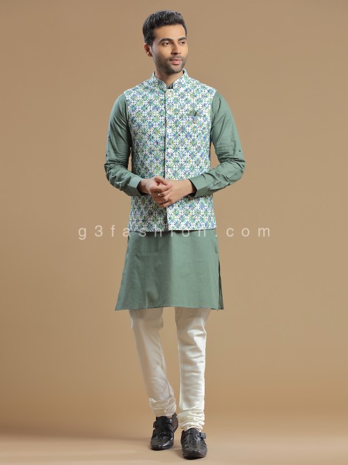Experience the latest trend in Indian ethnic wear with this trendy sage green silk waistcoat set for weddings. Adorned with embroidery and resham work all over, it features a stand collar, full sleeves, two welt pockets, full buttoned placket, and a welt pocket with pocket tie. It comes with a bottom.