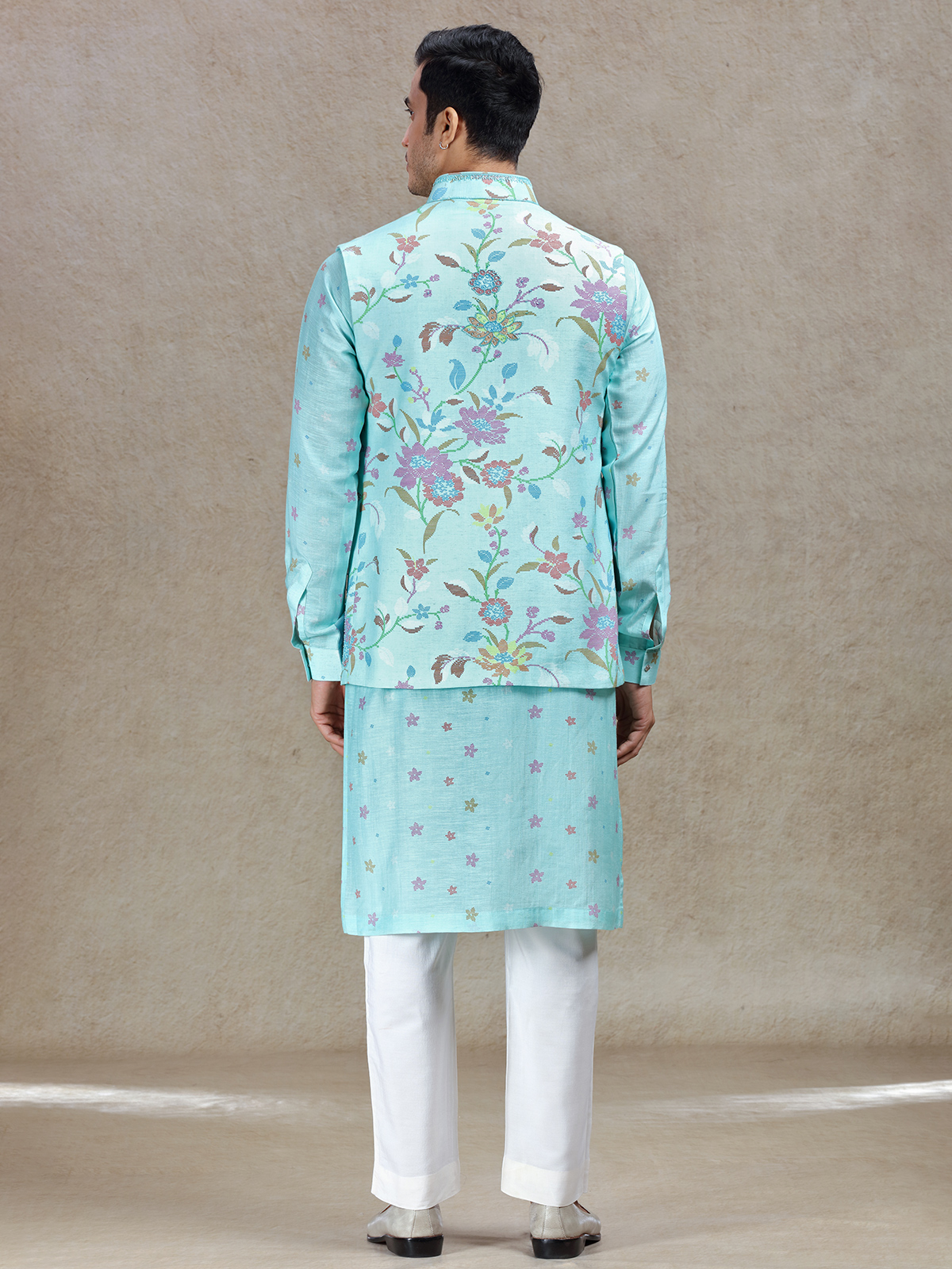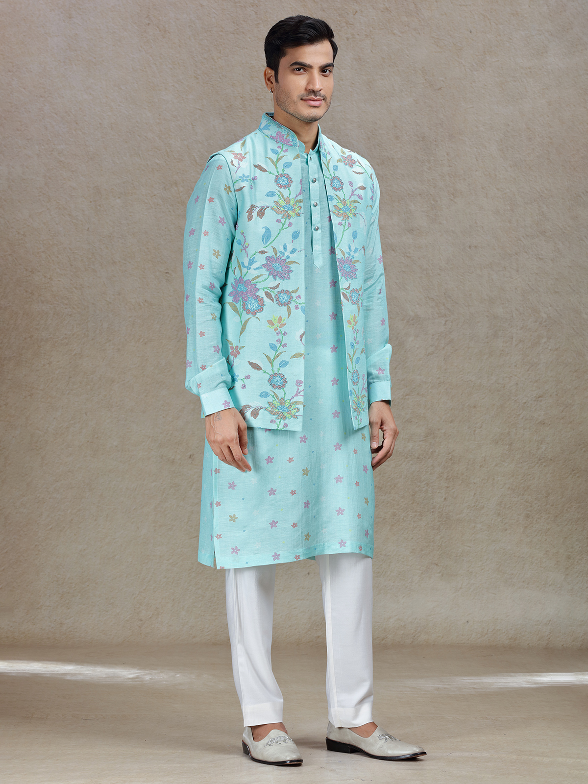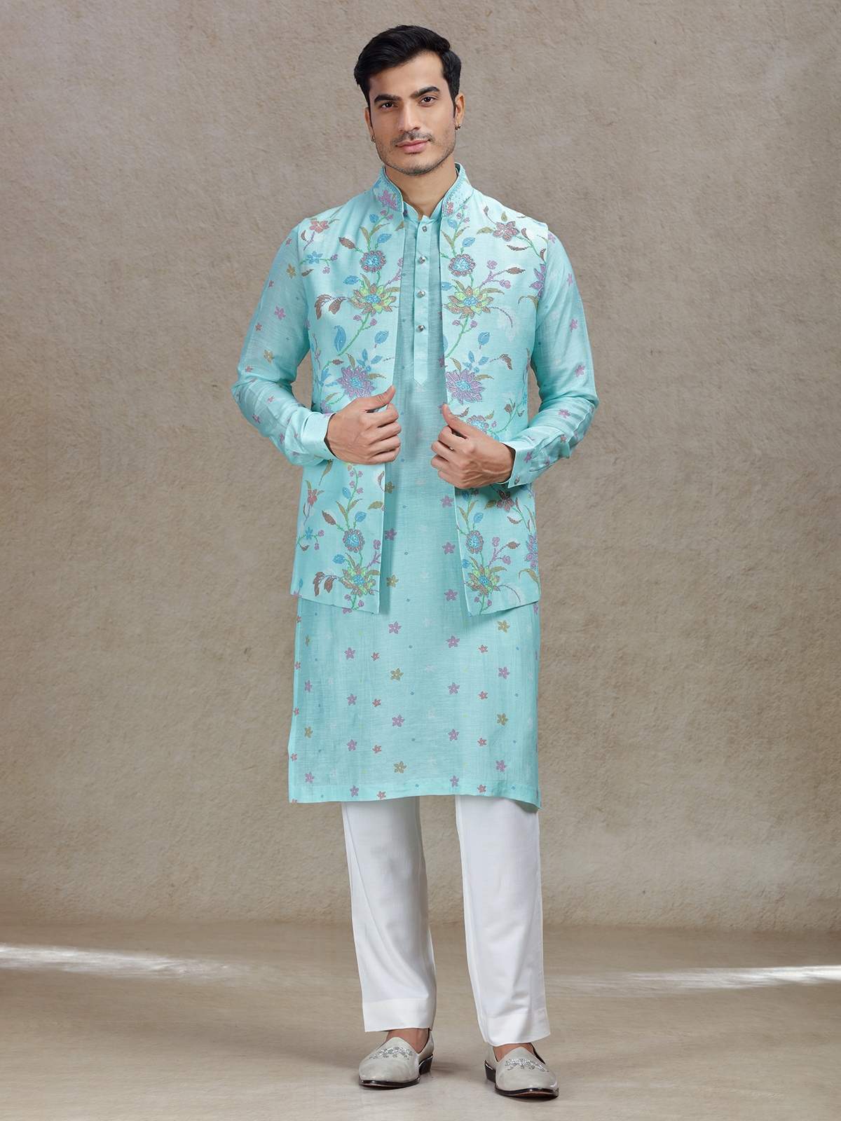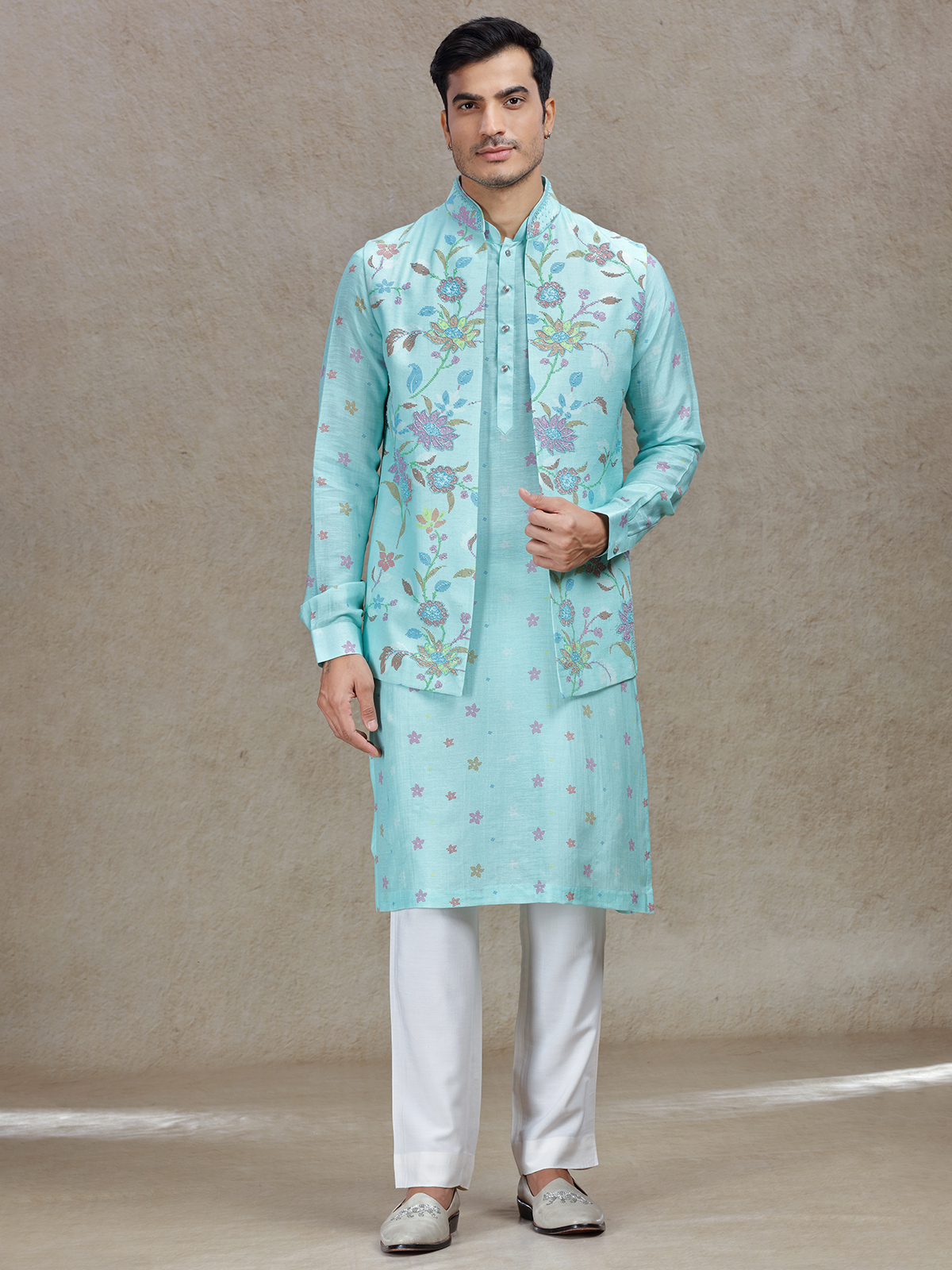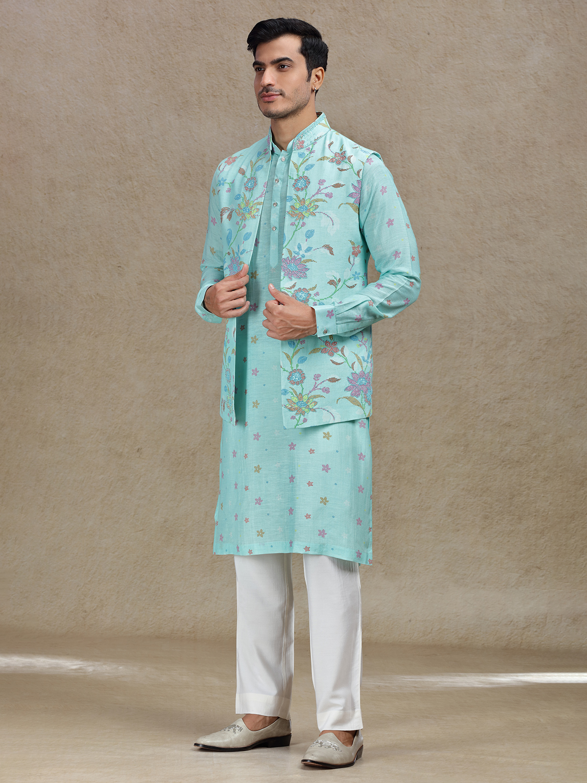 This bright Aqua waistcoat set for men is perfect for weddings and festive occasions. Made from premium linen satin silk, it showcases beautiful beads and cutdana work that is paired with a trendy printed style. The mandarin collar offers a modern silhouette, while the matching pants create a cohesive, elegant look for your celebrations.