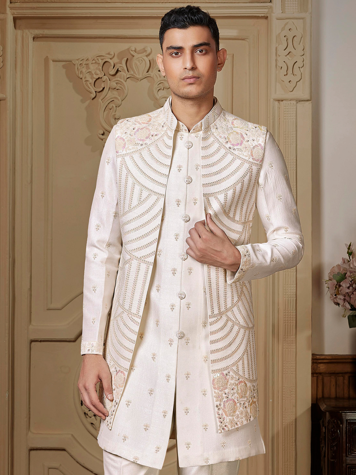 Wedding Style Ivory Raw Silk Long Kurta Jacket Set