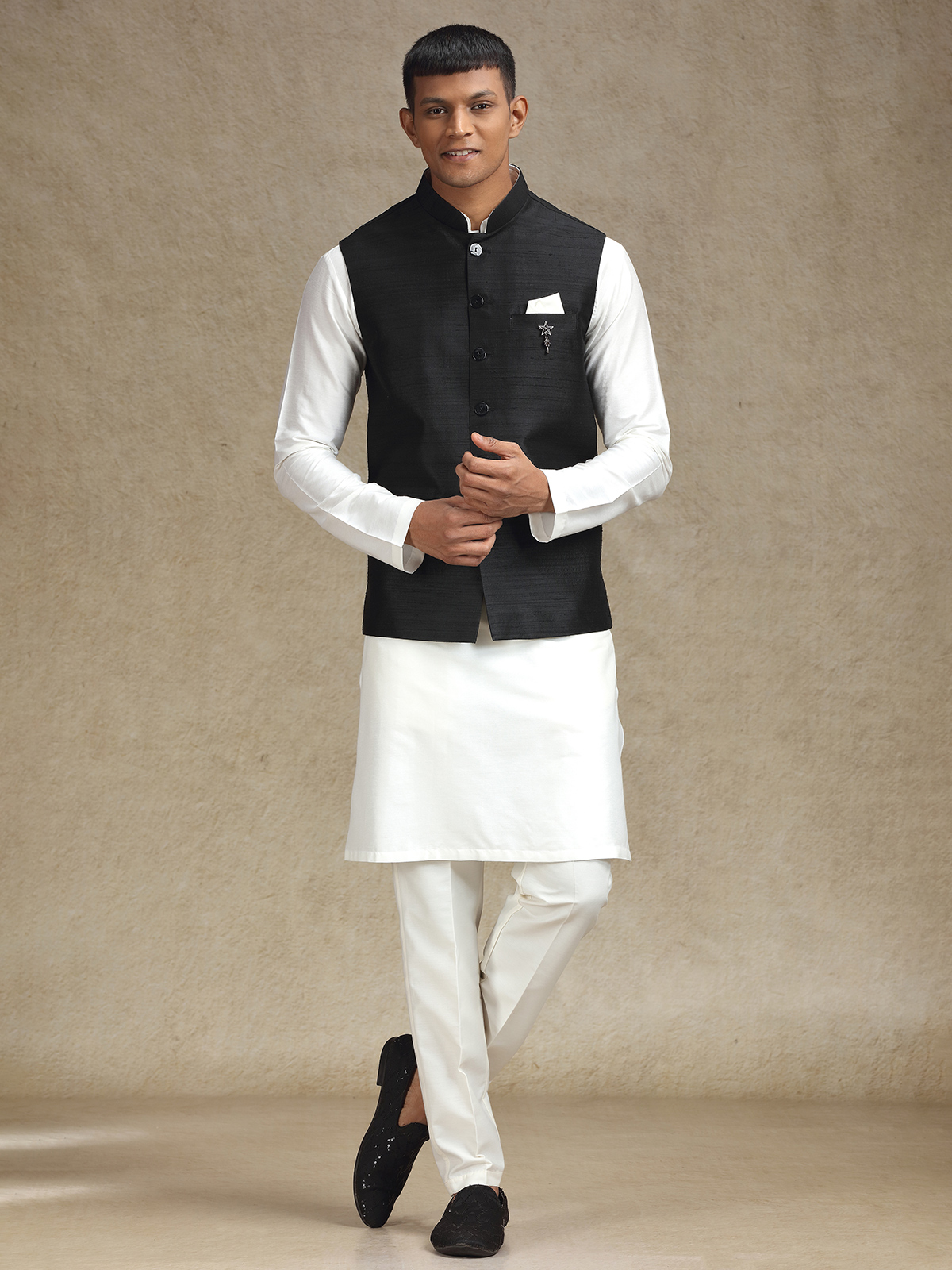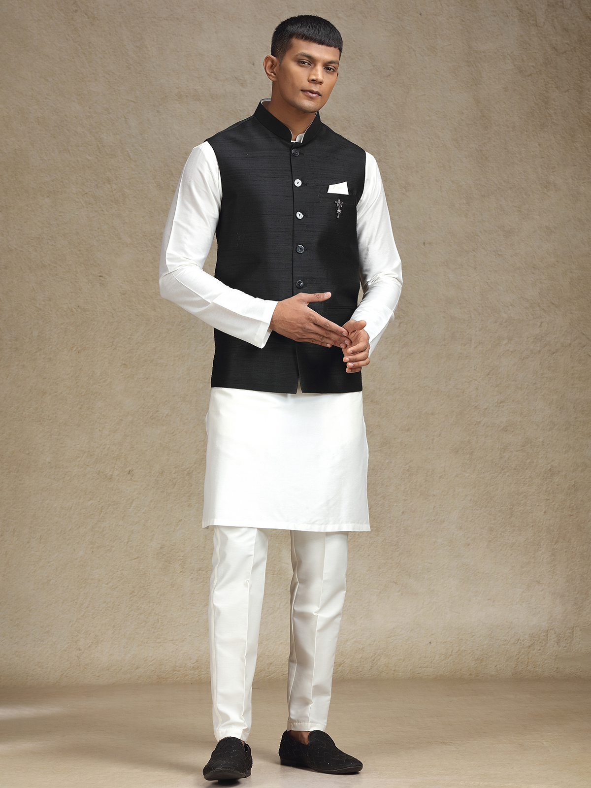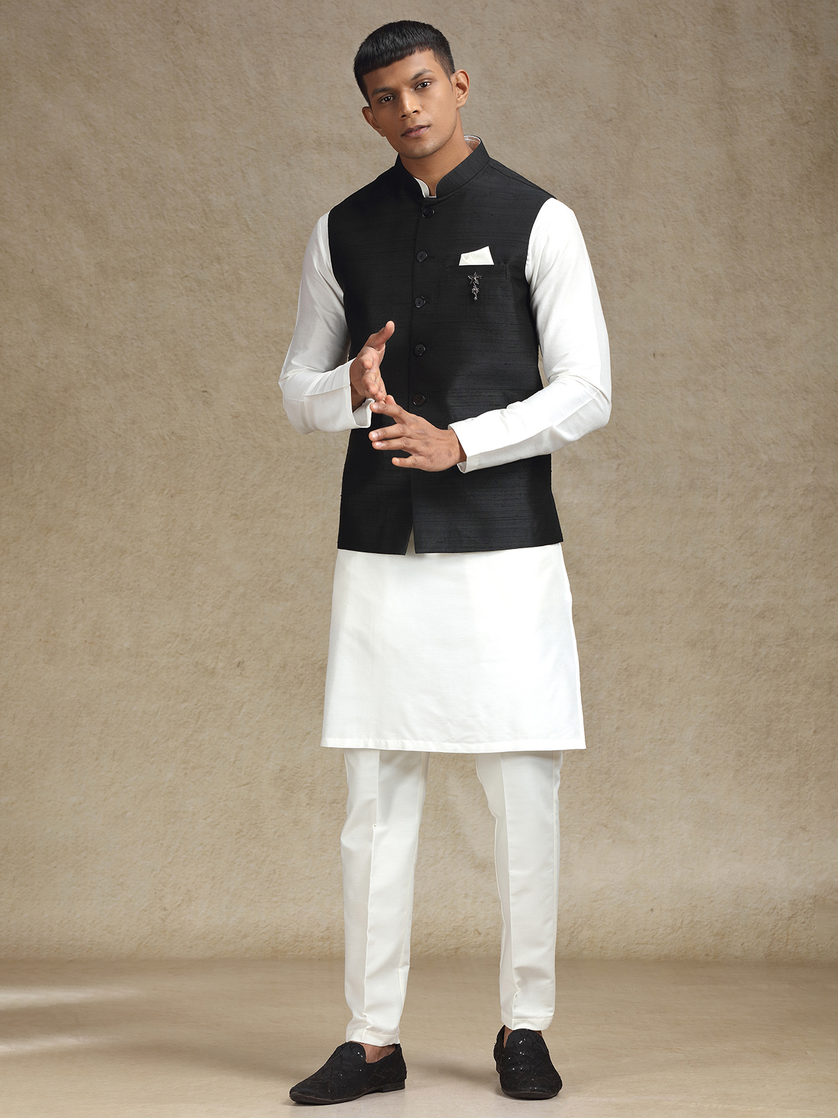This white and black cotton silk waistcoat set for men is a flawless fusion of heritage and modern style. Perfect for weddings and festive events, the mandarin collar enhances its sleek appeal, and the matching trousers complete the polished, stylish outfit.