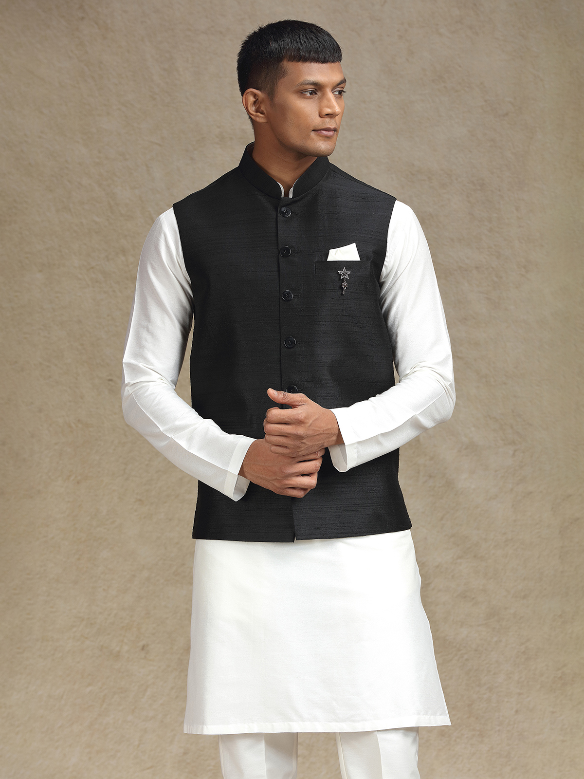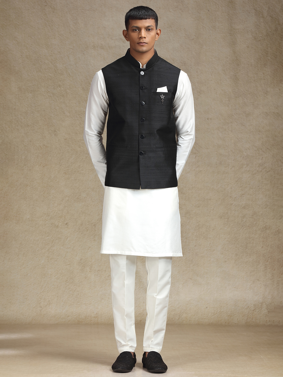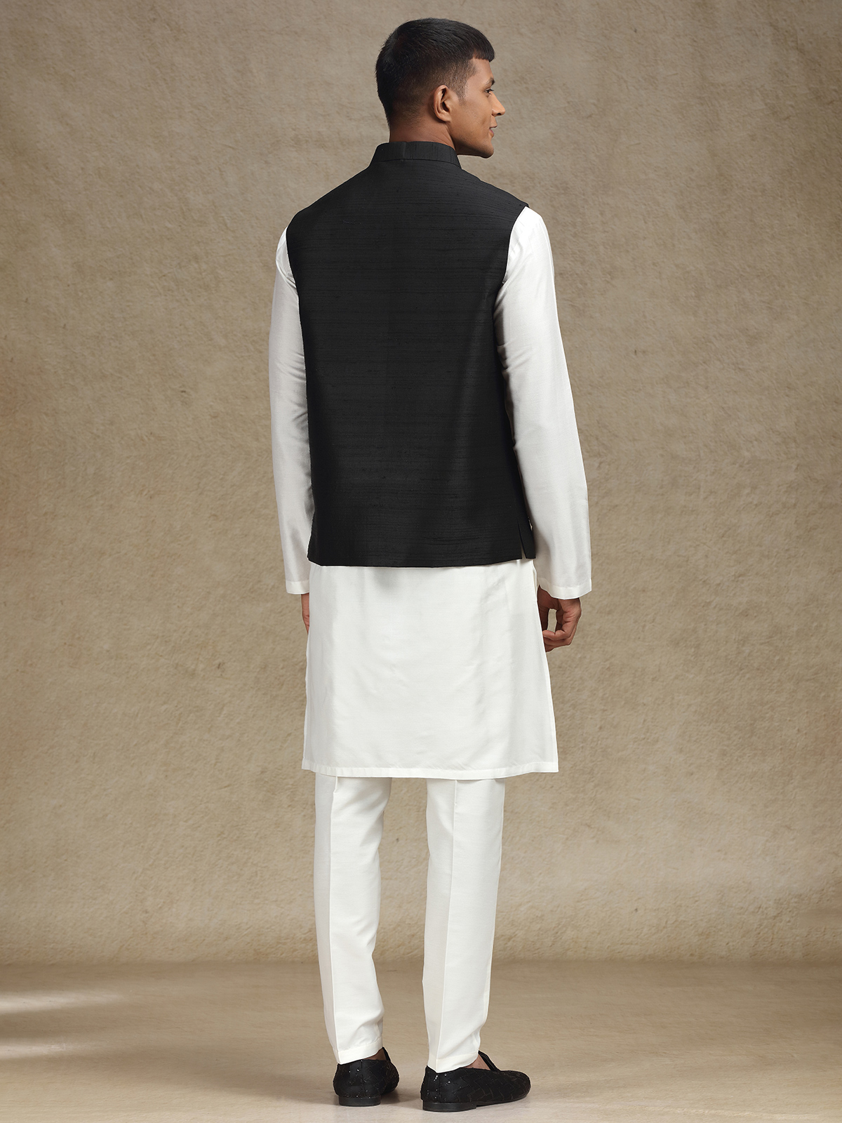 This white and black cotton silk waistcoat set for men is a flawless fusion of heritage and modern style. Perfect for weddings and festive events, the mandarin collar enhances its sleek appeal, and the matching trousers complete the polished, stylish outfit.