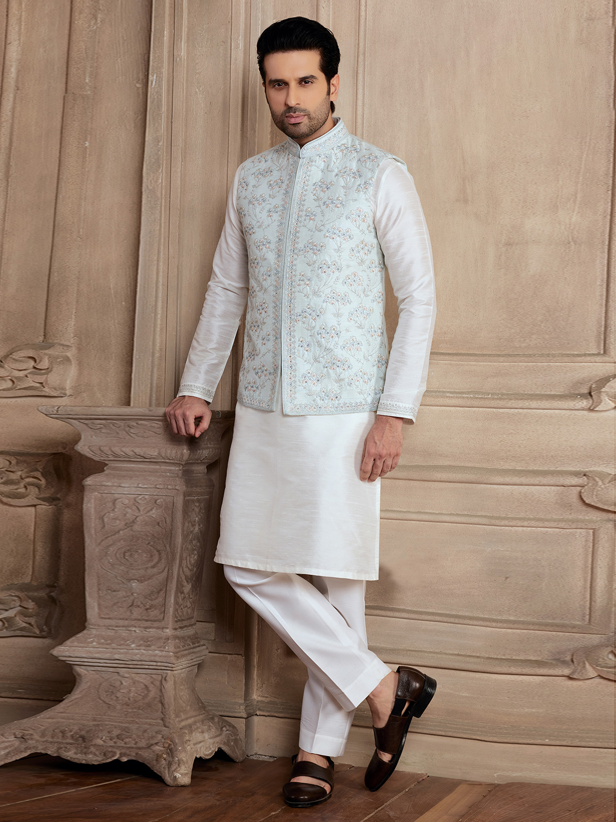 Shop for the timeless classic traditional attires fit for any and every occasion exclusively. This white and green silk waistcoat set. Embellished with embroidered, and resham work. It comes with a bottom.