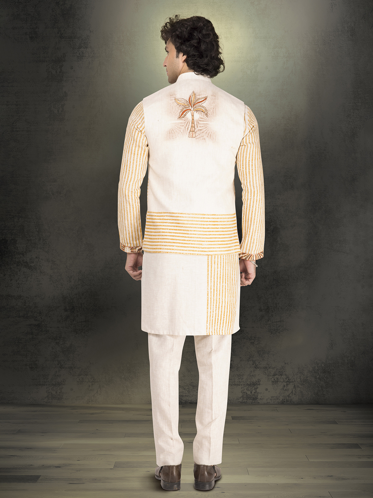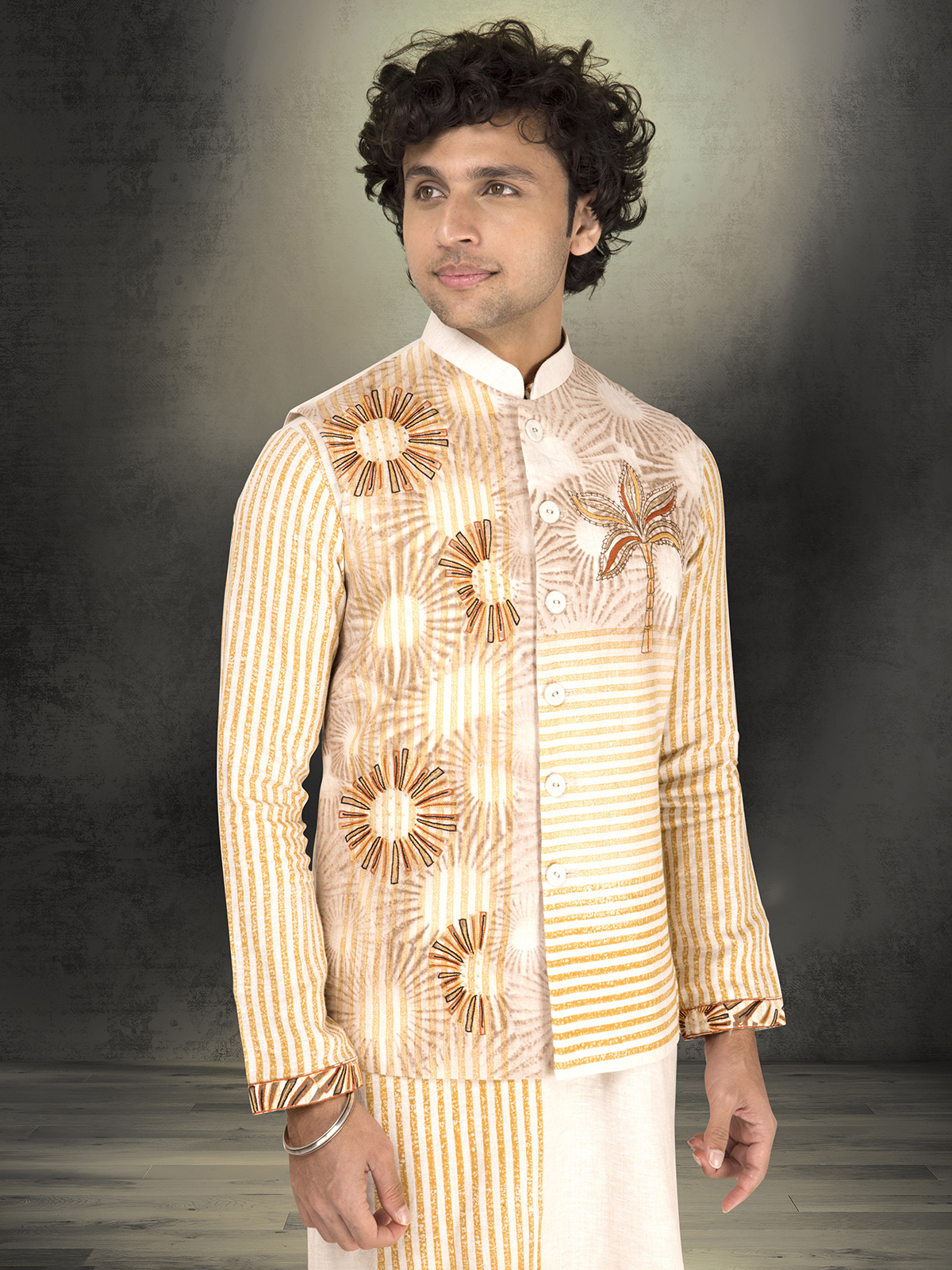 Tailored in pure linen, this dual-tone waistcoat set of white and yellow graces the occasion with elegant block prints. Its serene palette exudes freshness, making it ideal for daytime weddings. Paired with a pant, it merges comfort with artisanal beauty.
