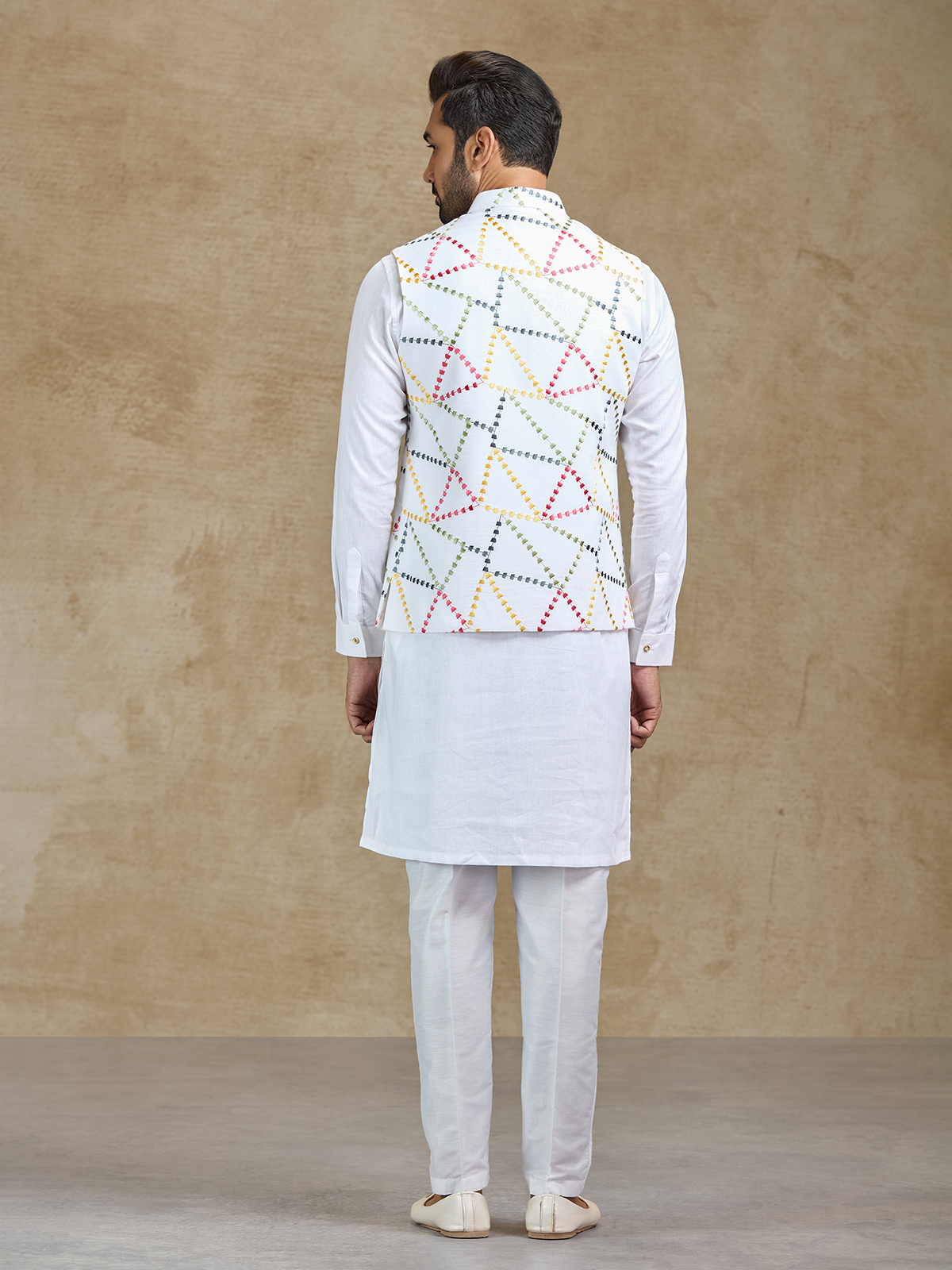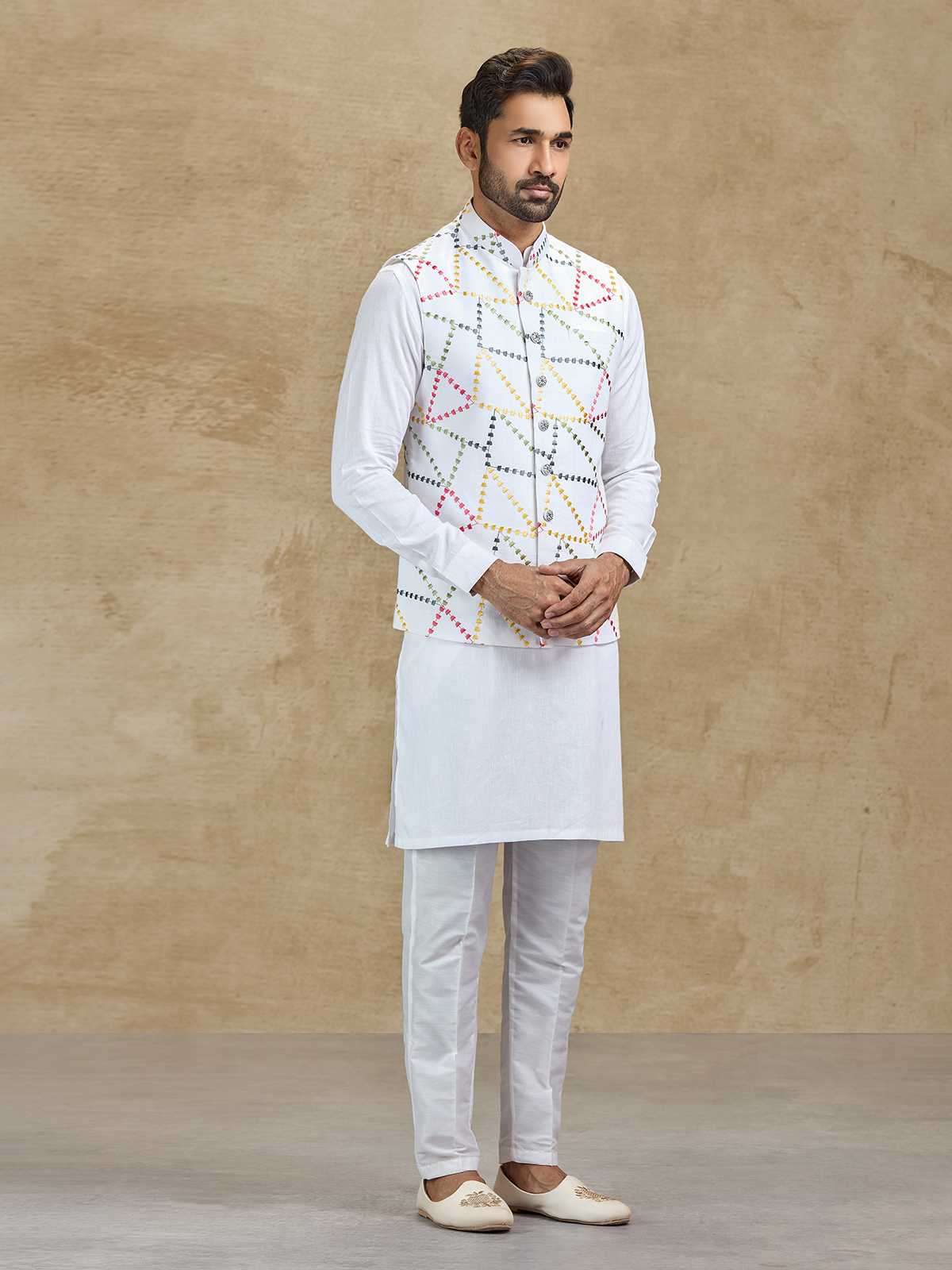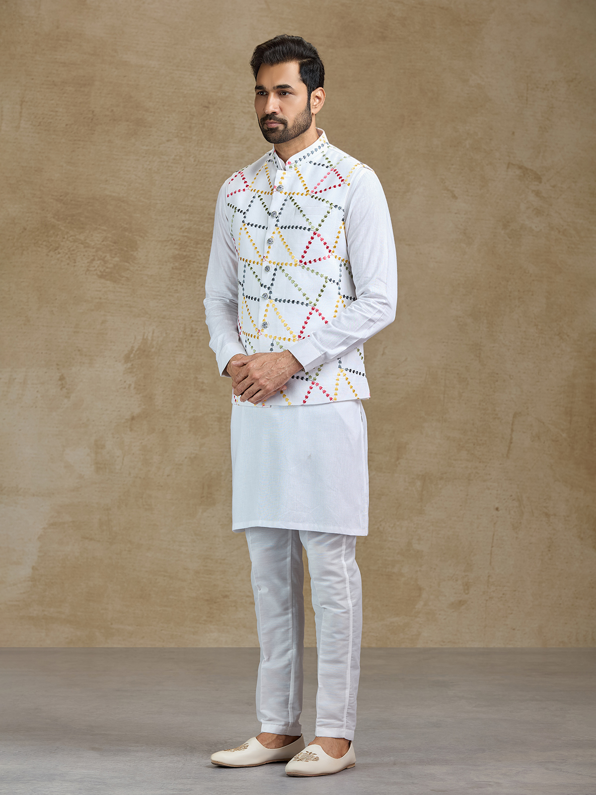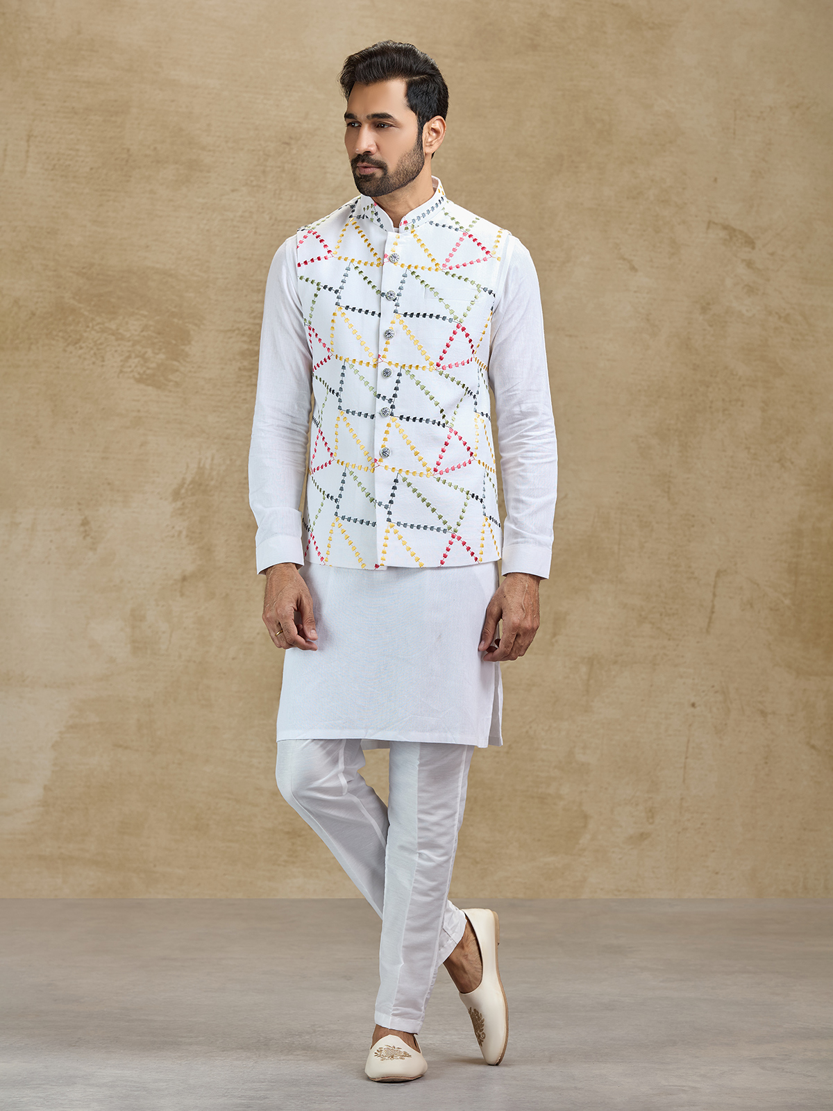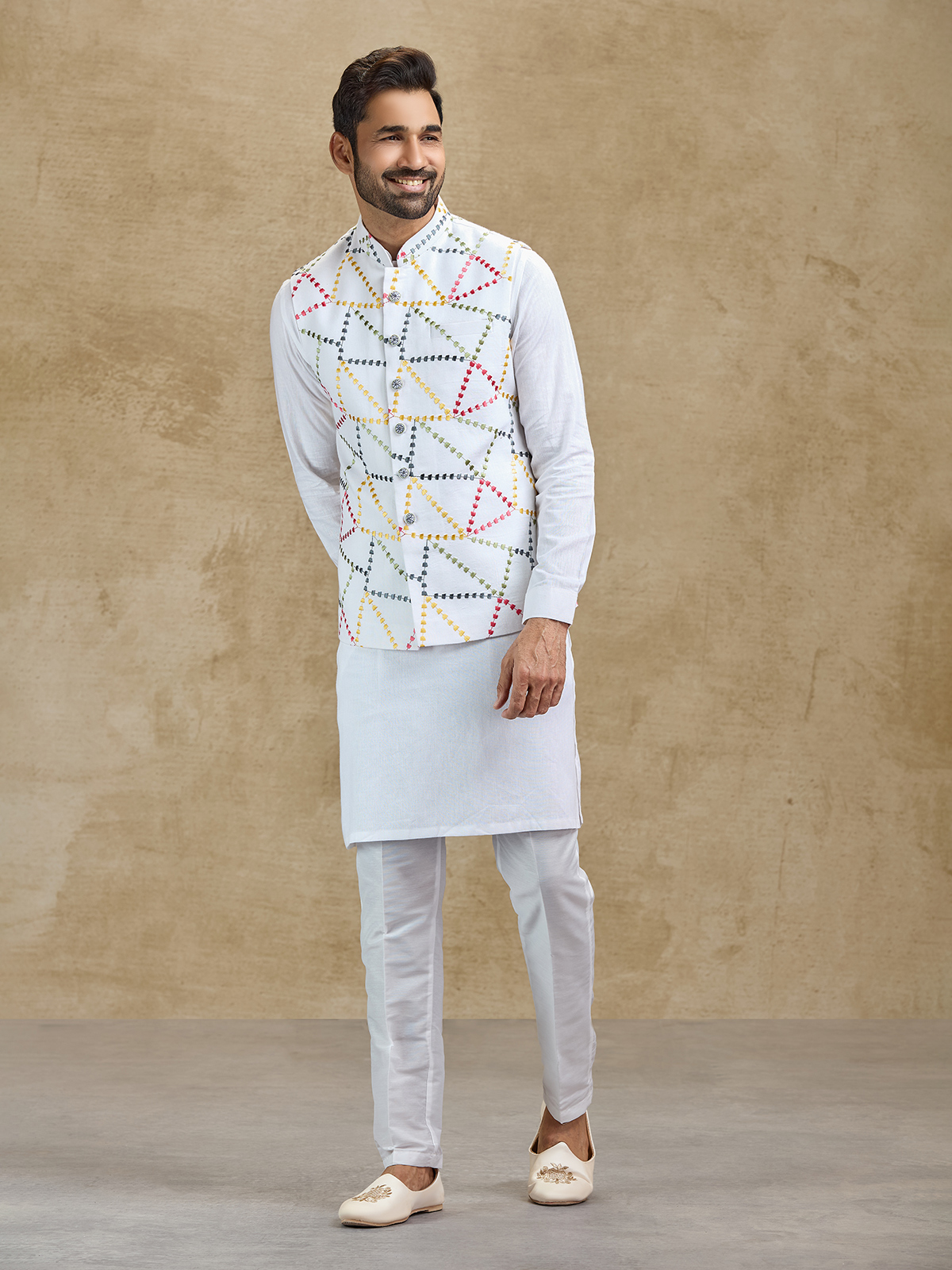 This white cotton waistcoat set offers classic charm with modern festive appeal. The waistcoat is beautifully adorned with delicate embroidery that enhances the kurta’s elegant silhouette. Paired with coordinated pants, the ensemble creates a polished ethnic outfit suitable for weddings, receptions, sangeet celebrations and festive occasions.