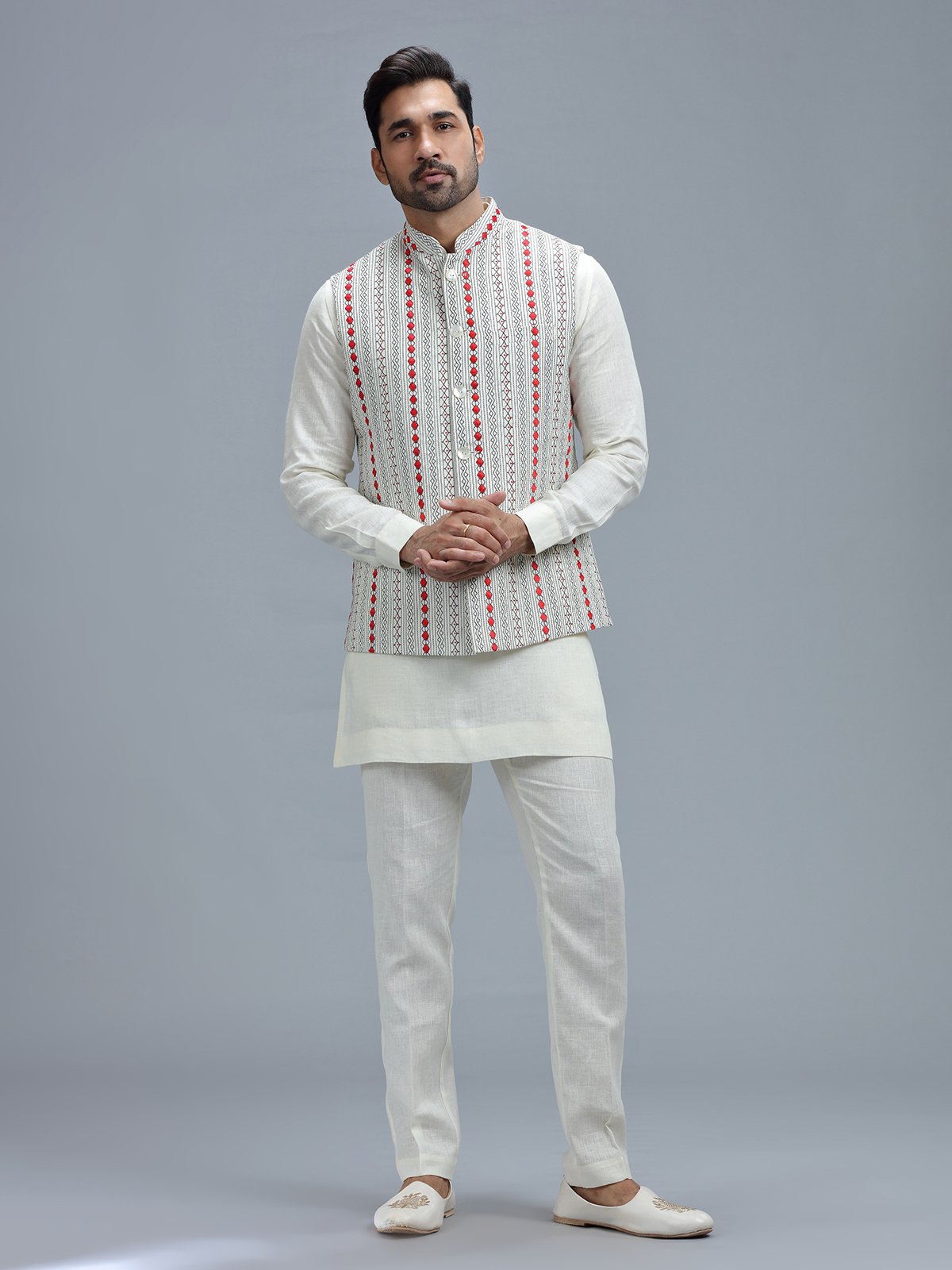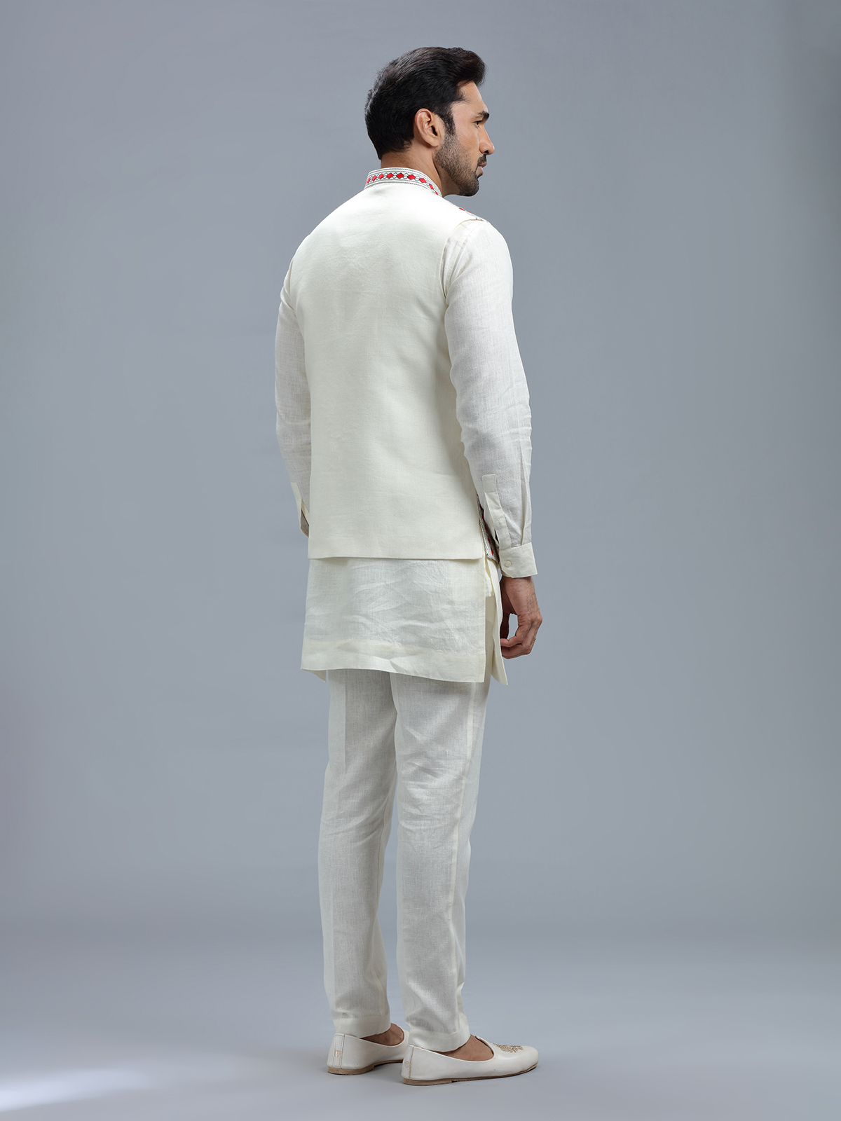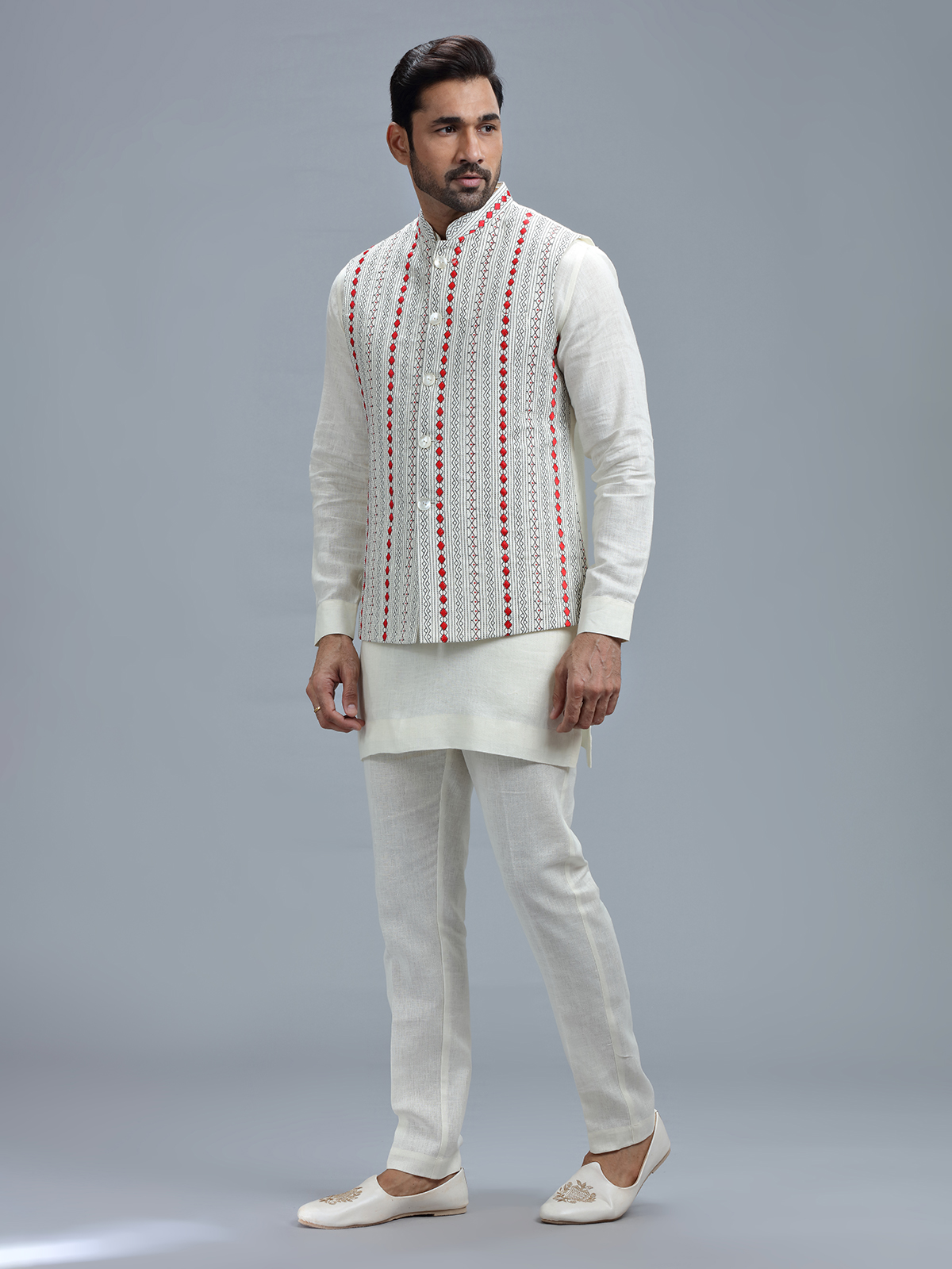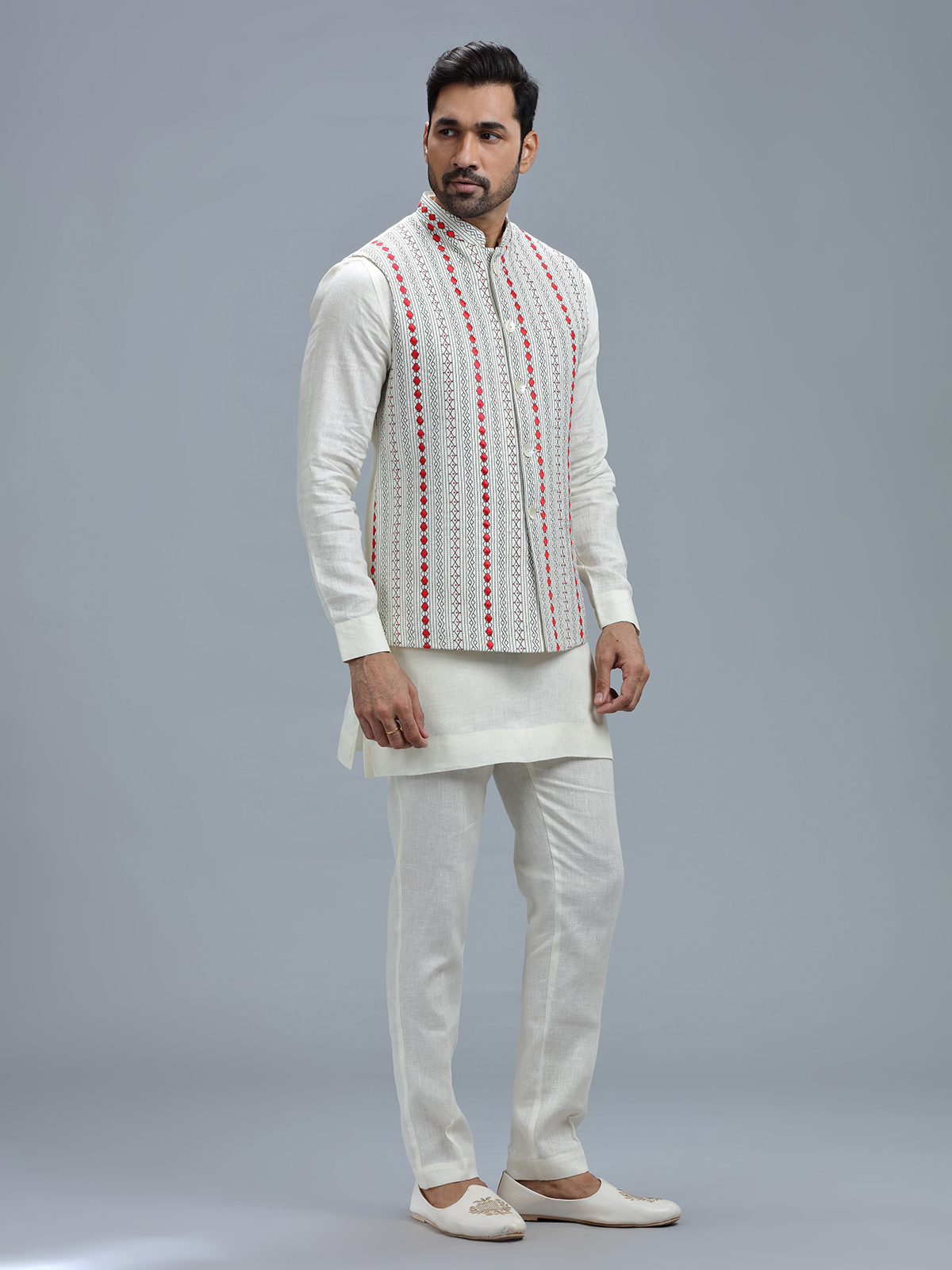 Exude timeless elegance with this white linen waistcoat set, featuring sophisticated embroidery work, accompanied by a bottom.