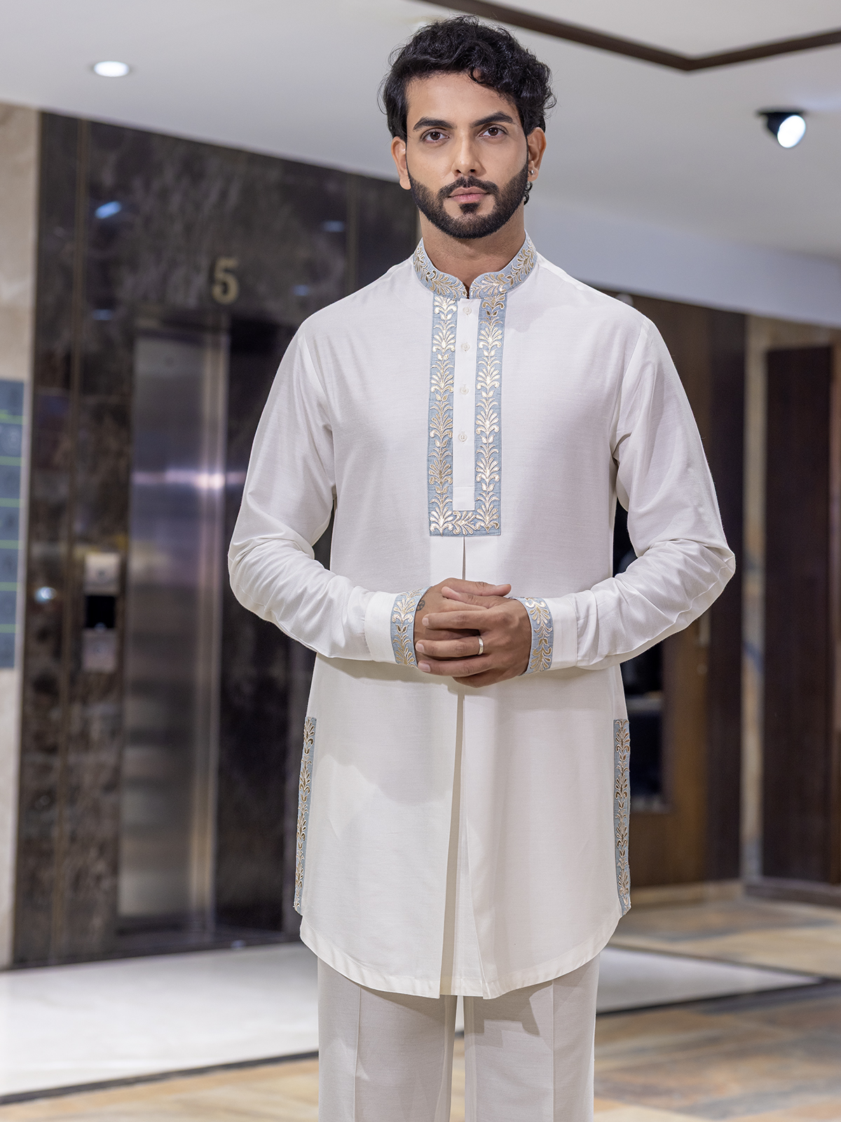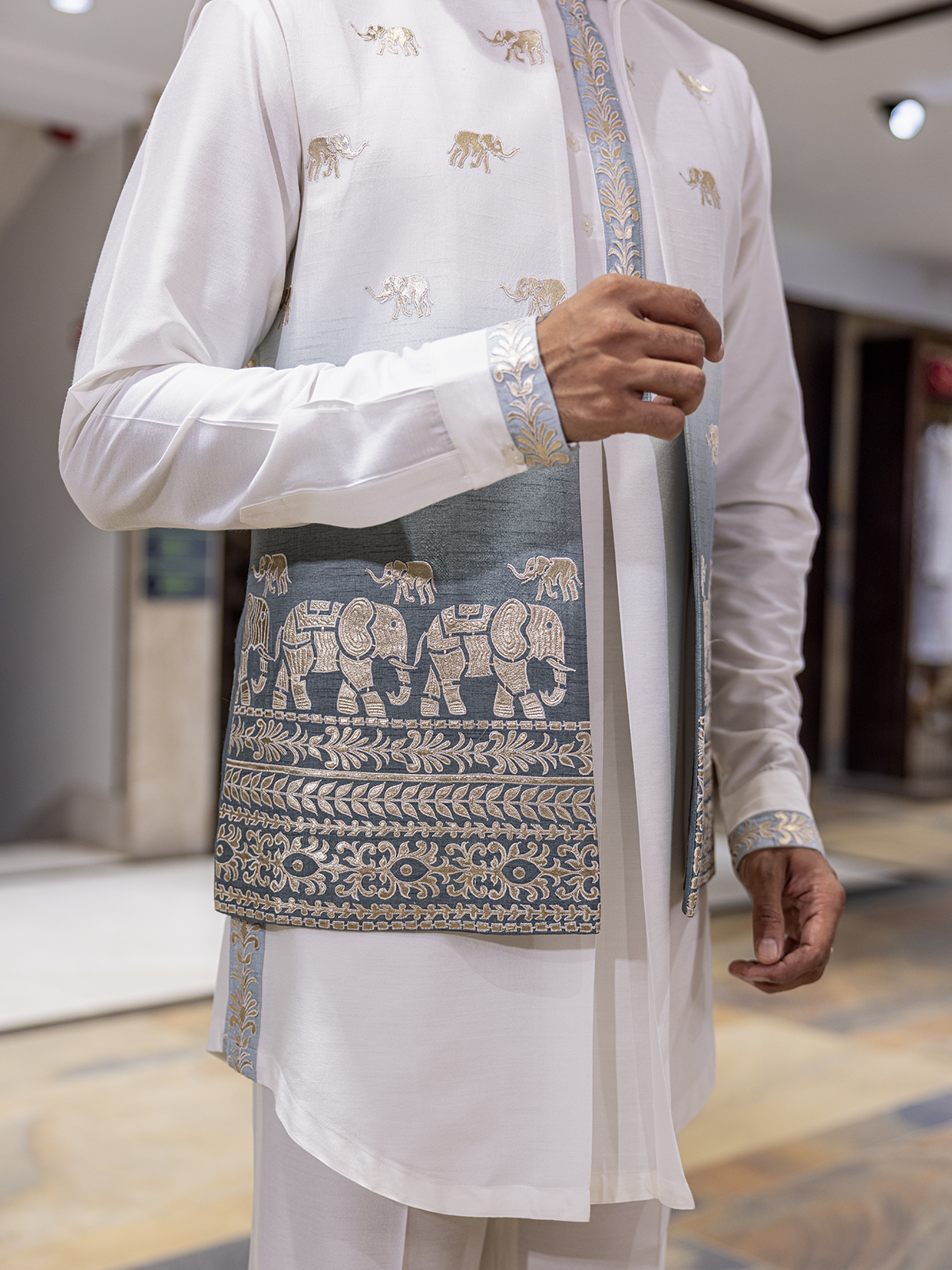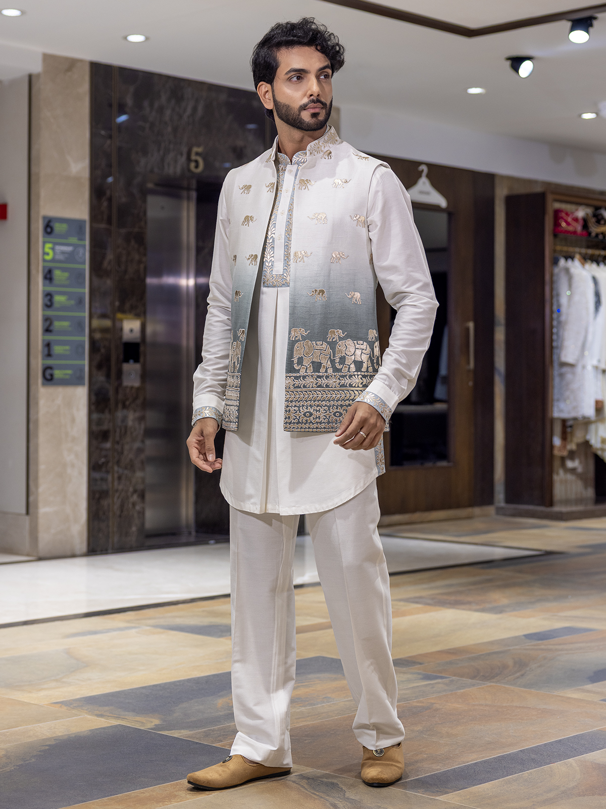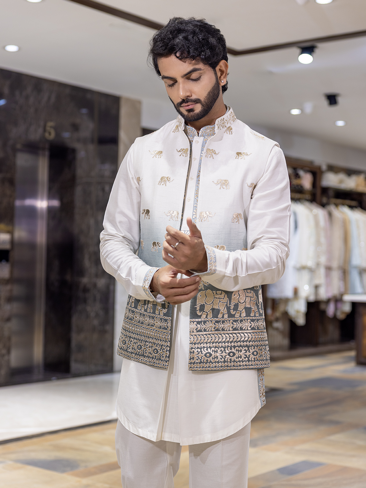 Bask in refined elegance with this shaded white silk waistcoat set, radiating subtle sophistication. The sleeveless shaded waistcoat features delicate embroidery that adds a soft gleam of artistry, paired with a mandarin-collar kurta. Finished with tailored pants, crafted for festive moments touched with grace and grandeur.