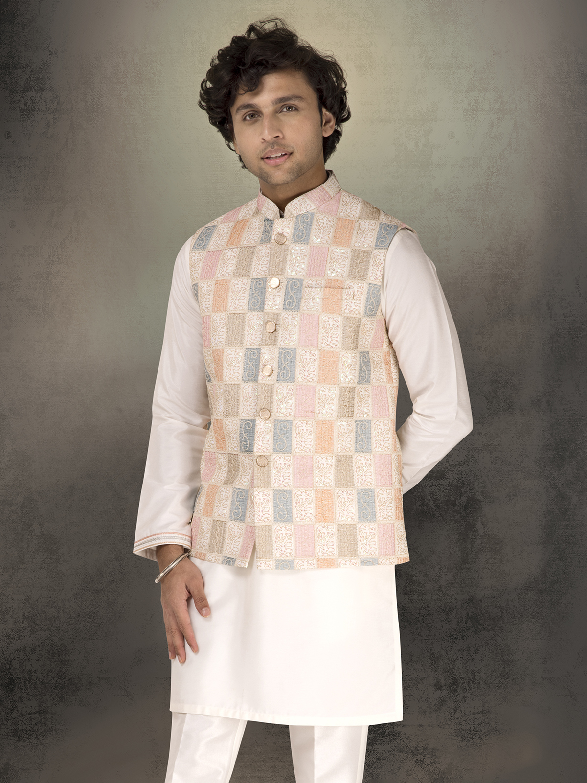 White silk finds modern poetry in this printed waistcoat set embellished with thread and sequins. The luminous tone adds festive charm and quiet sophistication. Teamed with a pant, it’s perfect for weddings, receptions, or celebrations of grace.