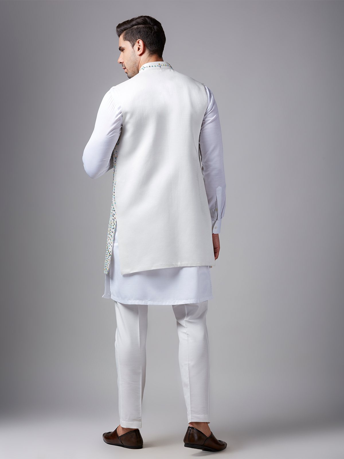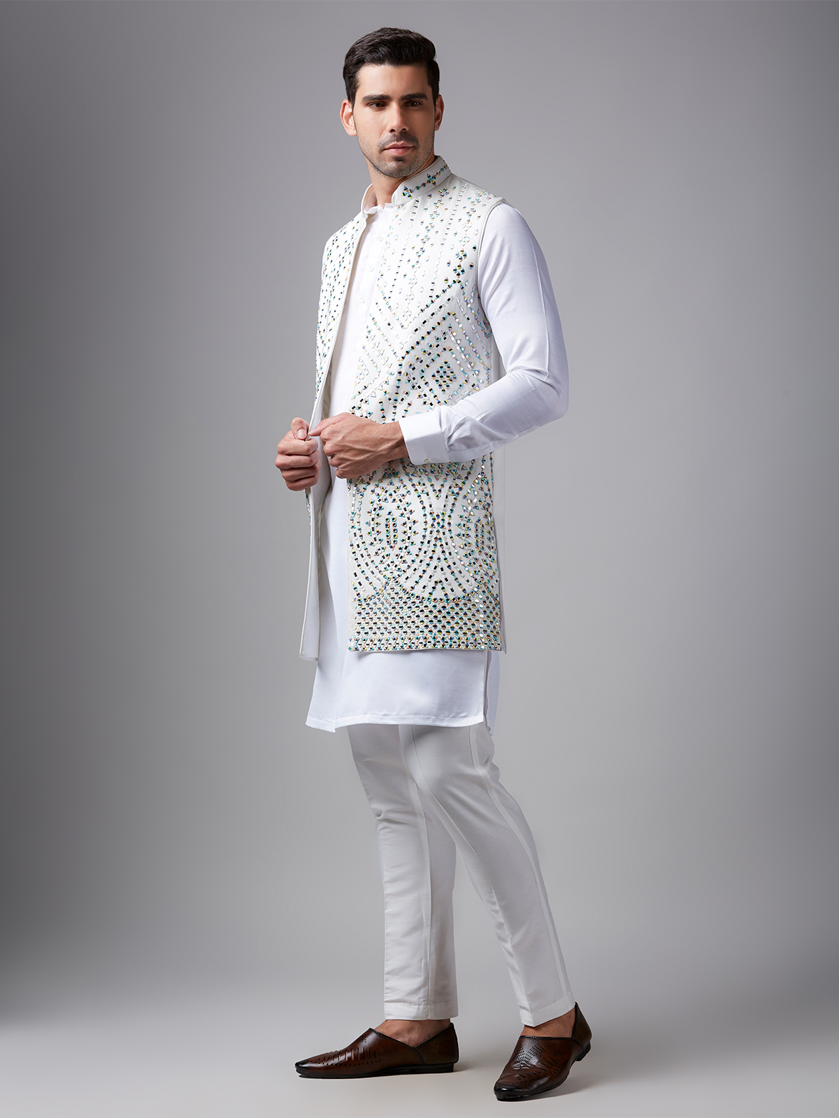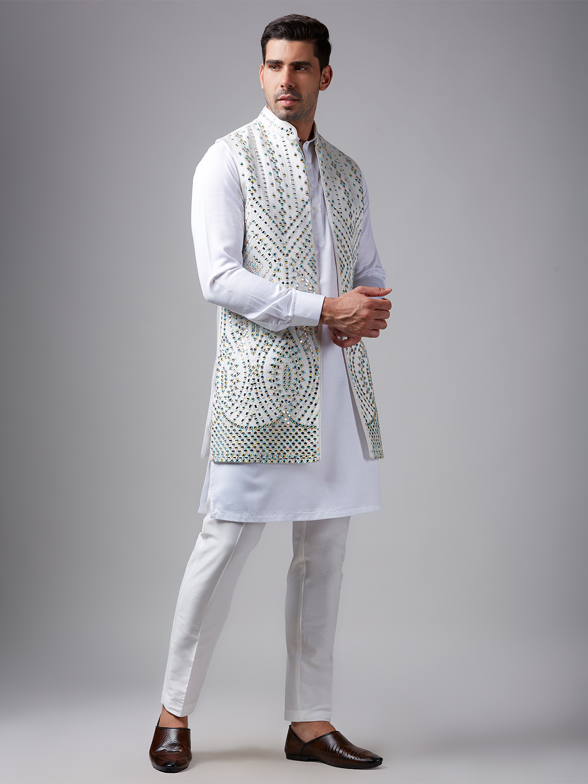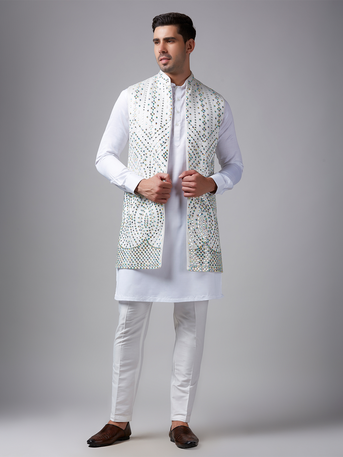 Embrace joy and elegance with this white waistcoat set crafted from superb silk. The mirror and resham work designs add a touch of sophistication to your look. Comes with a bottom.