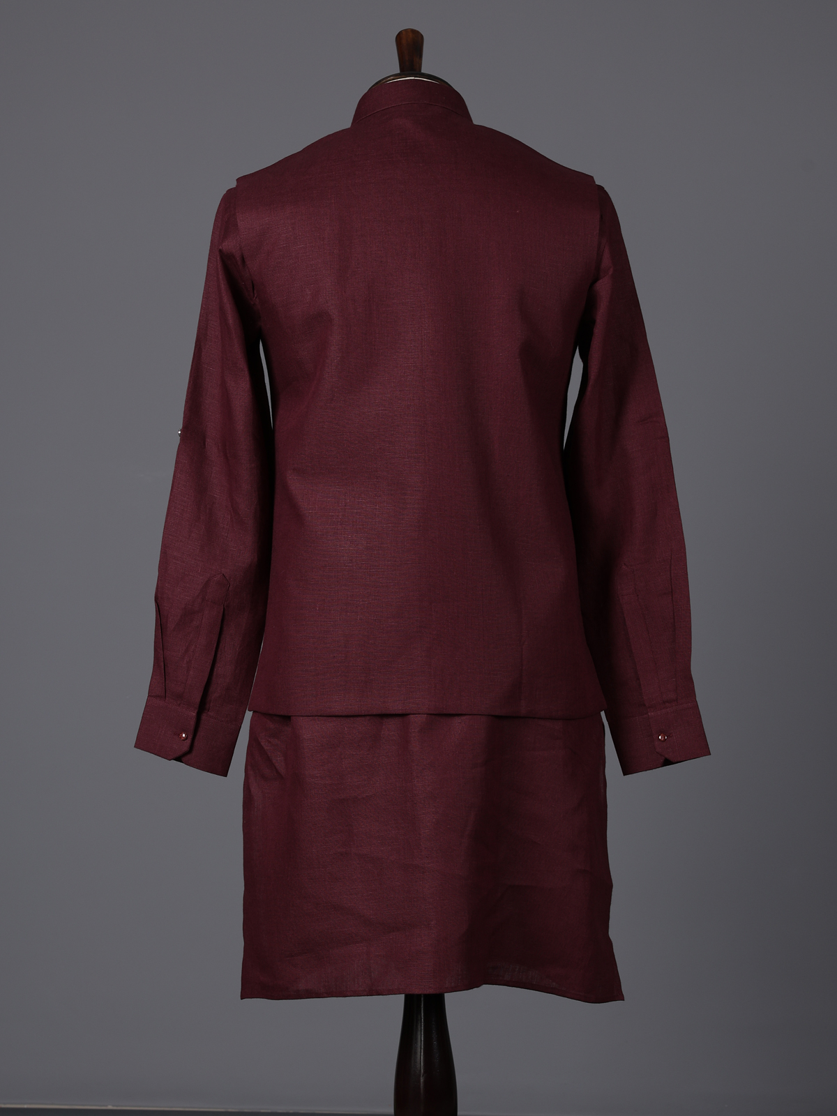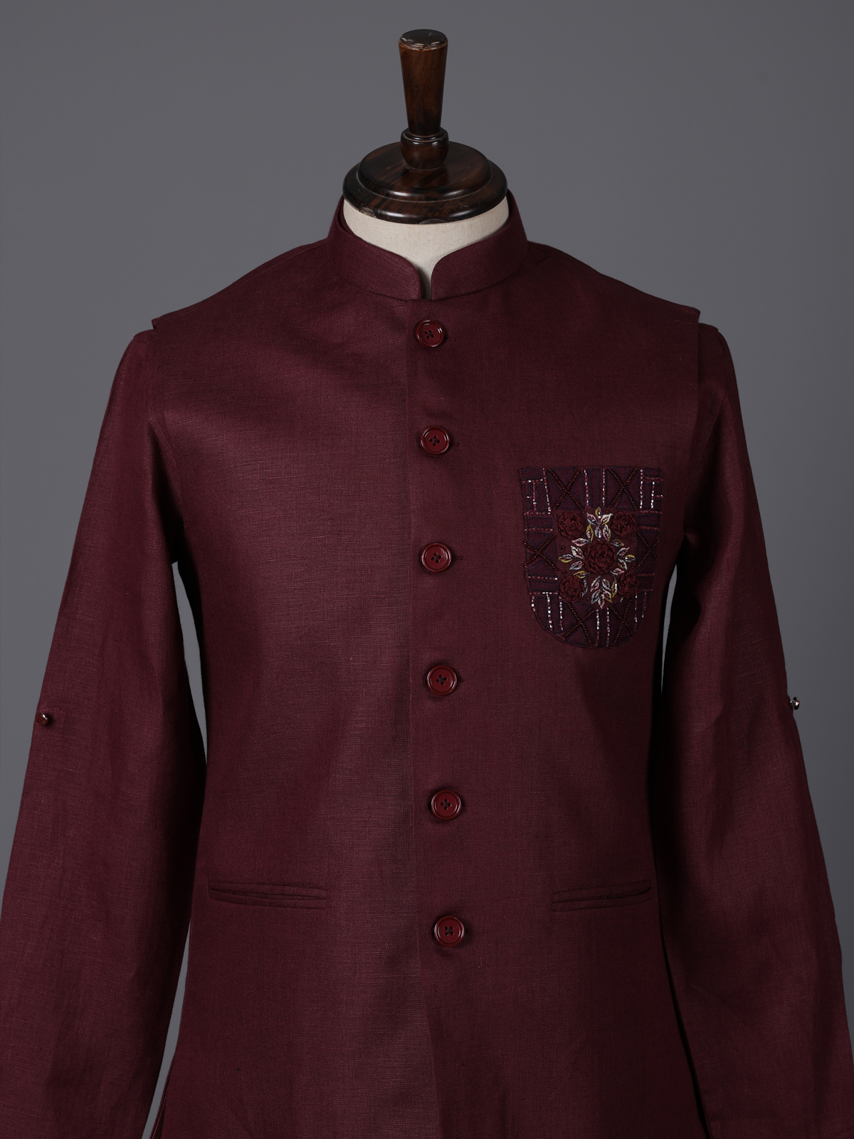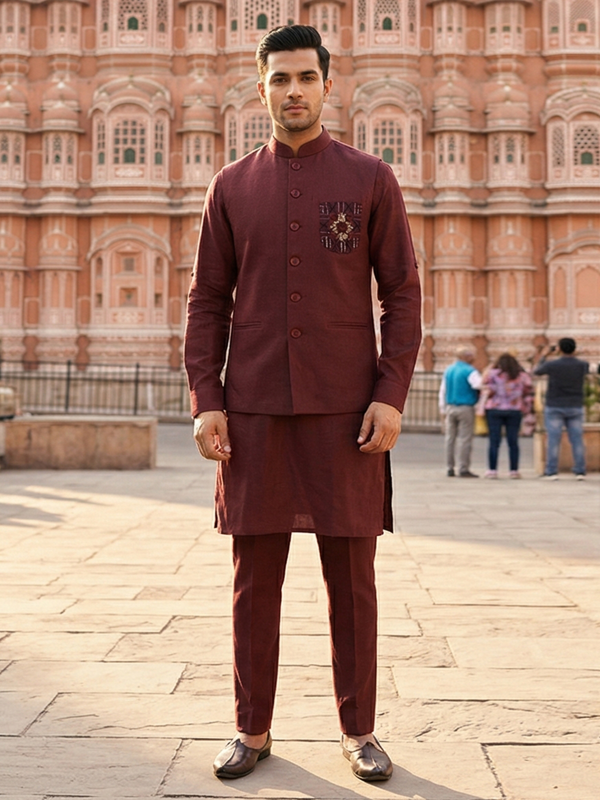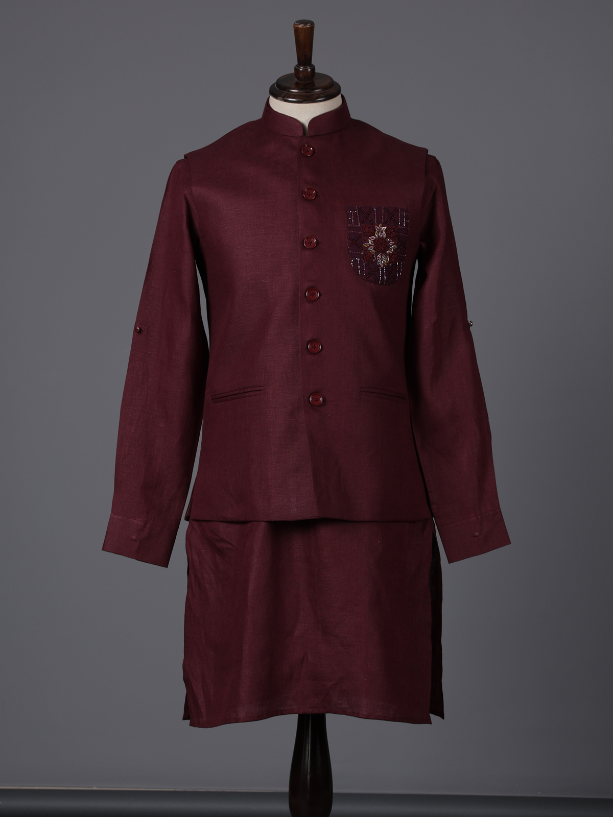 Deep wine hues bring a touch of regal elegance to this cotton blend waistcoat set crafted for special occasions. Enhanced with cutdana, thread and bead embellishments on the pocket, it reflects subtle luxury. The mandarin collar adds a sharp finish, while the smooth fabric ensures ease. Styled with kurta and pants, this ensemble suits weddings, receptions and festive moments beautifully.