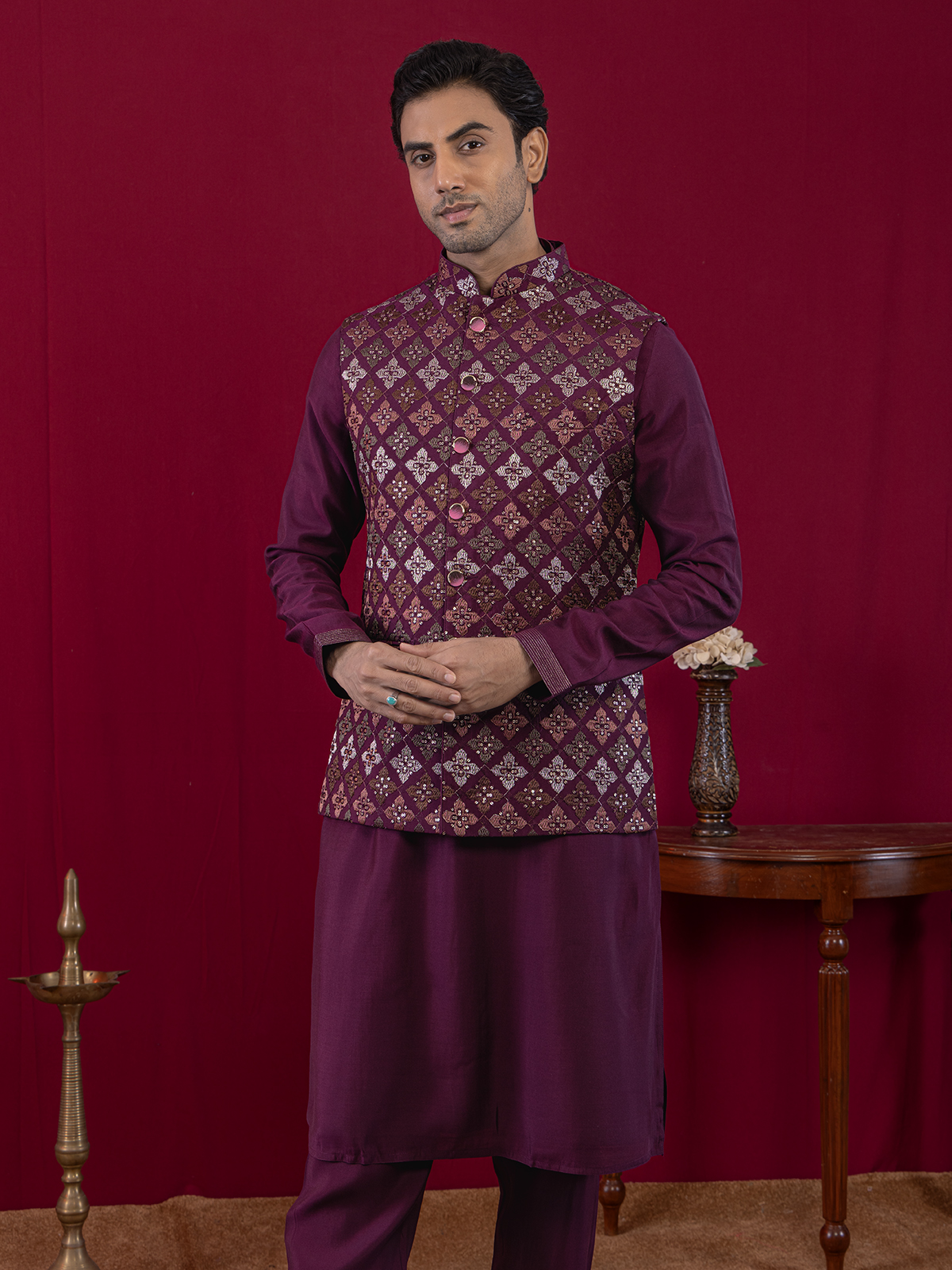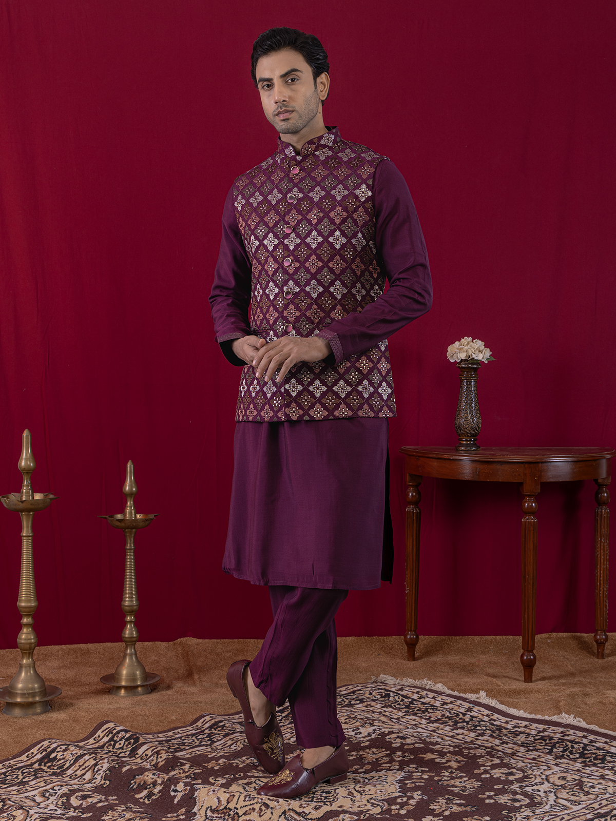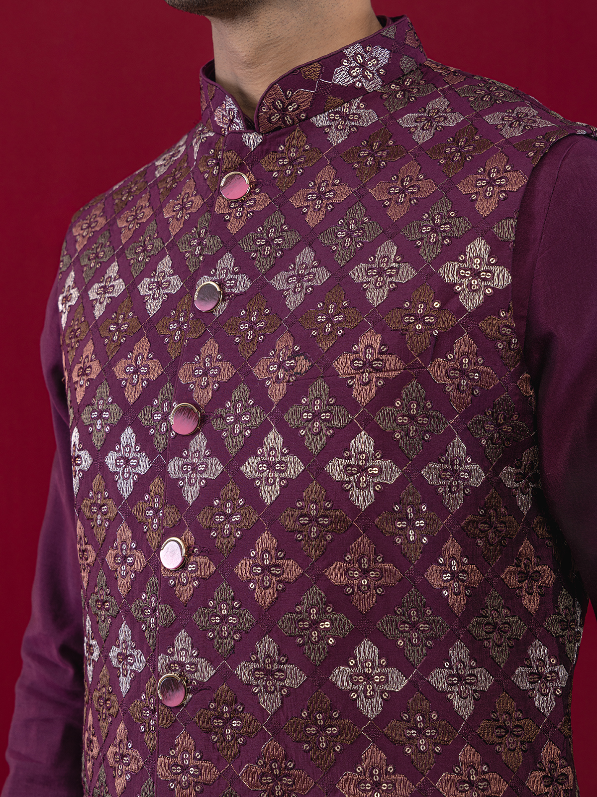 Drape yourself in effortless sophistication with this wine cotton silk waistcoat set. The sleeveless waistcoat dazzles with sequin and thread embroidery and a mandarin collar. Styled with a matching kurta and pant, it’s an ideal ensemble for festive celebrations and elegant wedding events.