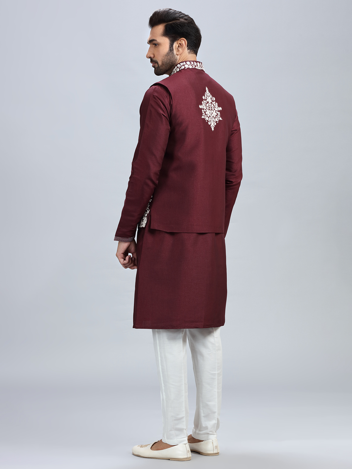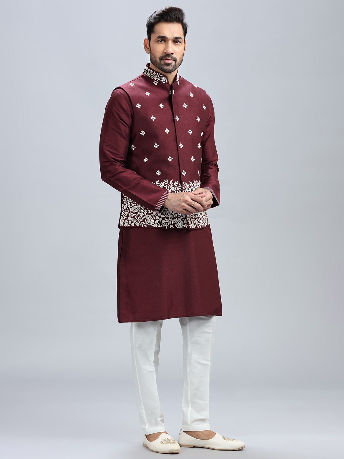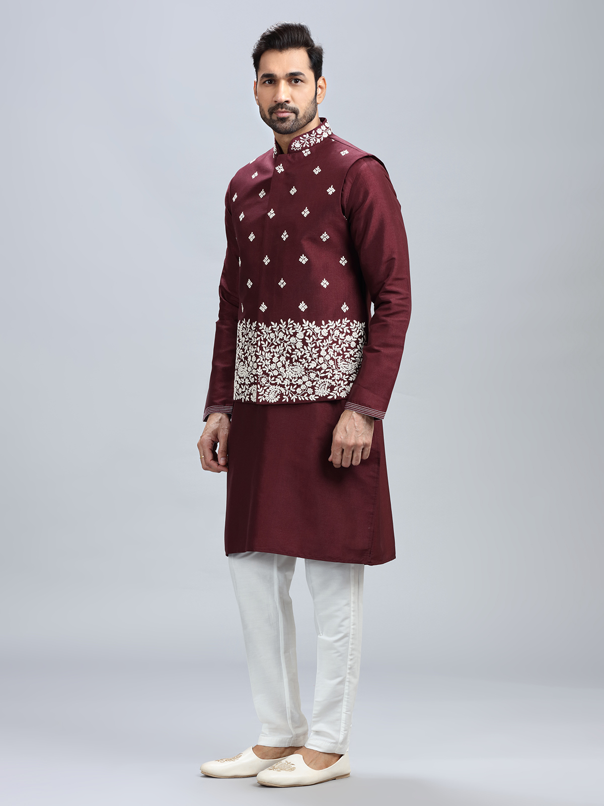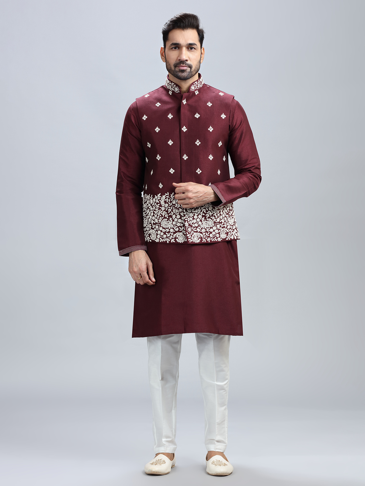 Any occasion will be more elegant when this finely designed wine silk waistcoat combo is worn. Embellished with embroidered and stone work. has a bottom.