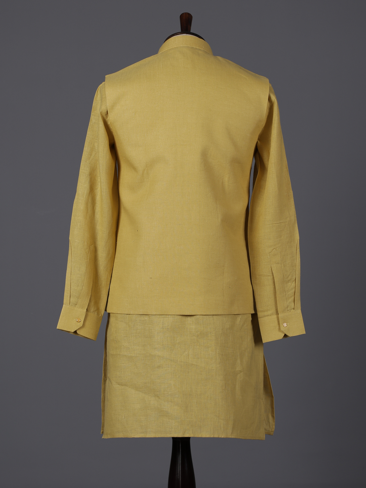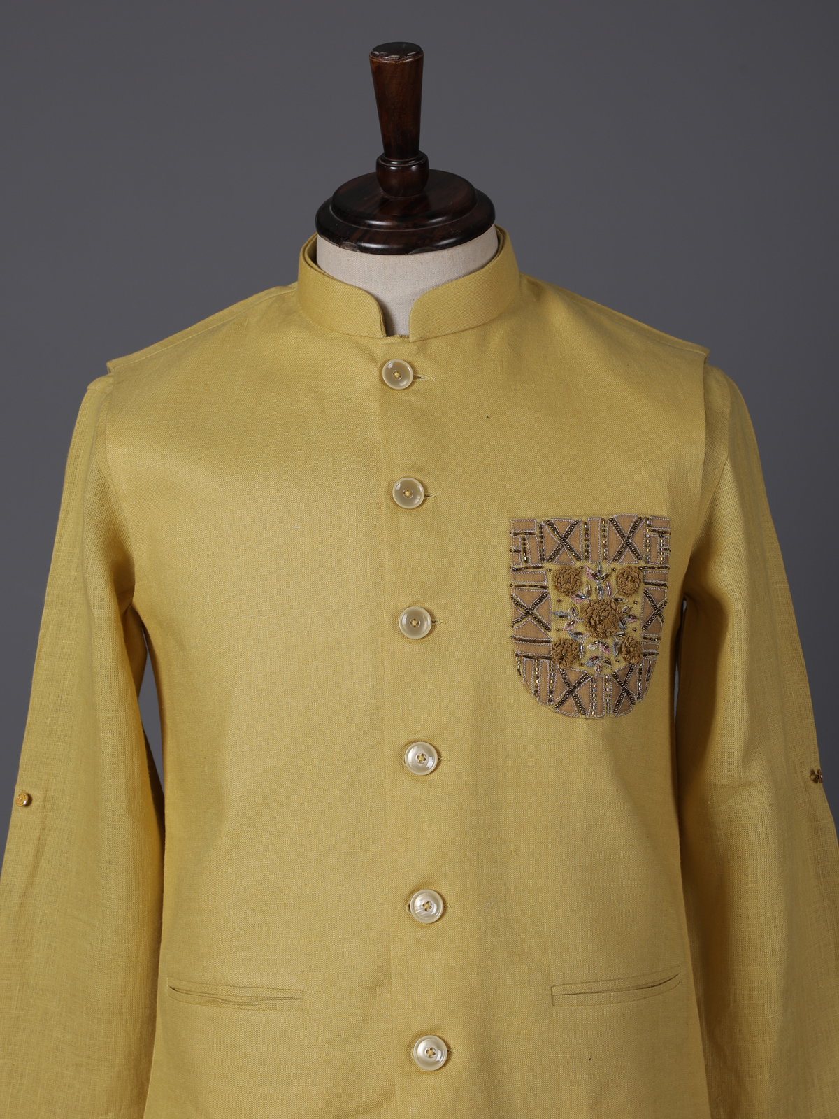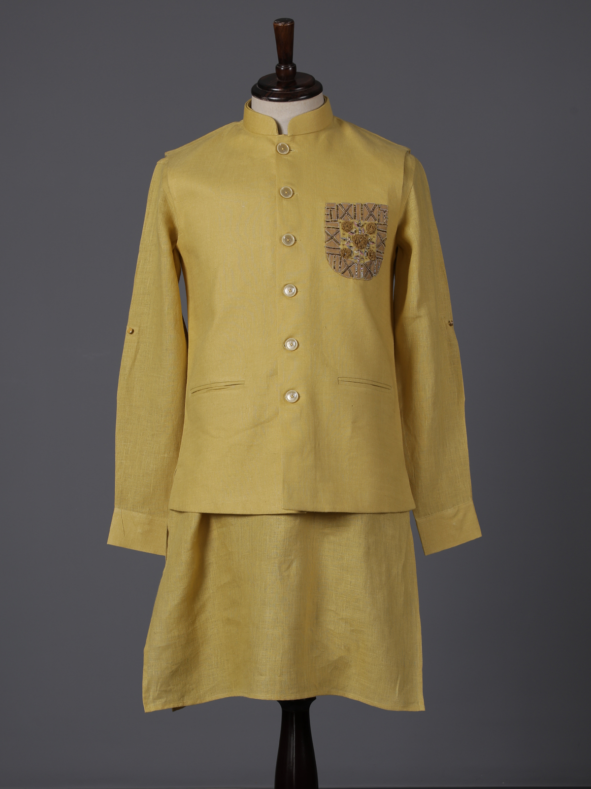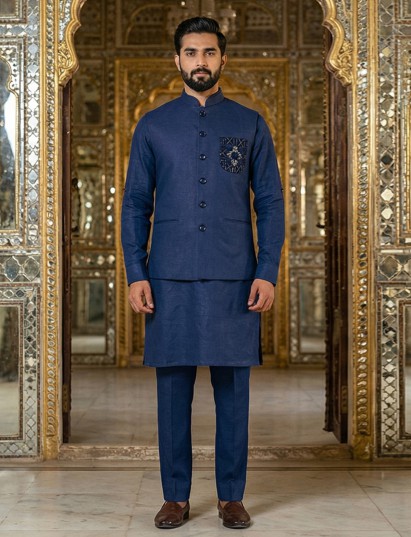 Vibrant yellow tones capture the spirit of celebration in this cotton blend waistcoat set designed for festive charm. Accented with cutdana, thread and bead work on the pocket, it offers a soft radiant shimmer. The mandarin collar refines its structured appeal, while the fabric ensures comfort. Paired with kurta and pants, this ensemble is ideal for haldi, weddings and joyful gatherings.