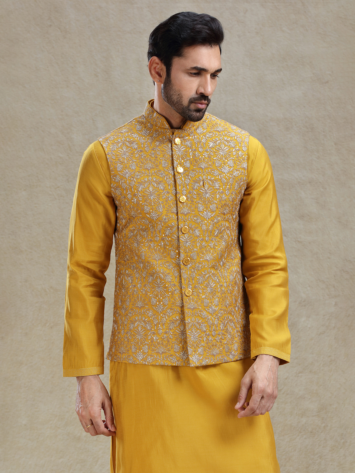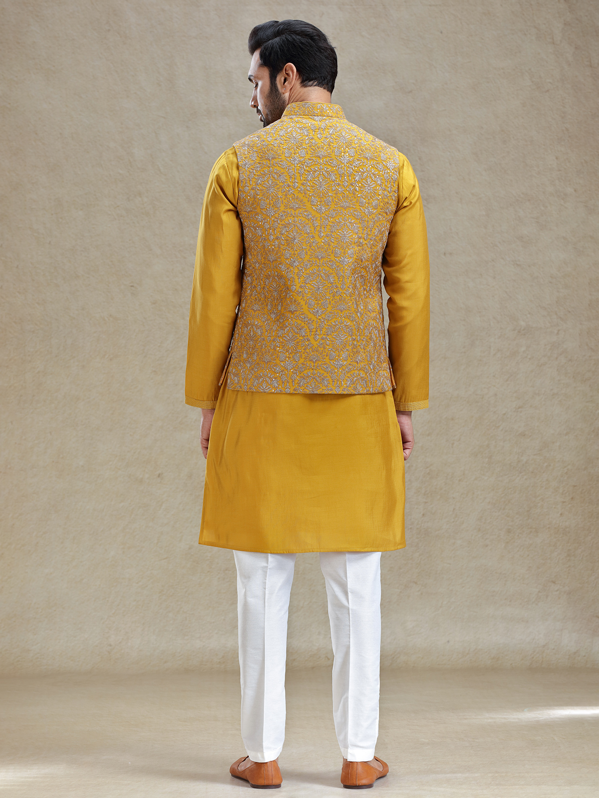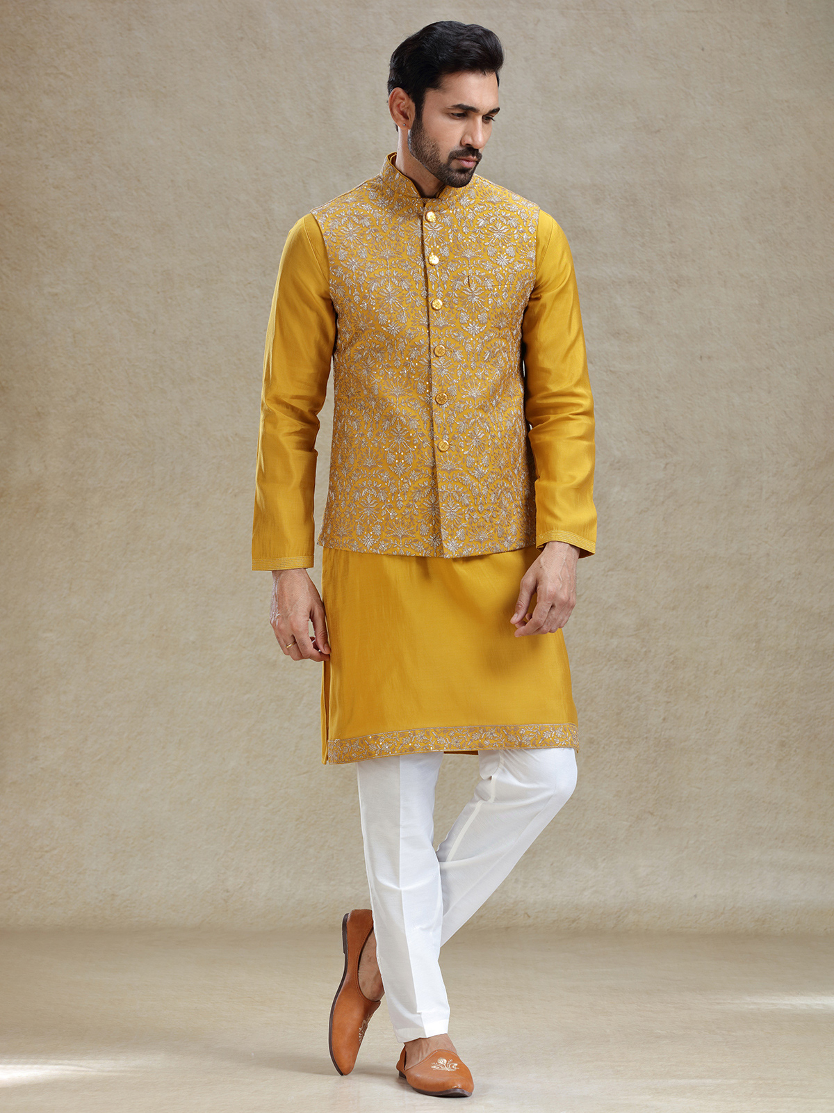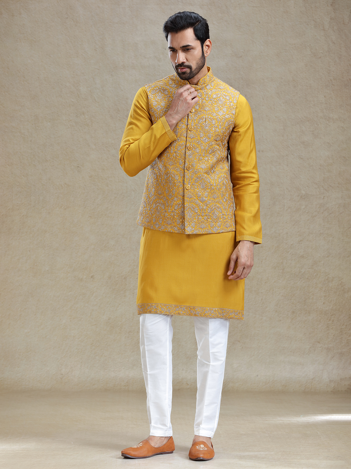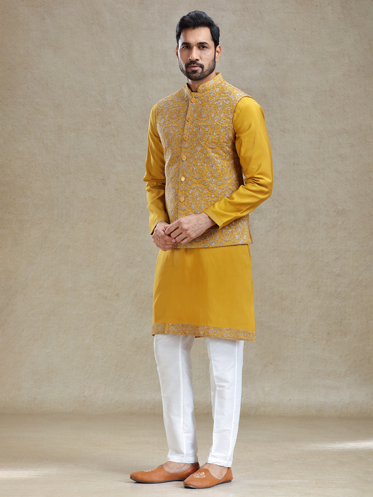 Yellow Cotton Silk Haldi Special Kurta Jacket Set