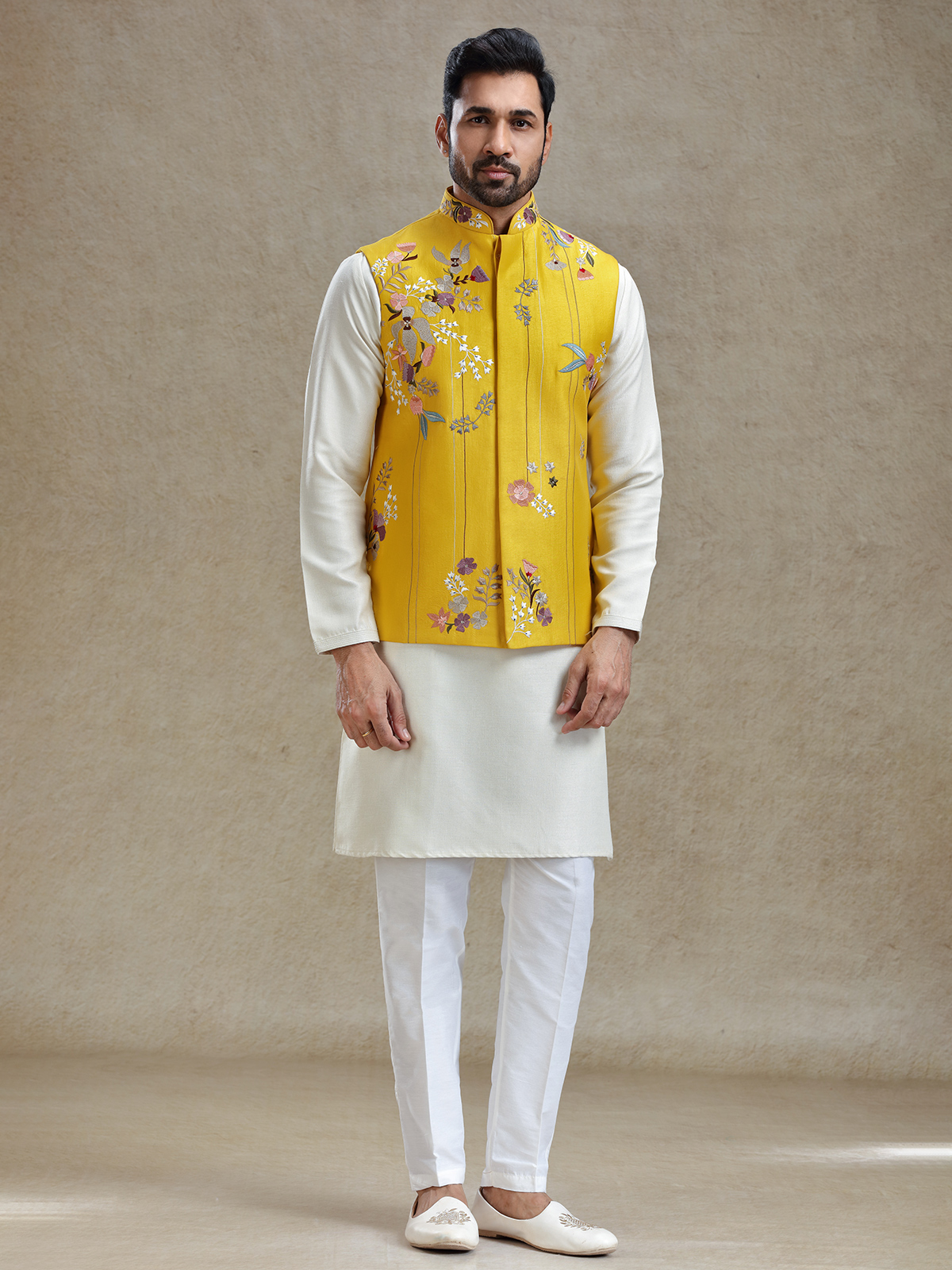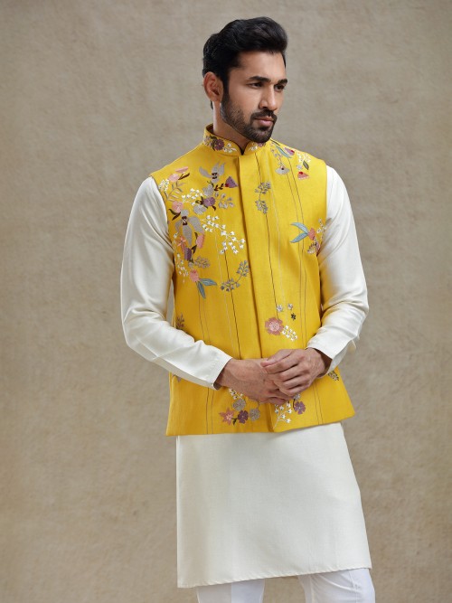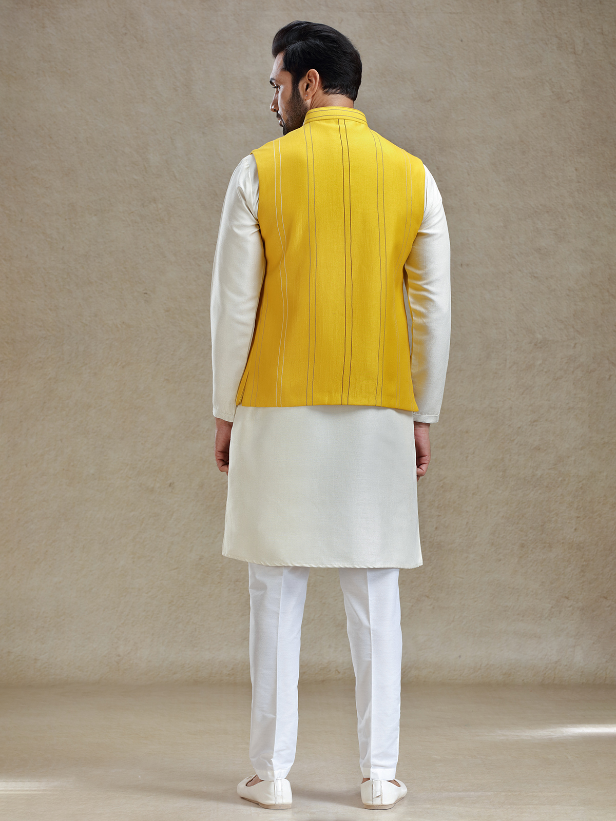 Make a striking statement with this eye-catching yellow silhouette, designed to leave a lasting impression. Crafted from rich linen silk, this luxurious ensemble features a front hook-eye placket and a stylish mandarin collar, adding a touch of sophistication to your festive look. Perfect for grand weddings and festive occasions, this set of three including the waistcoat, kurta, and bottom is an ideal addition to elevate your ethnic collection with effortless style.