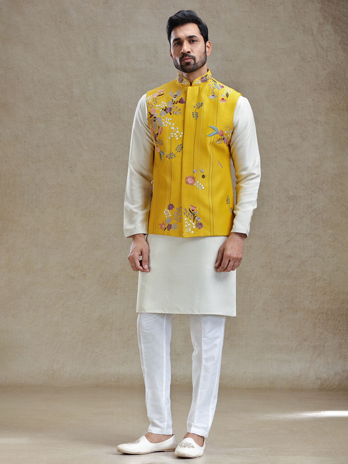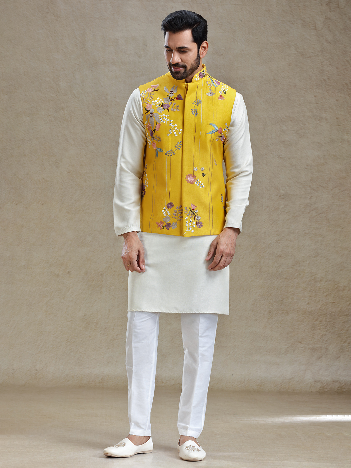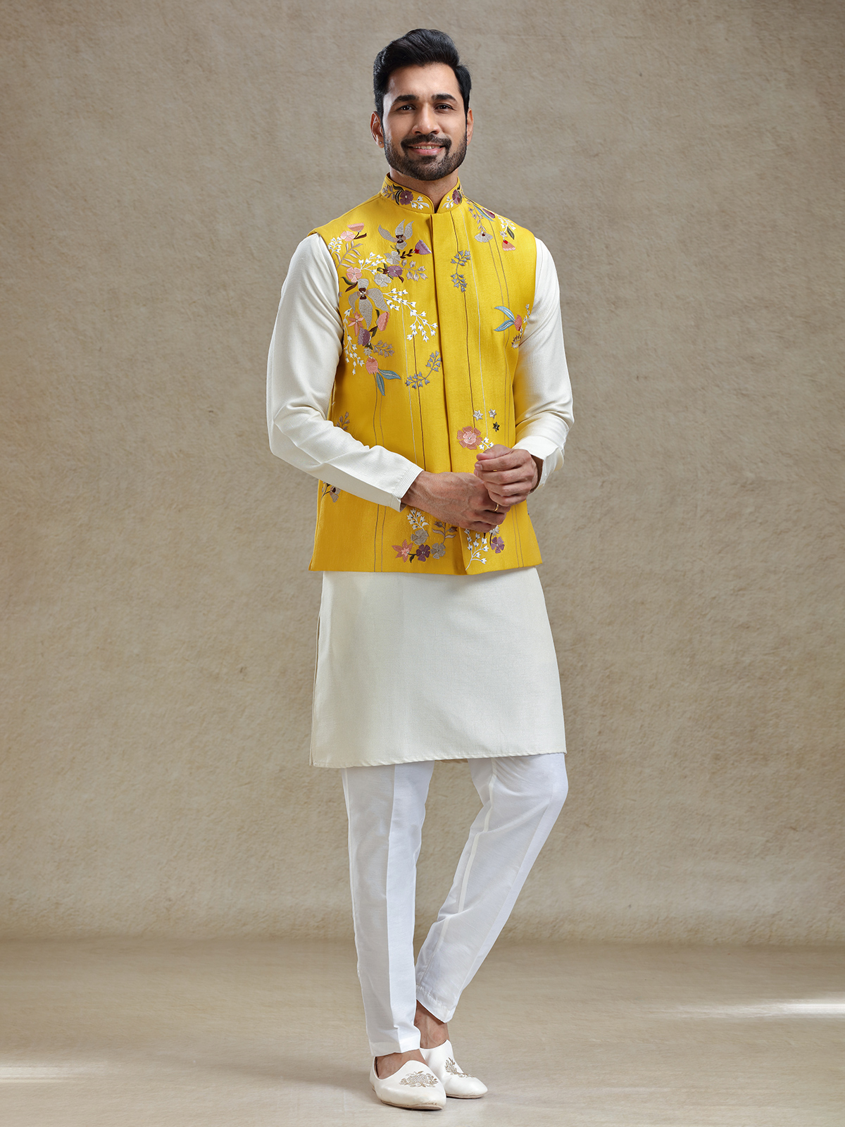 Make a striking statement with this eye-catching yellow silhouette, designed to leave a lasting impression. Crafted from rich linen silk, this luxurious ensemble features a front hook-eye placket and a stylish mandarin collar, adding a touch of sophistication to your festive look. Perfect for grand weddings and festive occasions, this set of three including the waistcoat, kurta, and bottom is an ideal addition to elevate your ethnic collection with effortless style.