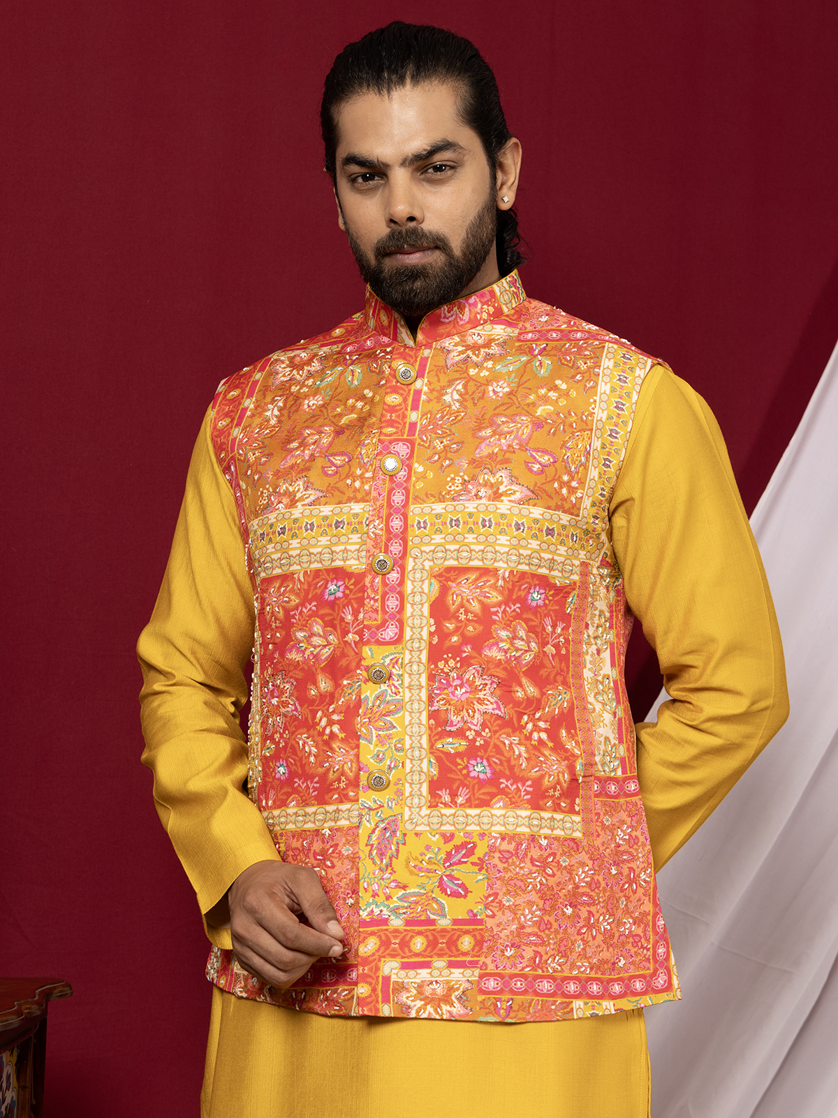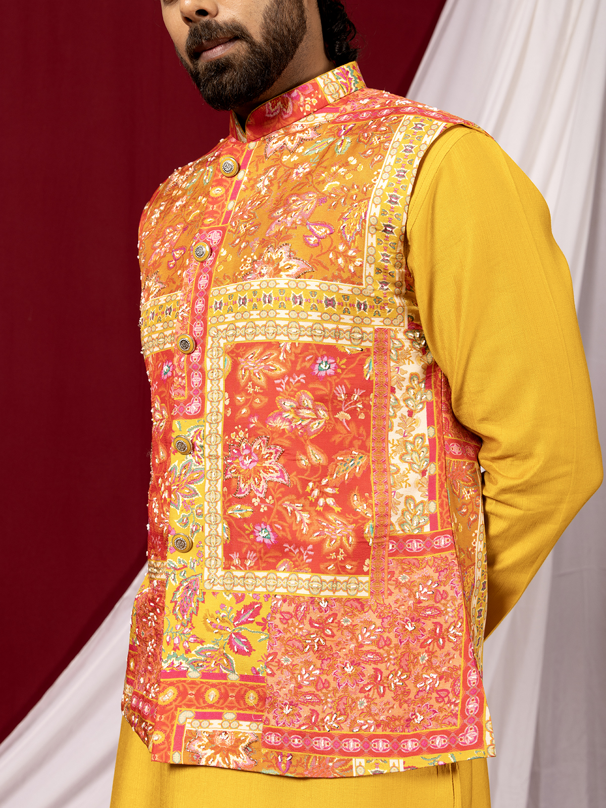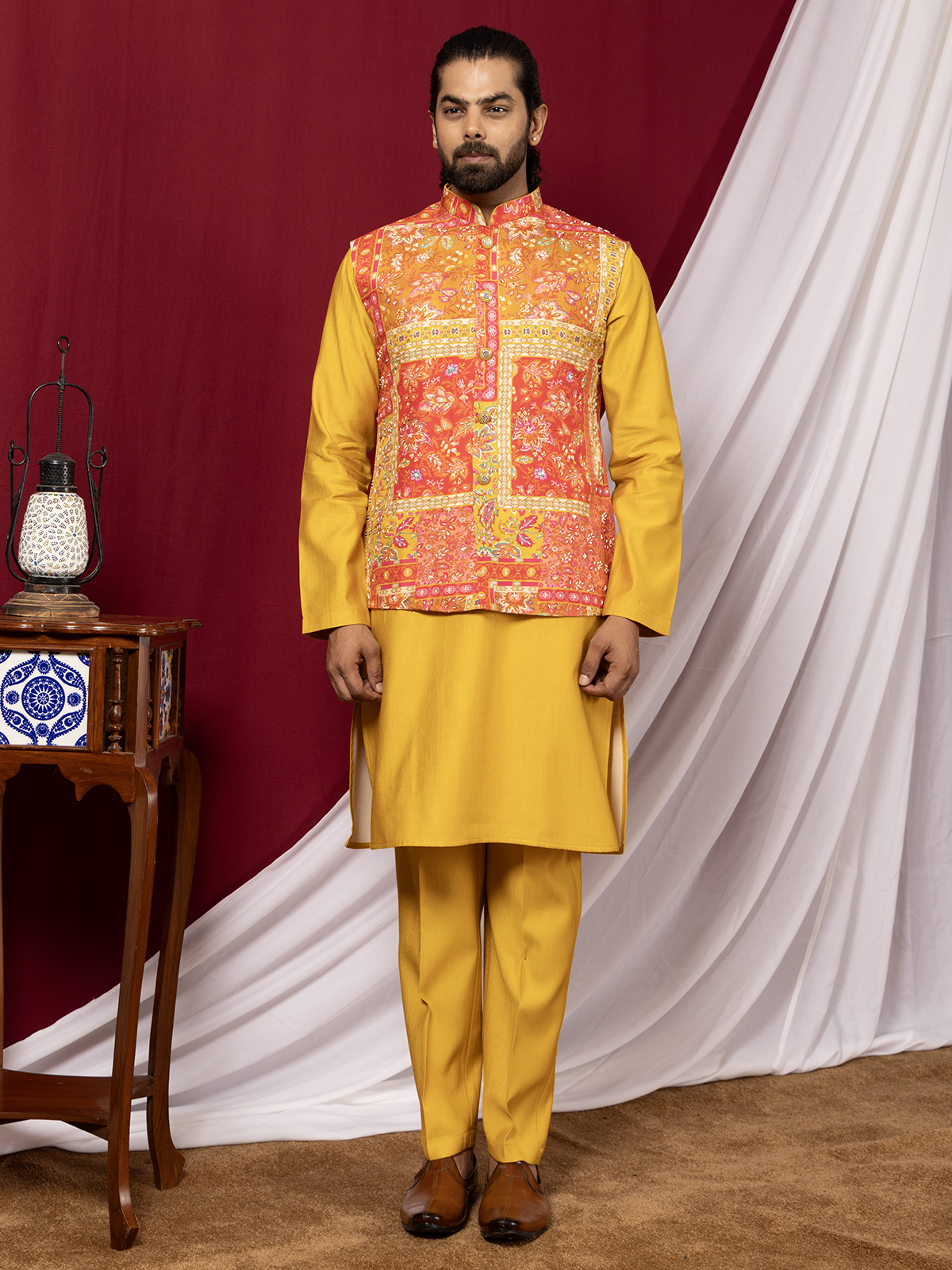 Radiating festive charm, this yellow cotton-silk waistcoat set features refined cutdana and sequins detailing over graceful prints. The Chinese collar and sleeveless silhouette bring a classic, polished touch. Paired with coordinated pants, it strikes the perfect balance of traditional sophistication and modern celebration style.
