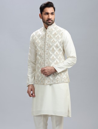 Get ready for upcoming wedding events with this stunning yellow silk waistcoat set, embellished with embroidery, resham and mirror work. Perfect for a haldi ceremony, it features a stand collar and full buttoned placket. Comes with a bottom.