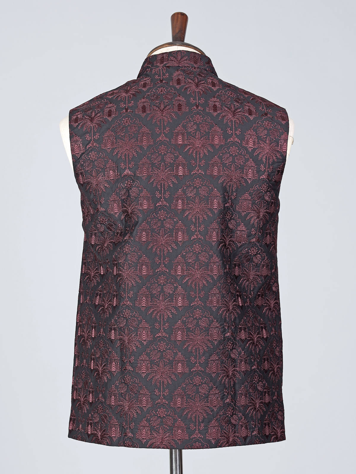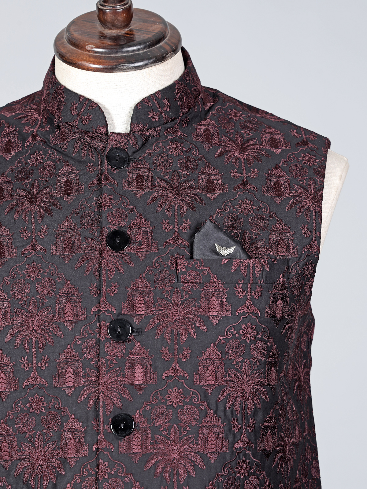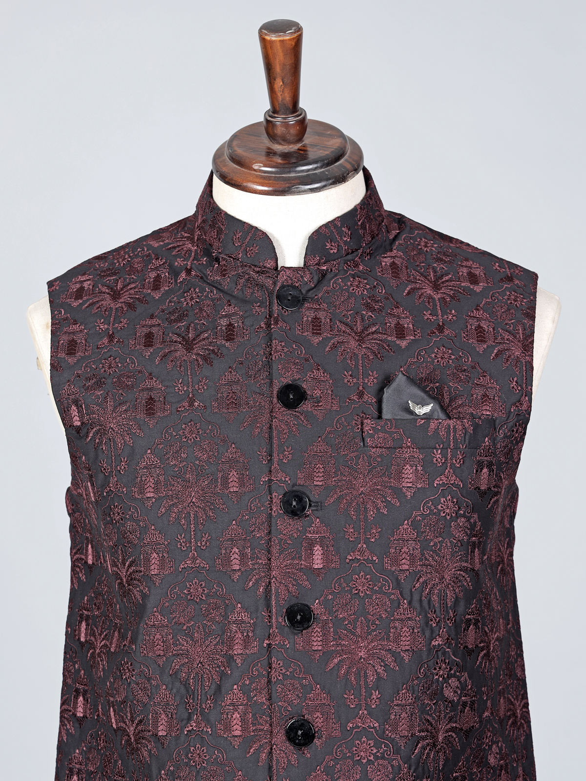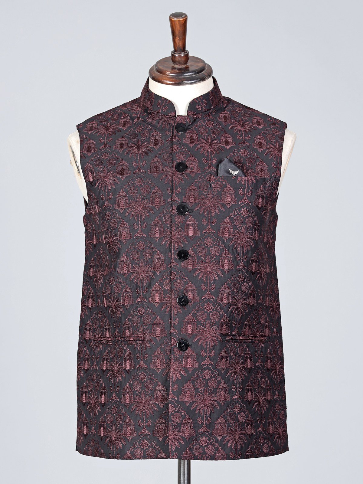 Made from banarasi rayon cotton, this black waistcoat showcases elegant embroidery and thread detailing. Comfortable yet festive, it offers a perfect blend of tradition and style for weddings, festive gatherings, and reception wear.