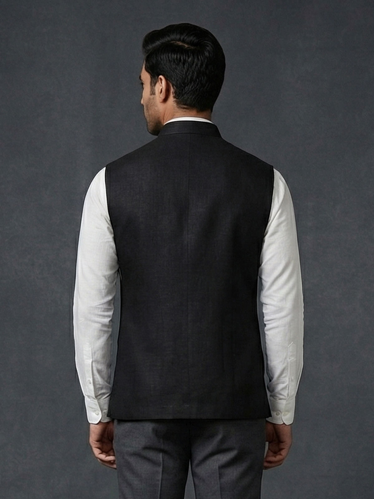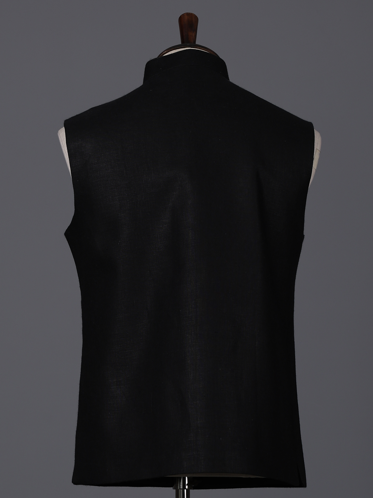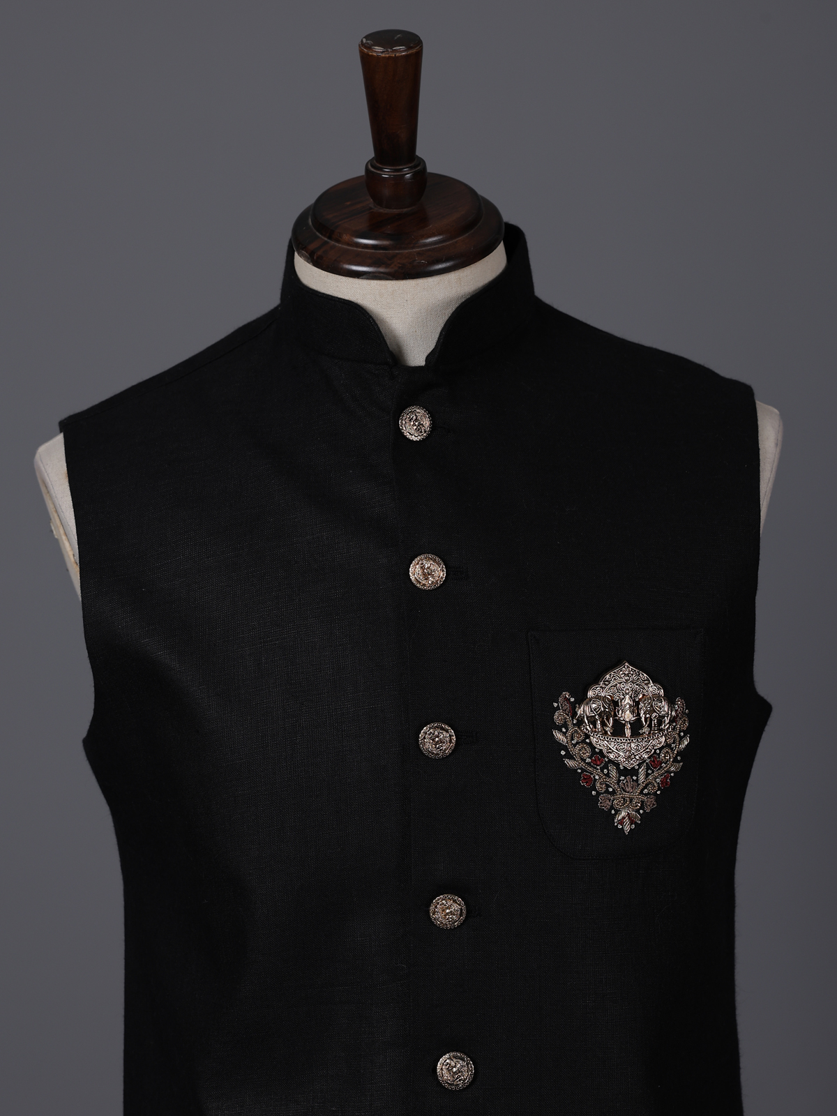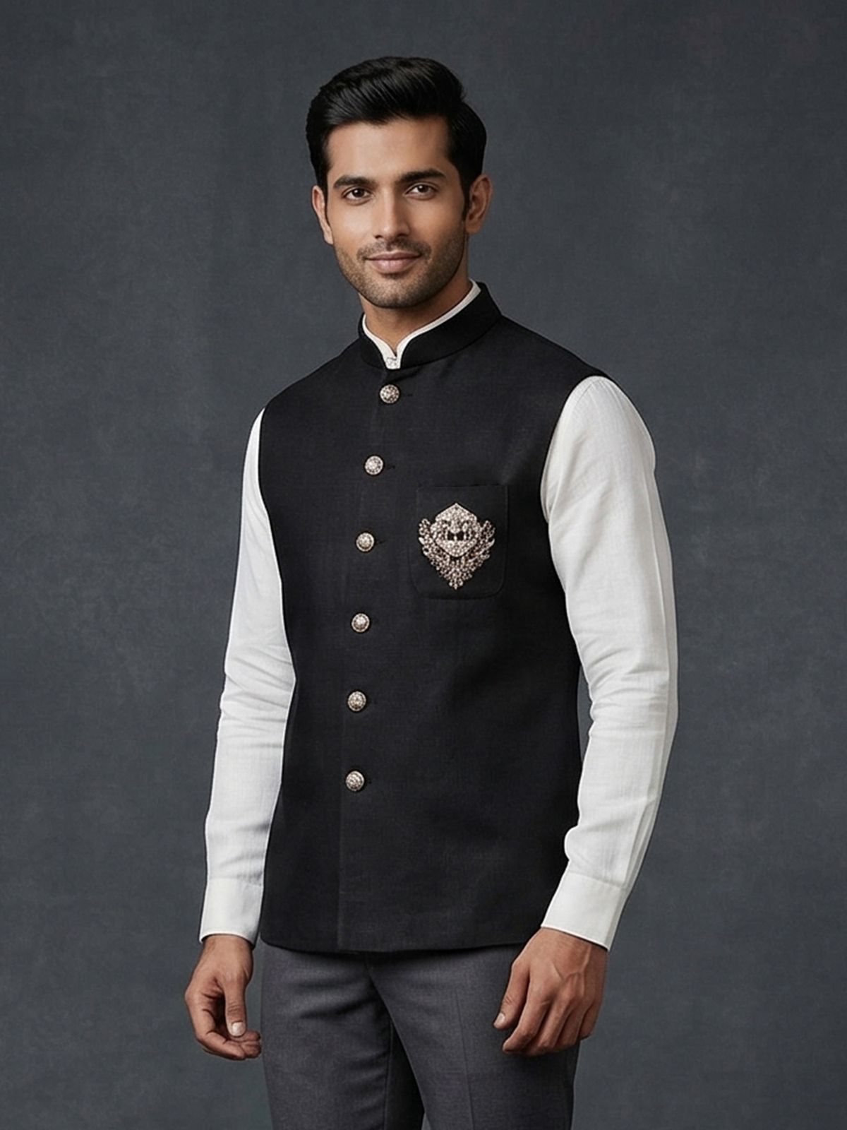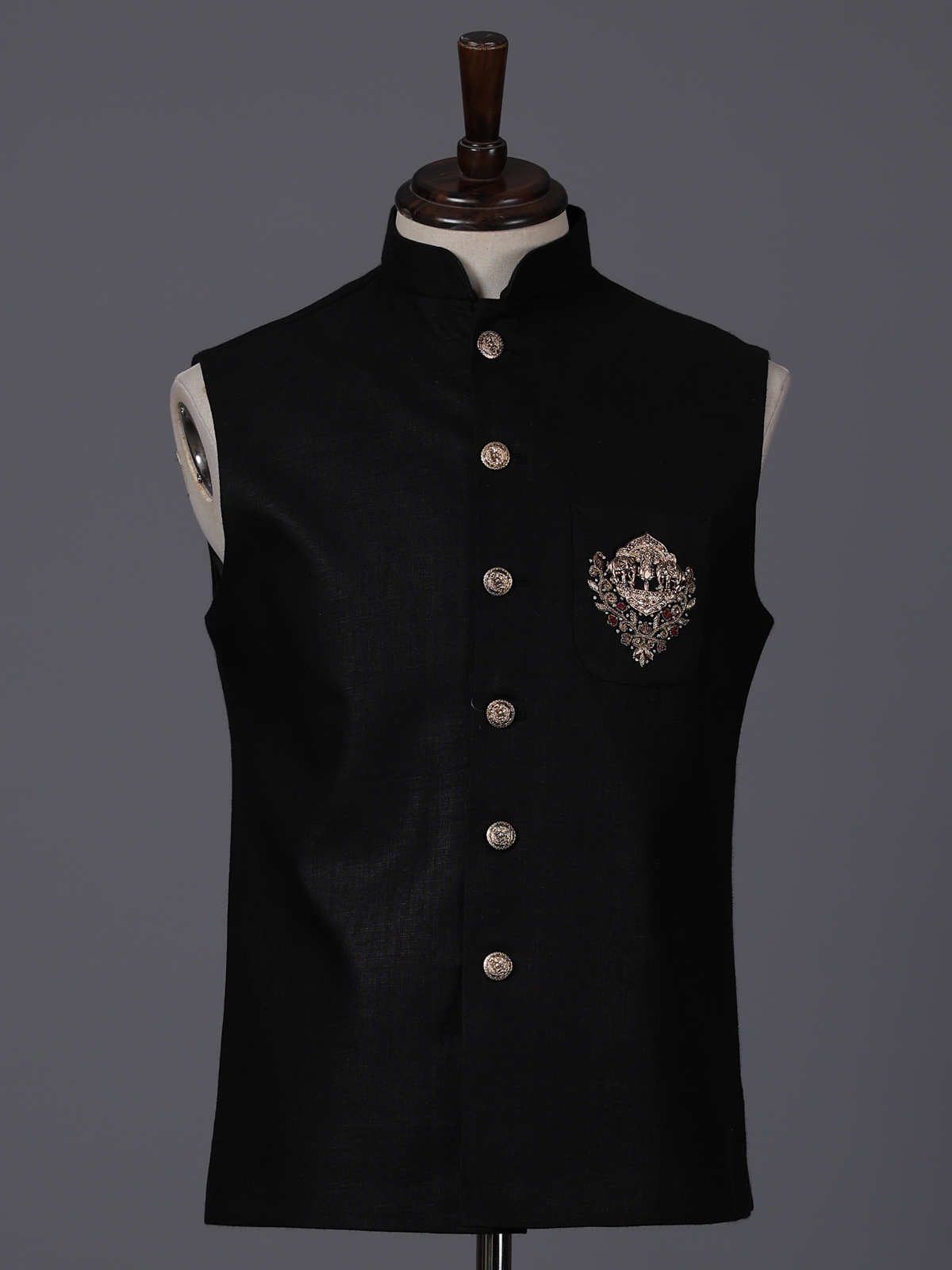Classic black bring bold sophistication to this cotton waistcoat crafted for festive elegance. The design features intricate bead, zardosi and thread embellishments that add rich texture and refined detail. Complemented with a statement brooch. With its structured silhouette and timeless appeal, this waistcoat is an ideal choice for weddings, receptions and special occasions.