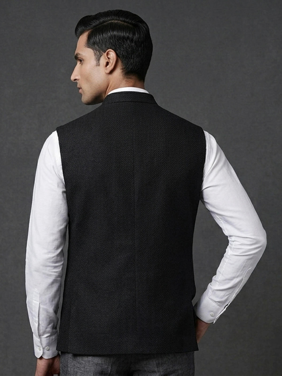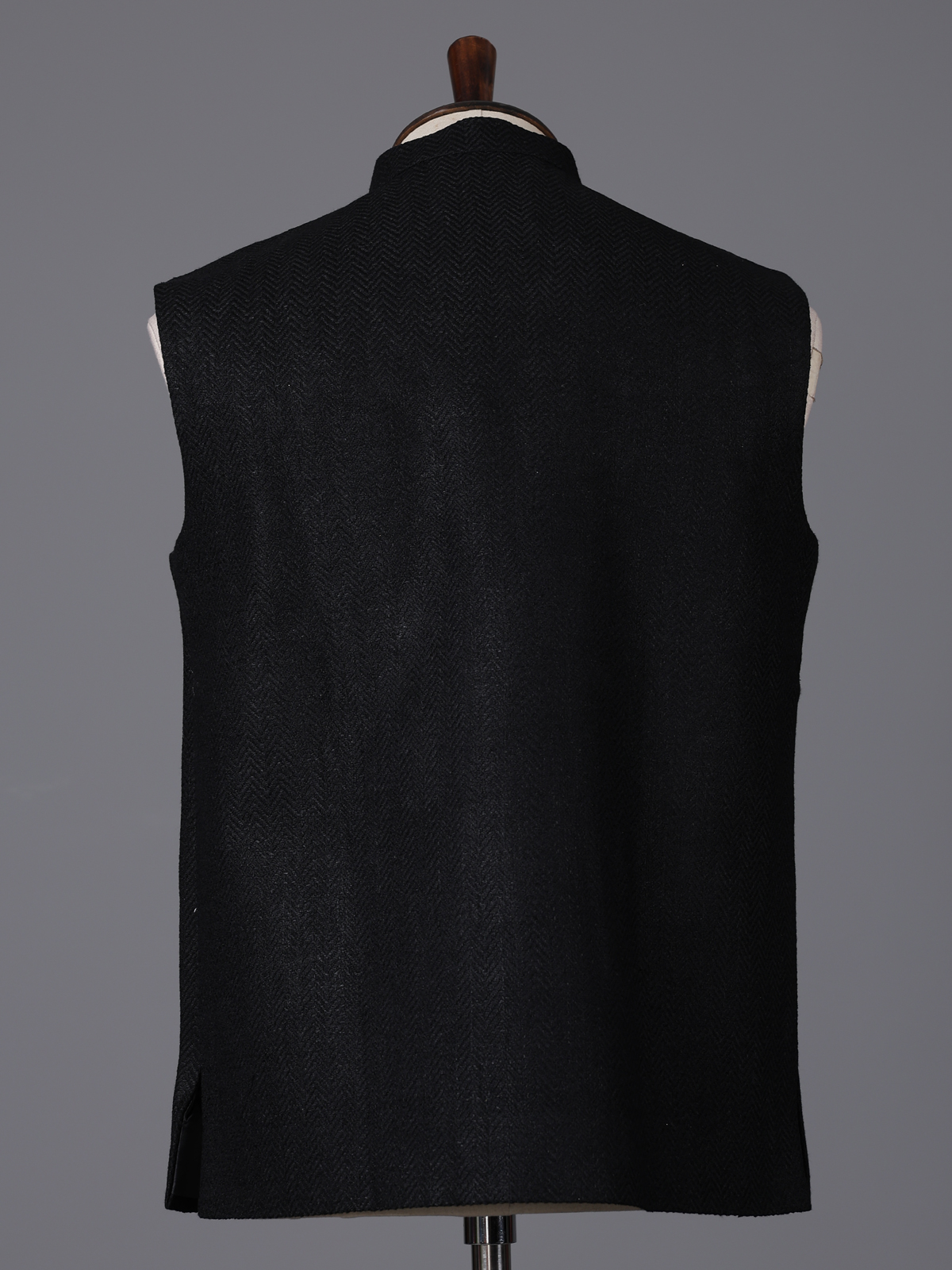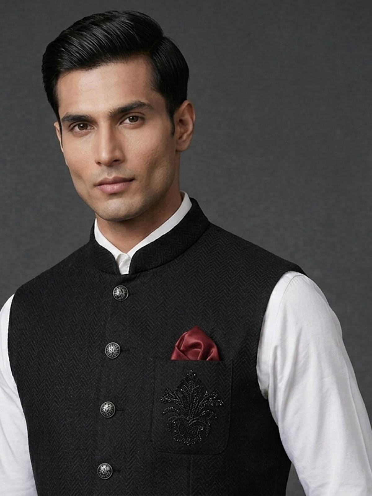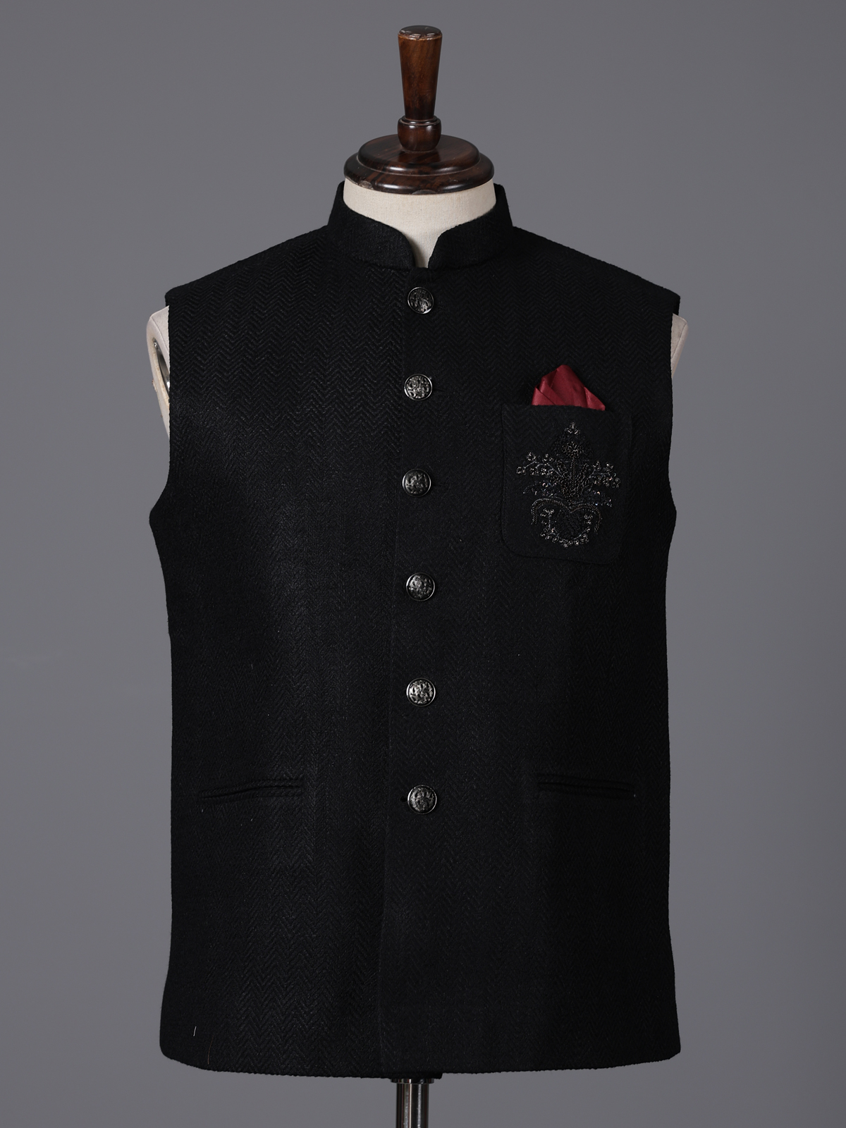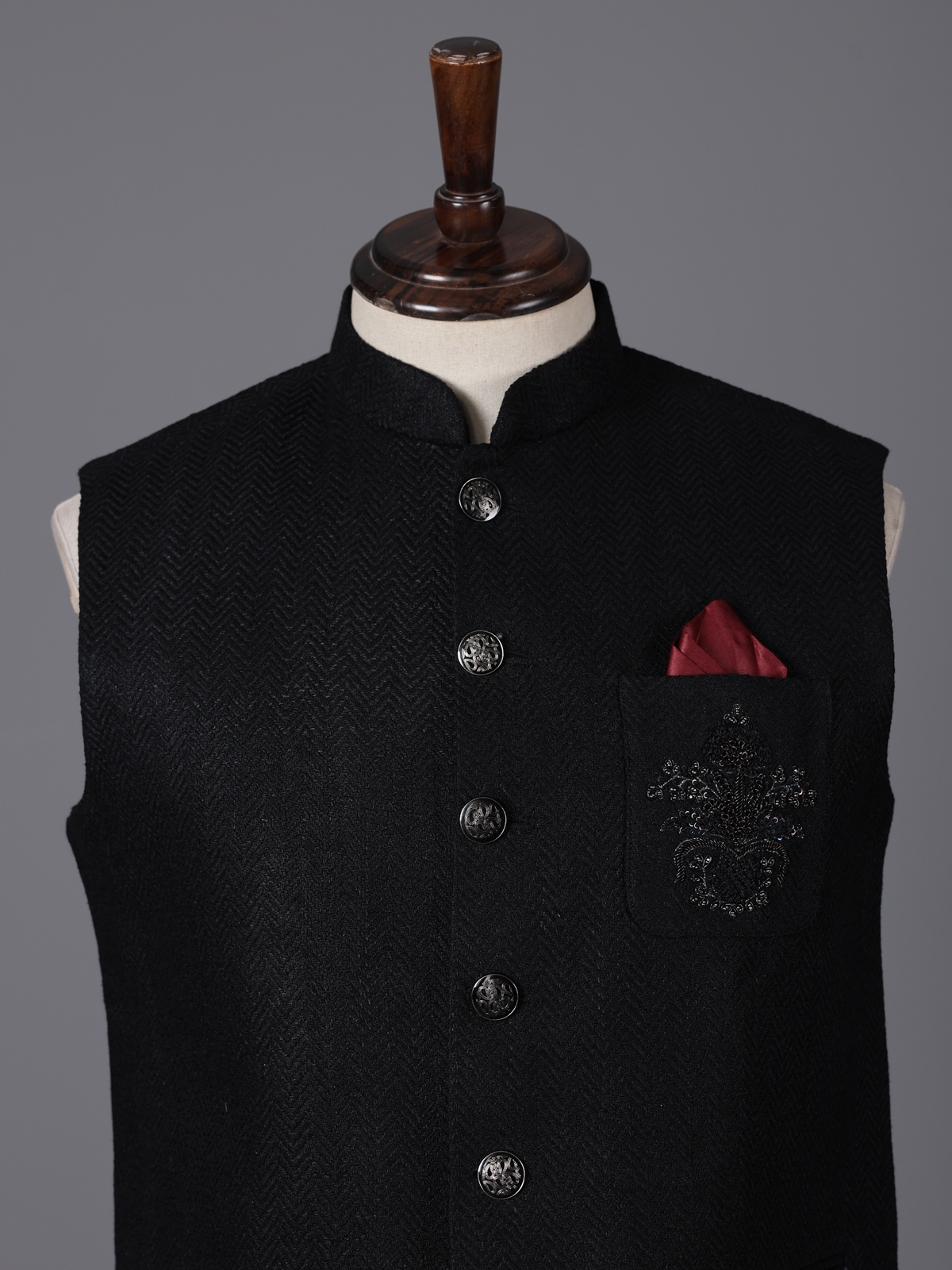 Classic black tones elevate the sophistication of this cotton waistcoat designed with a rich textured finish. Embellished with thread, sequins, beads and zardosi detailing on the pocket. It radiates subtle luxury. The structured design enhances its sharp silhouette. Making it perfect for weddings, receptions and party wear. This waistcoat creates a bold and refined festive statement.