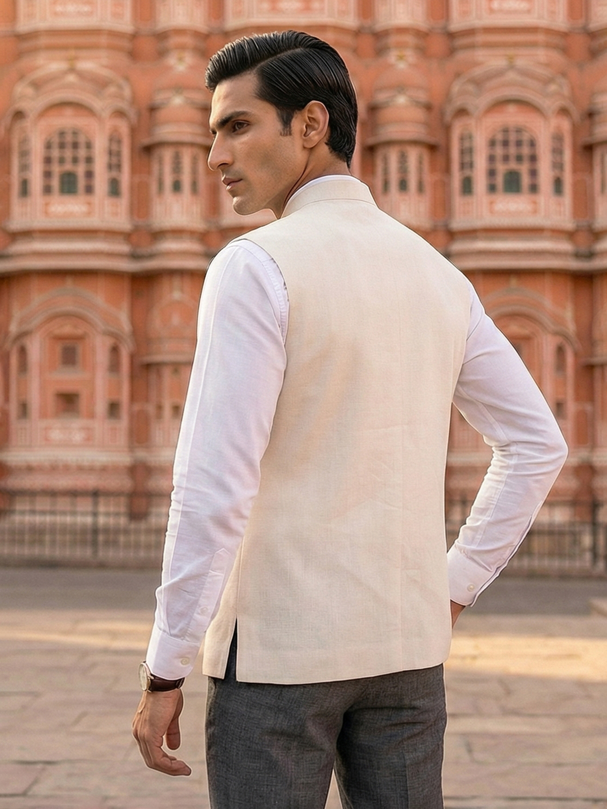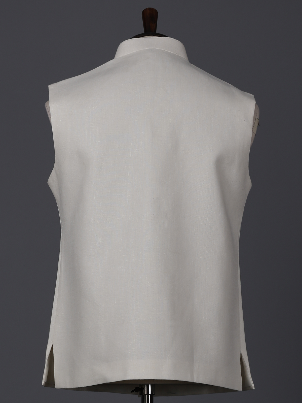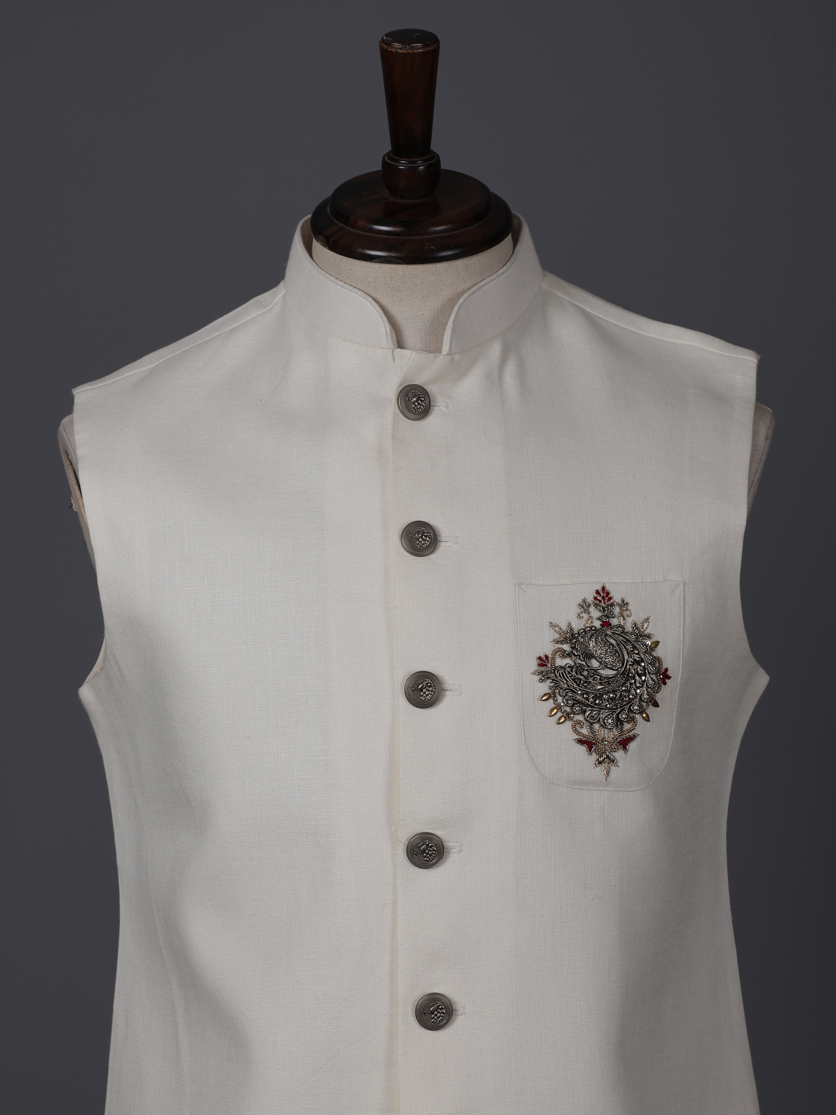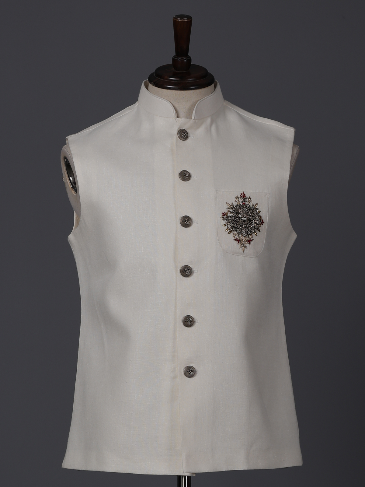 Upgrade your style with this versatile cream cotton silk waistcoat with zardosi, resham and patch work on pocket. It has a mandarin collar, full buttoned placket and sleeveless pattern
