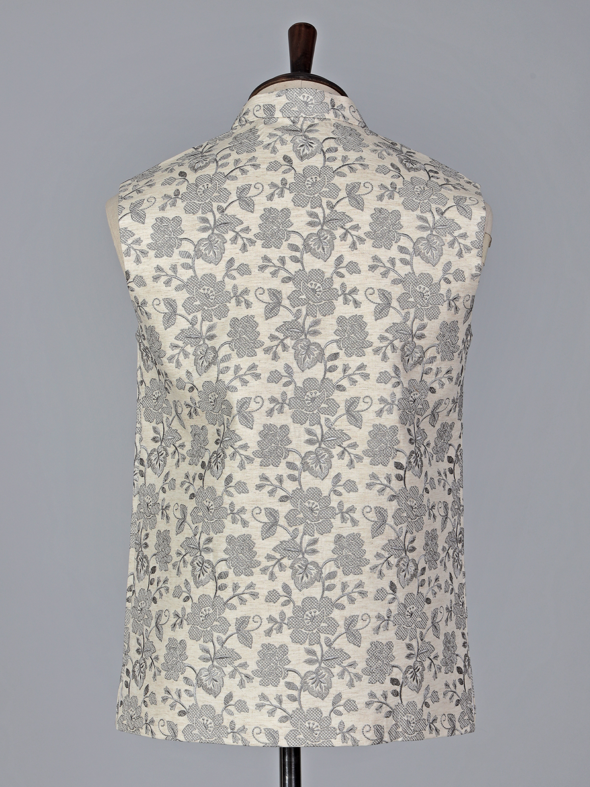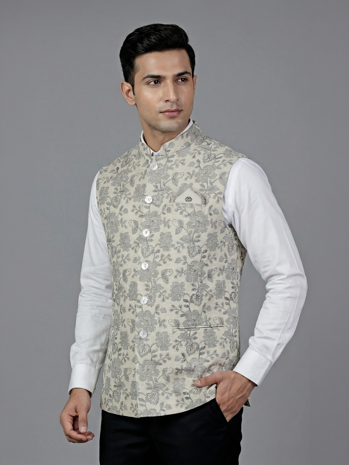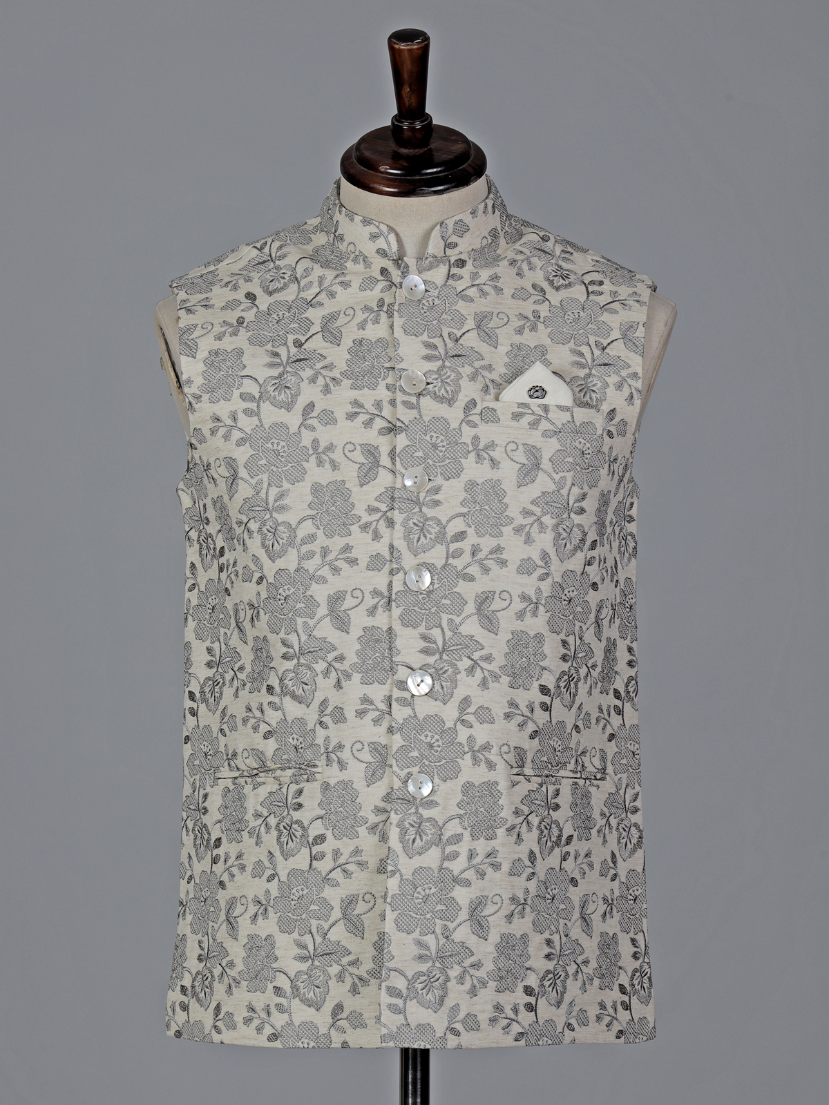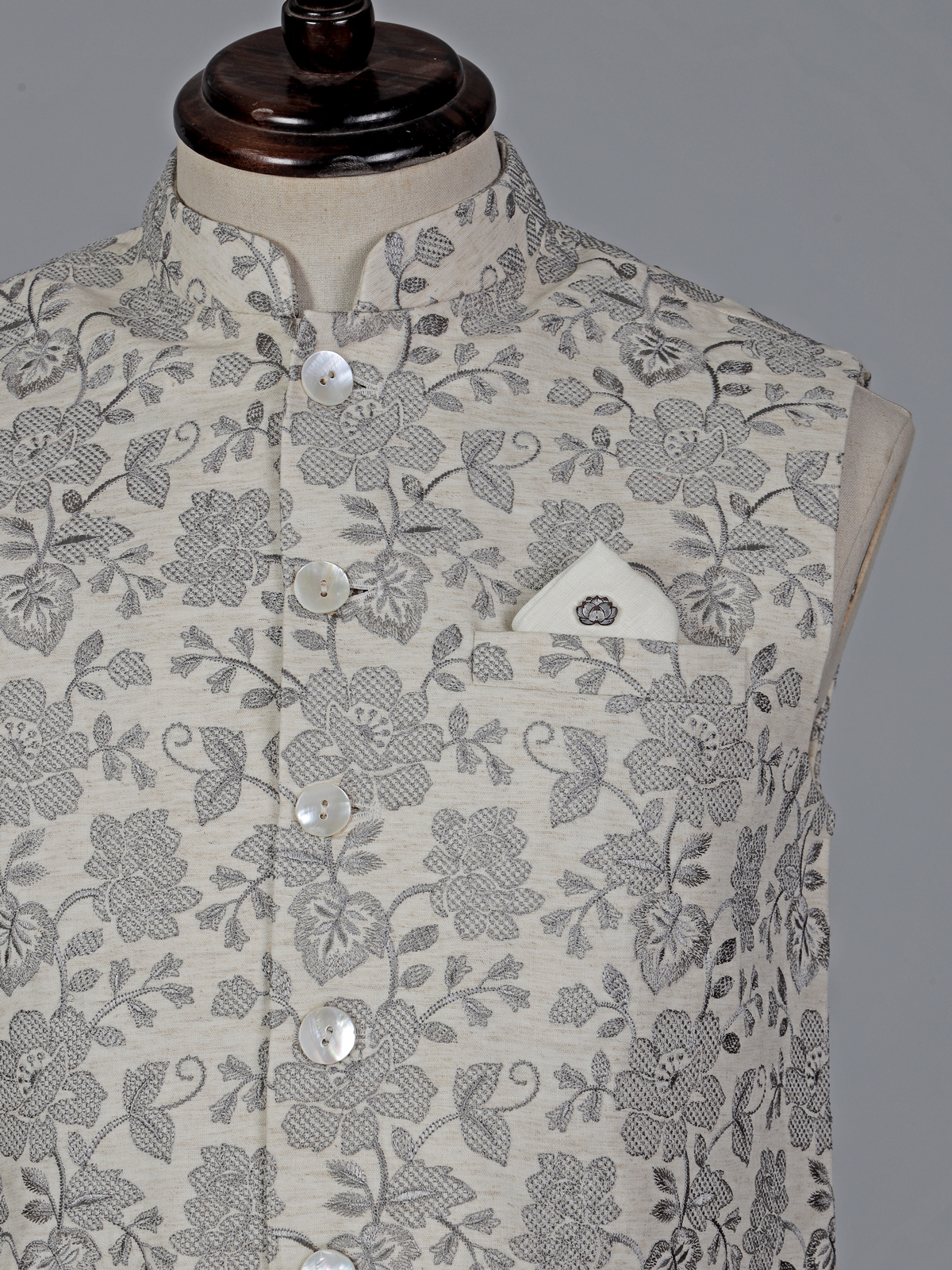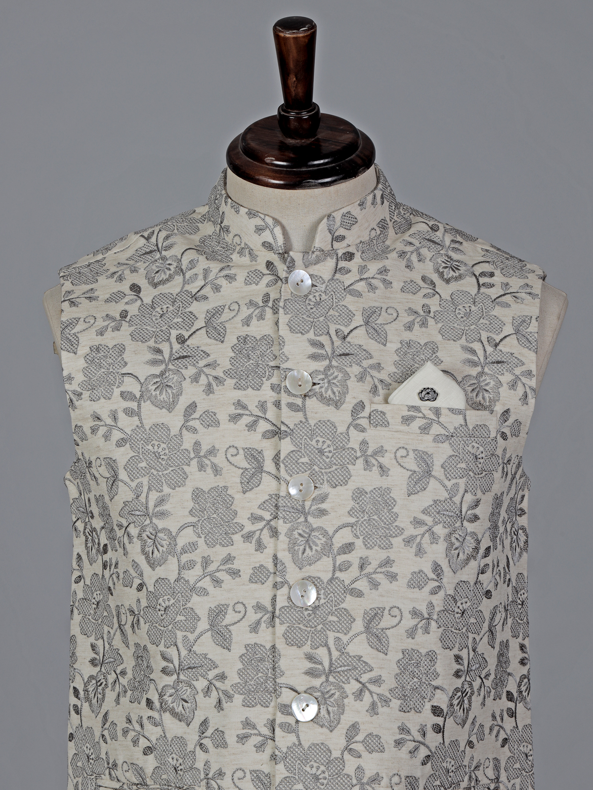 This cream cotton silk waistcoat showcases delicate zari work that adds traditional richness. The soft sheen and structured design make it an excellent choice for weddings, festive occasions, and reception wear with a graceful ethnic finish.