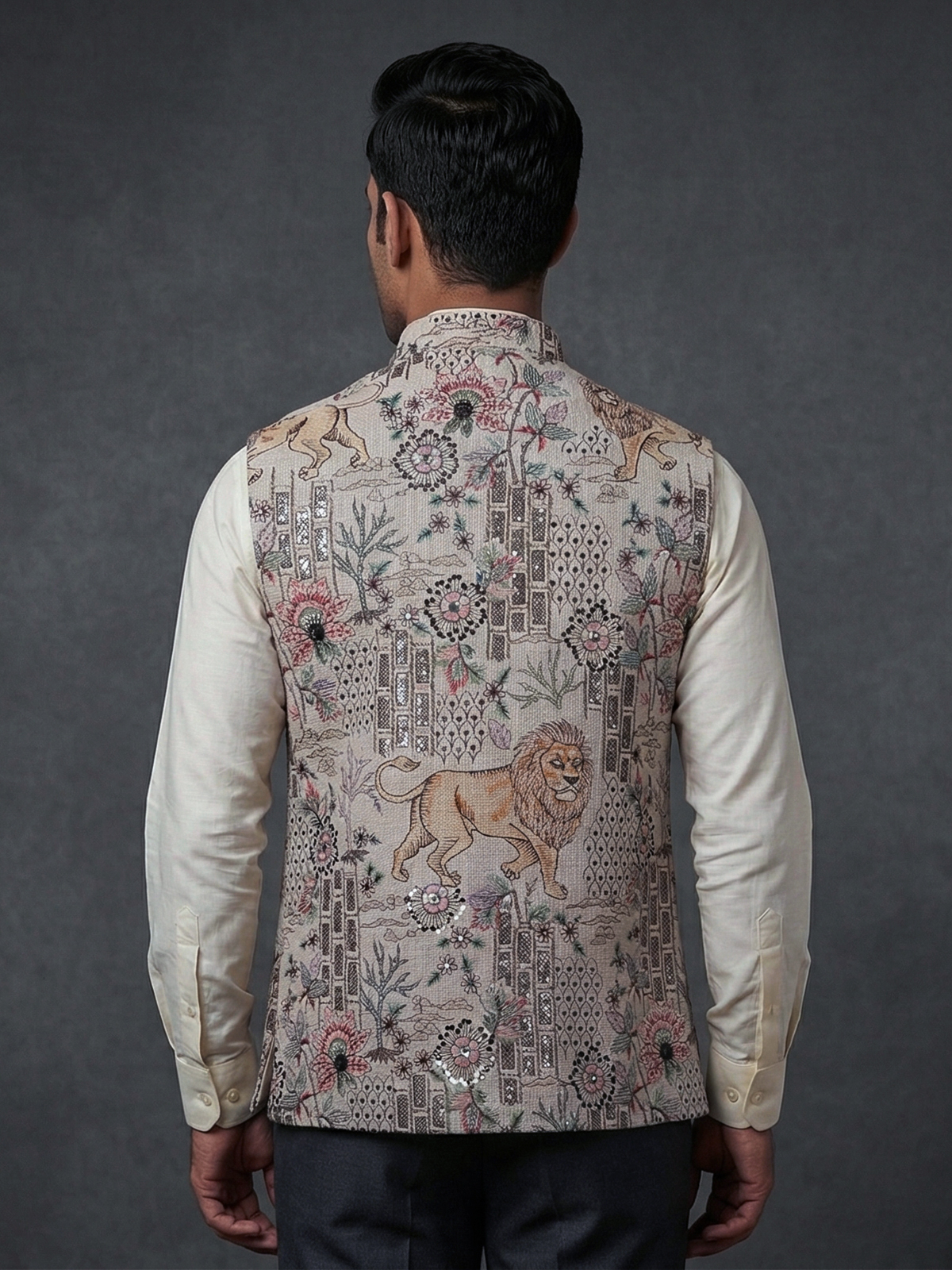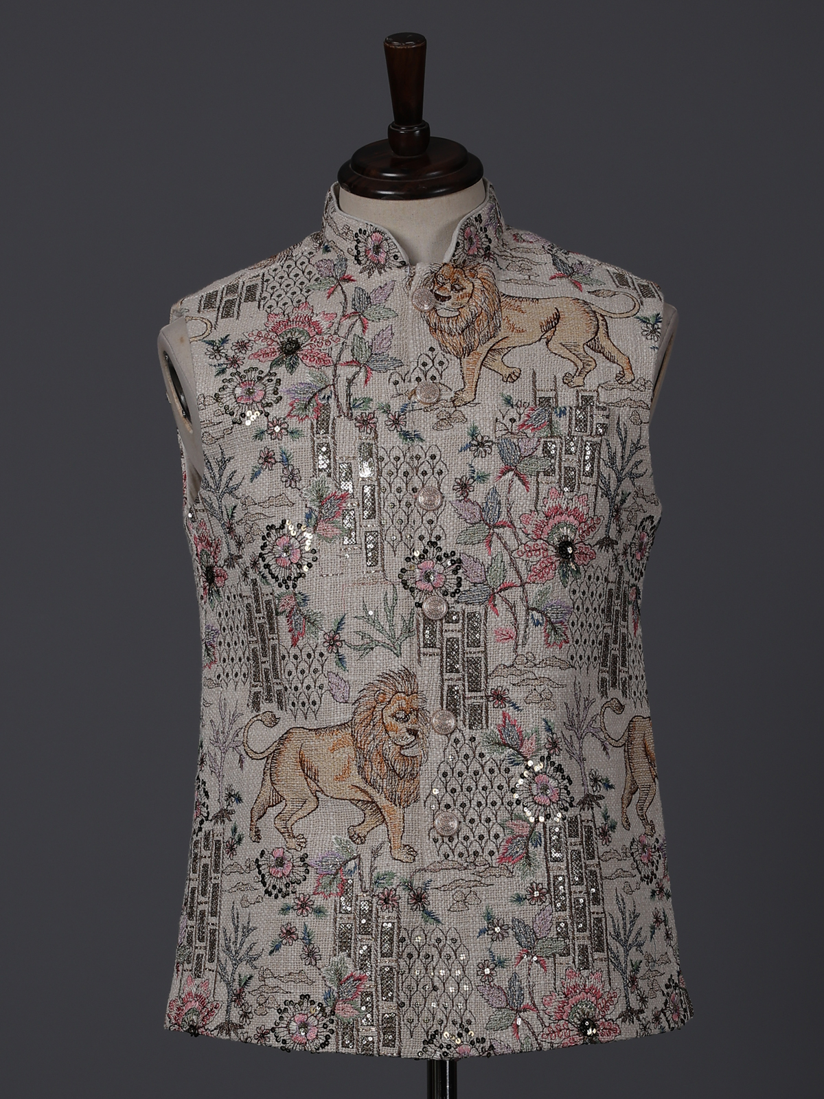 Cream Jute Embroidered Festive Waistcoat For Wedding Wear