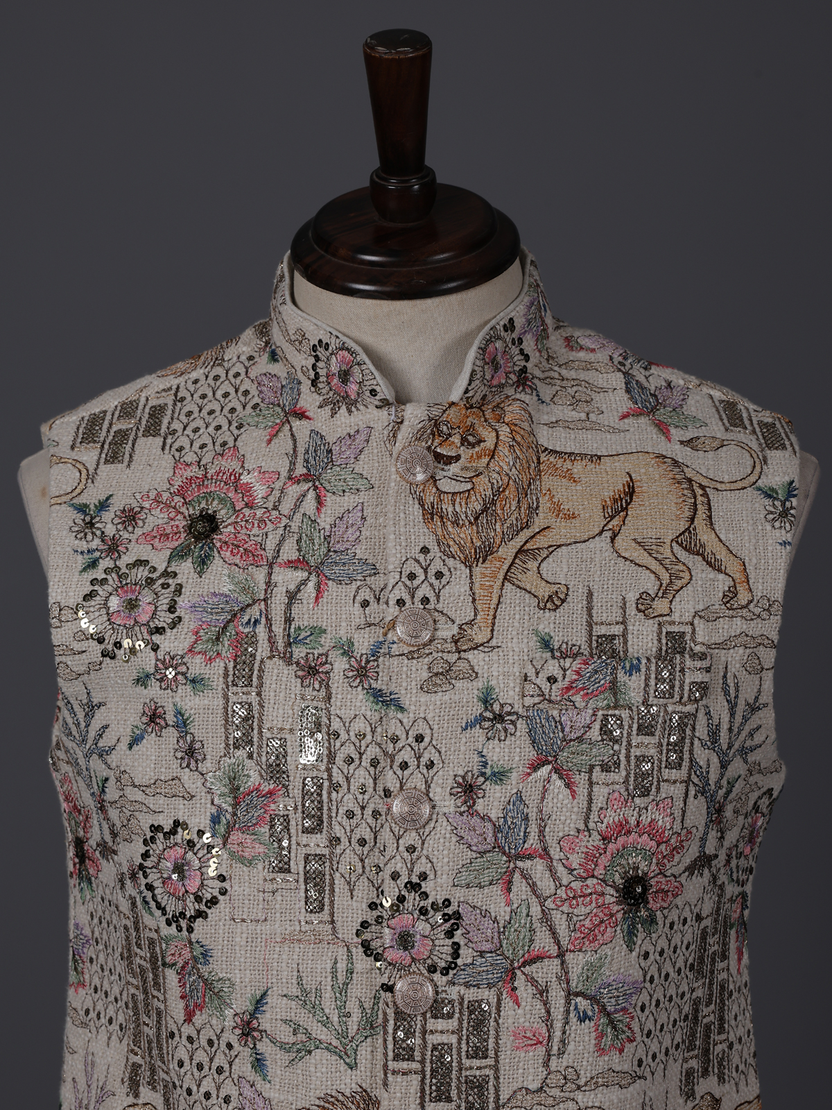 Soft cream tones reflect timeless elegance in this jute waistcoat crafted for refined celebrations. Designed with a structured silhouette, it is beautifully adorned with delicate embroidery and sequin embellishments that add subtle festive shimmer. The textured jute fabric enhances its natural charm. Making this waistcoat a graceful layering piece perfect for weddings, receptions and traditional festive occasions.
