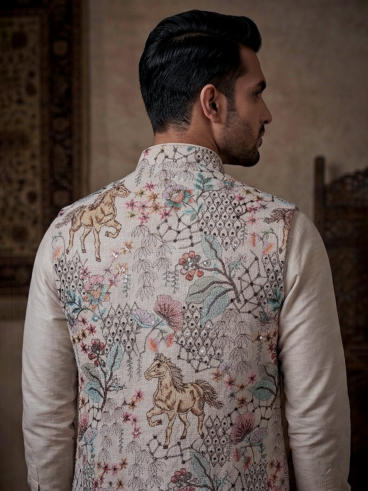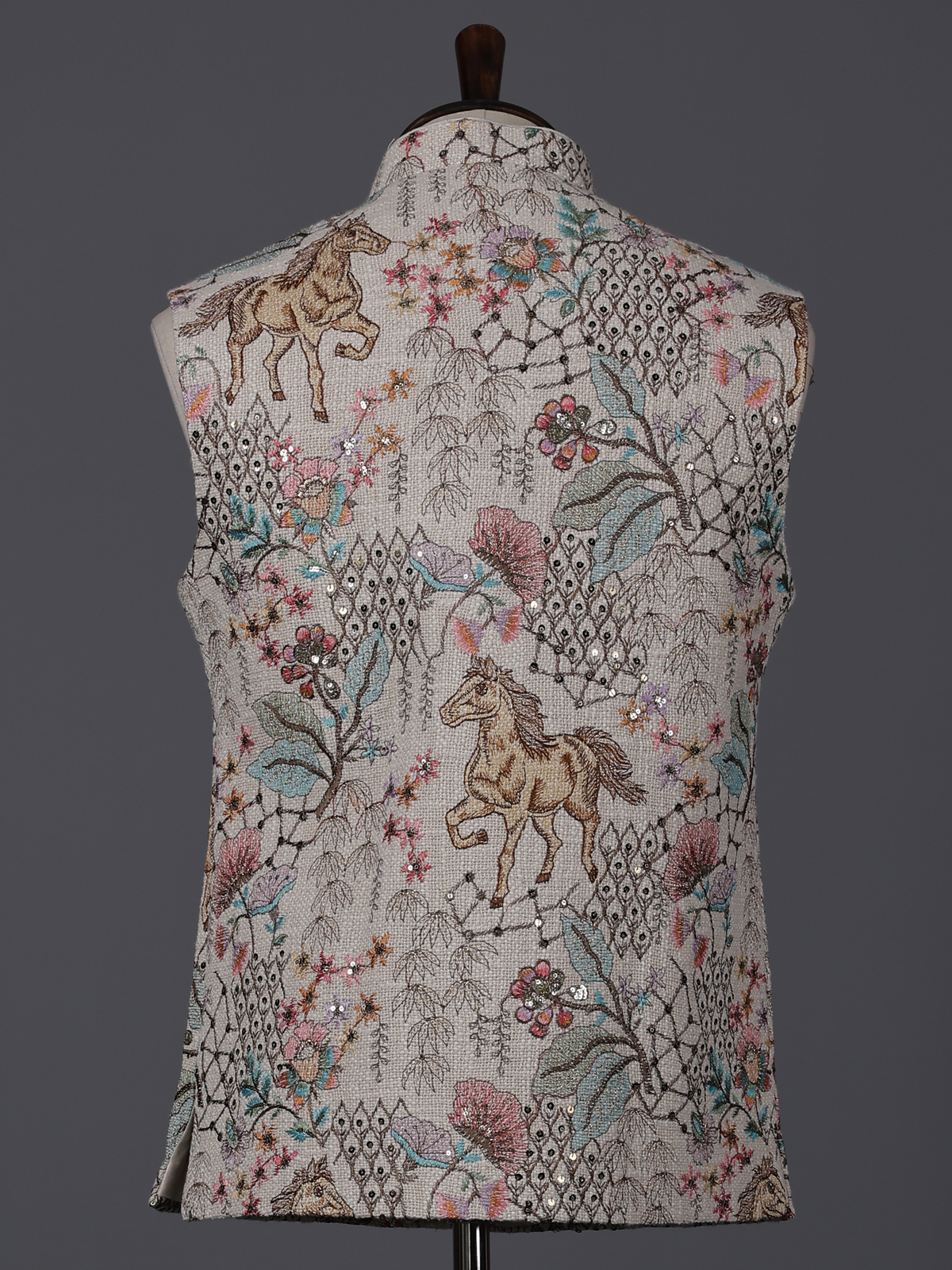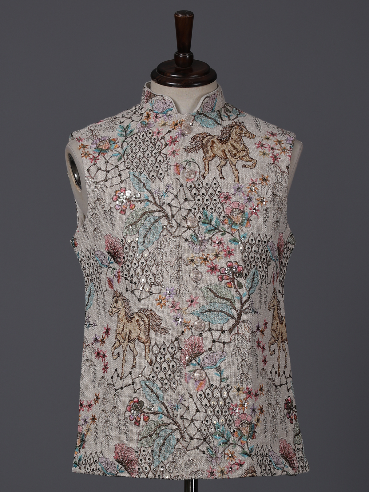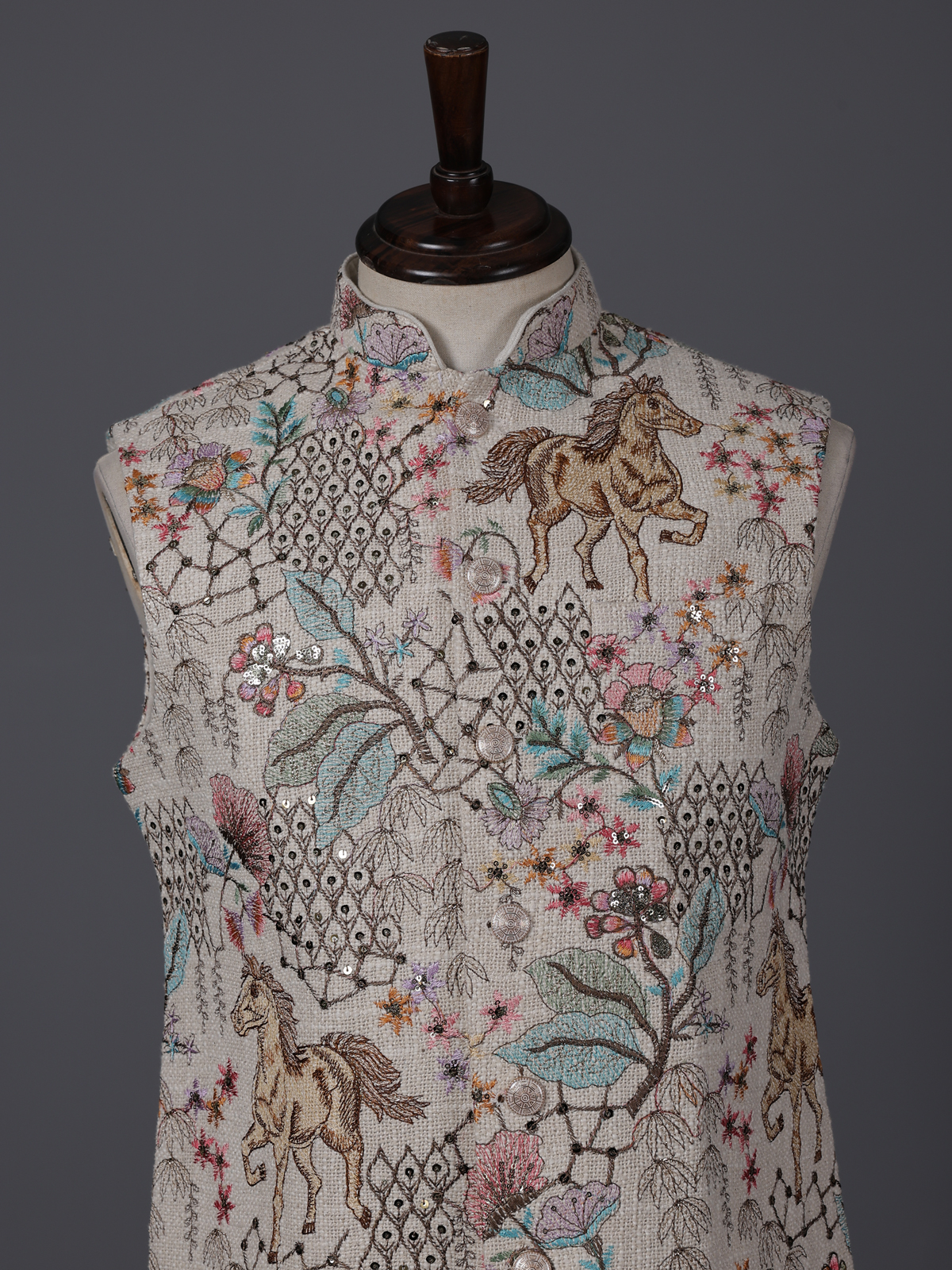 Subtle cream shades highlight the refined beauty of this jute waistcoat crafted for festive charm. Designed with a structured silhouette, it features delicate thread and sequin embellishments that add gentle sparkle. The natural jute texture enhances its elegant appeal, making this waistcoat a versatile and stylish choice for weddings, receptions and traditional celebrations.