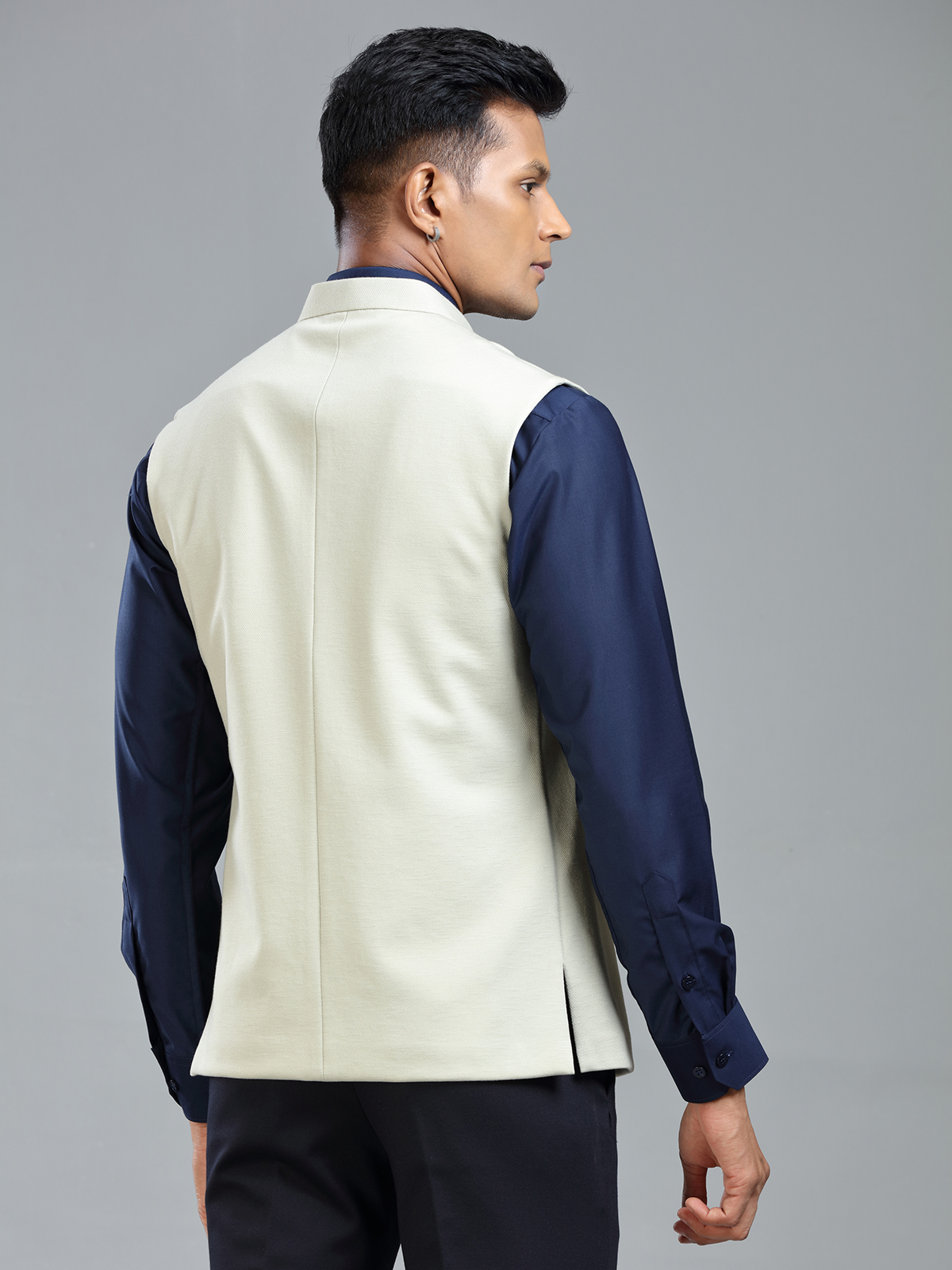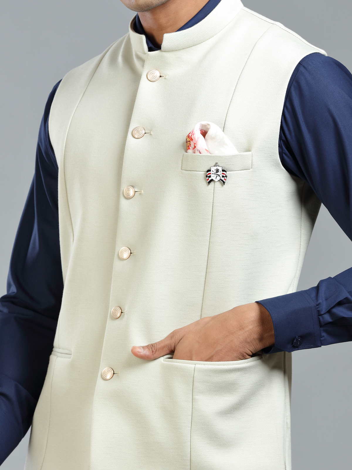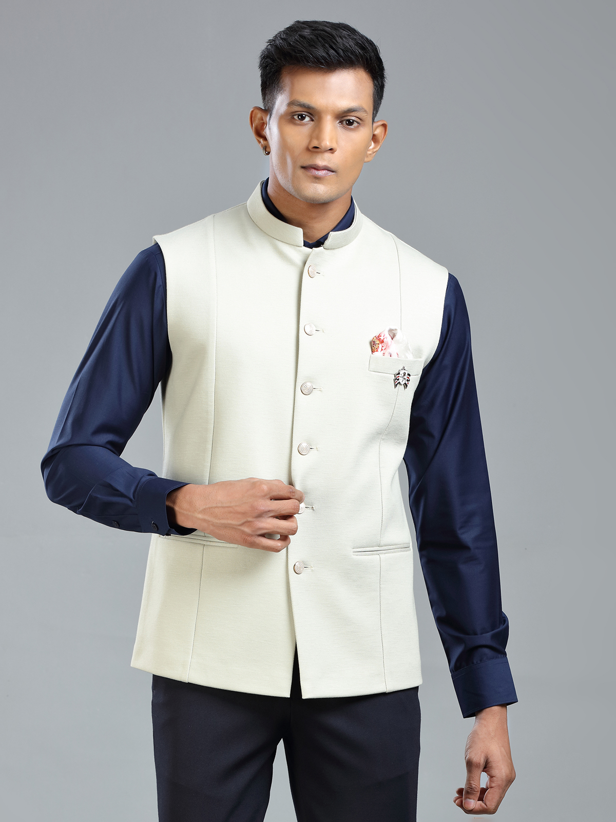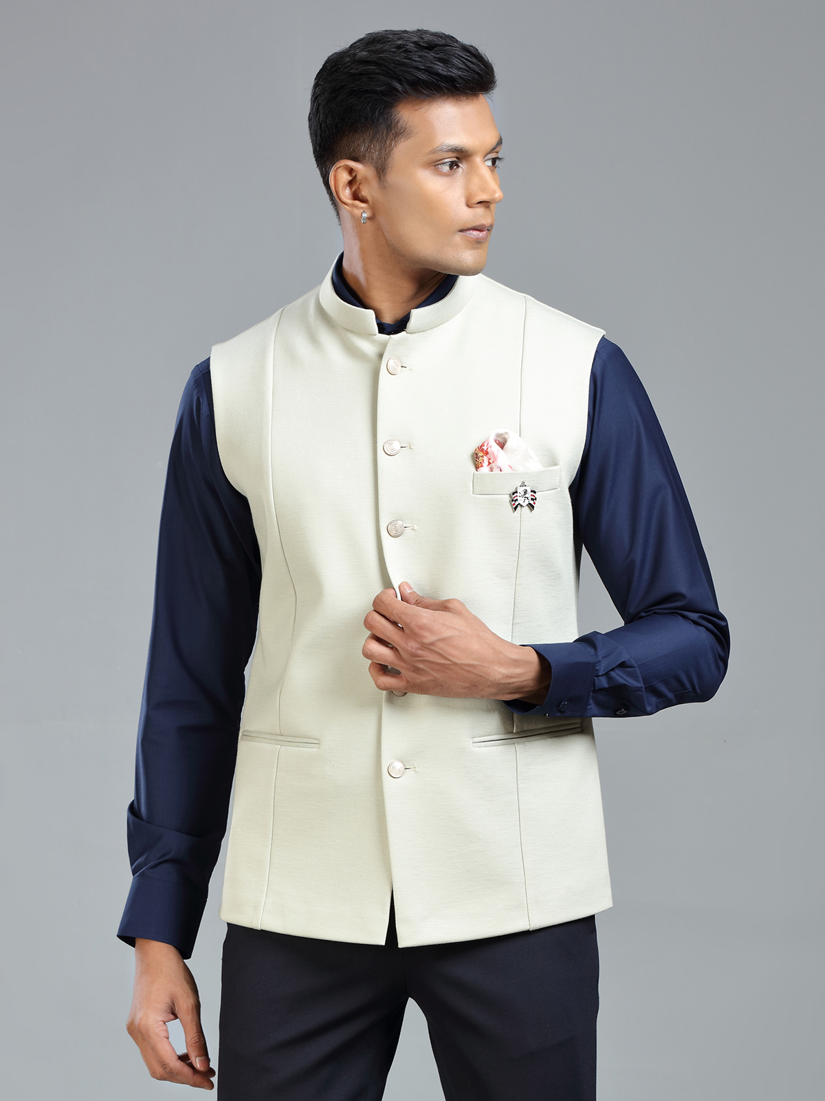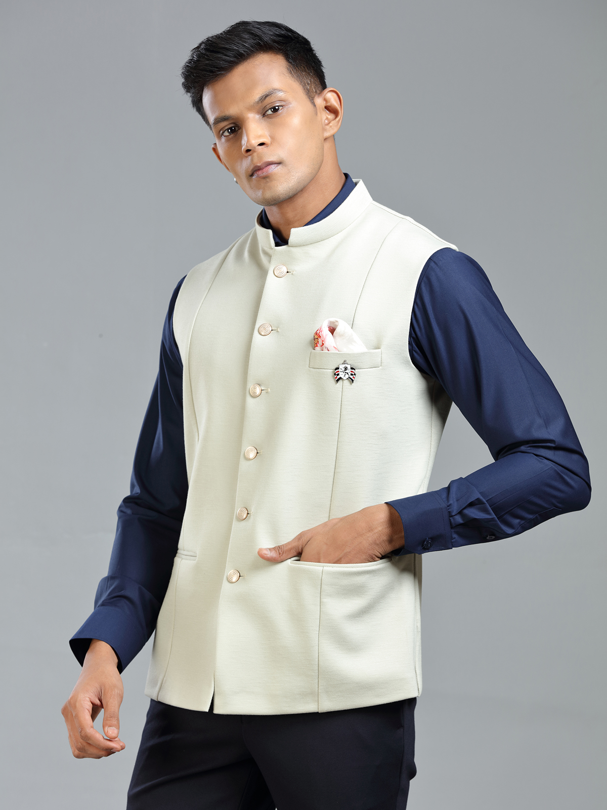 Luxurious and elegant, a cream waistcoat in terry rayon fabric is perfect for weddings and special events. The Bandhgala or Nehru jacket design elevates the luxurious feel, ensuring you look impeccably stylish and refined throughout the celebration. This waistcoat is ideal for men who want to make a sophisticated statement.