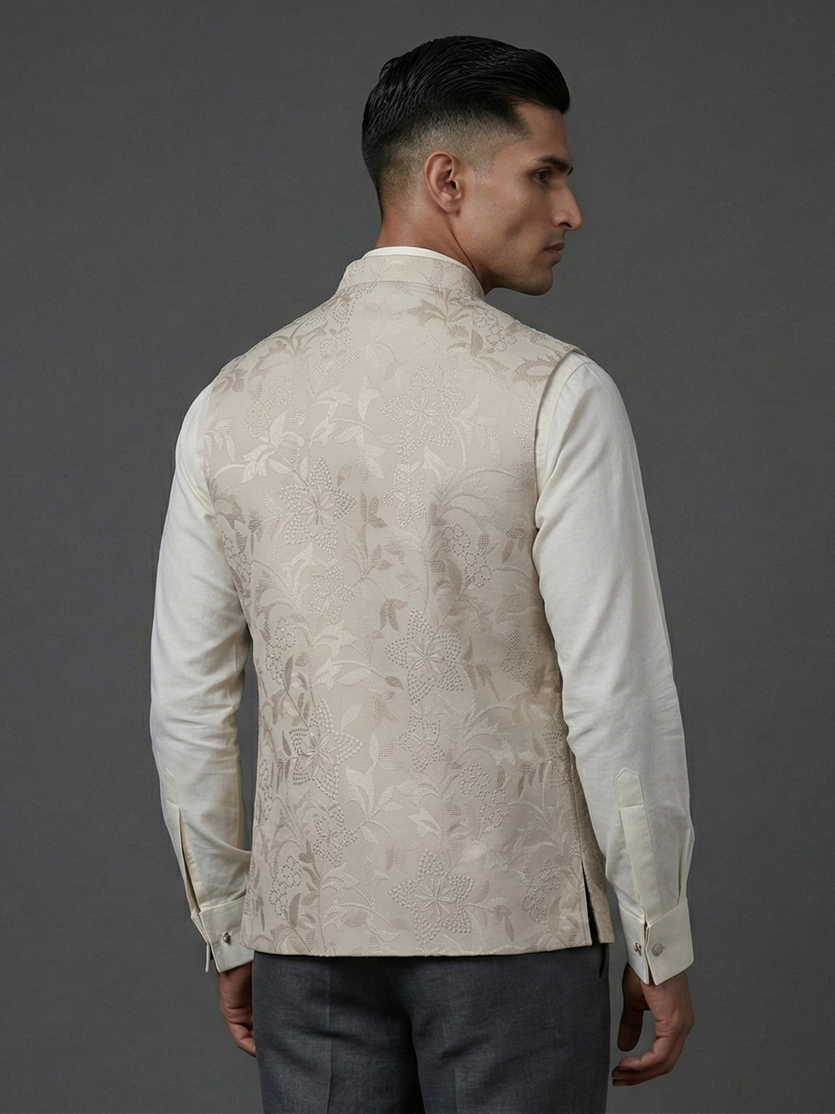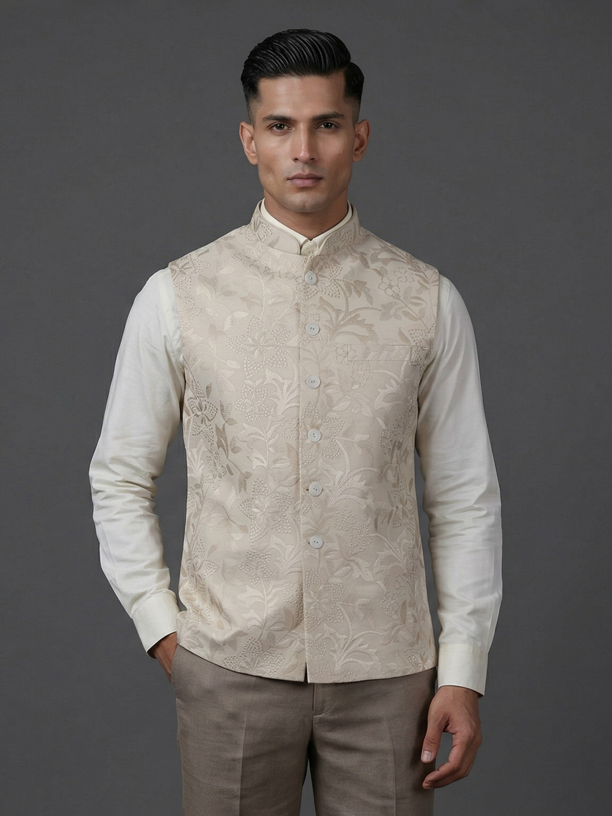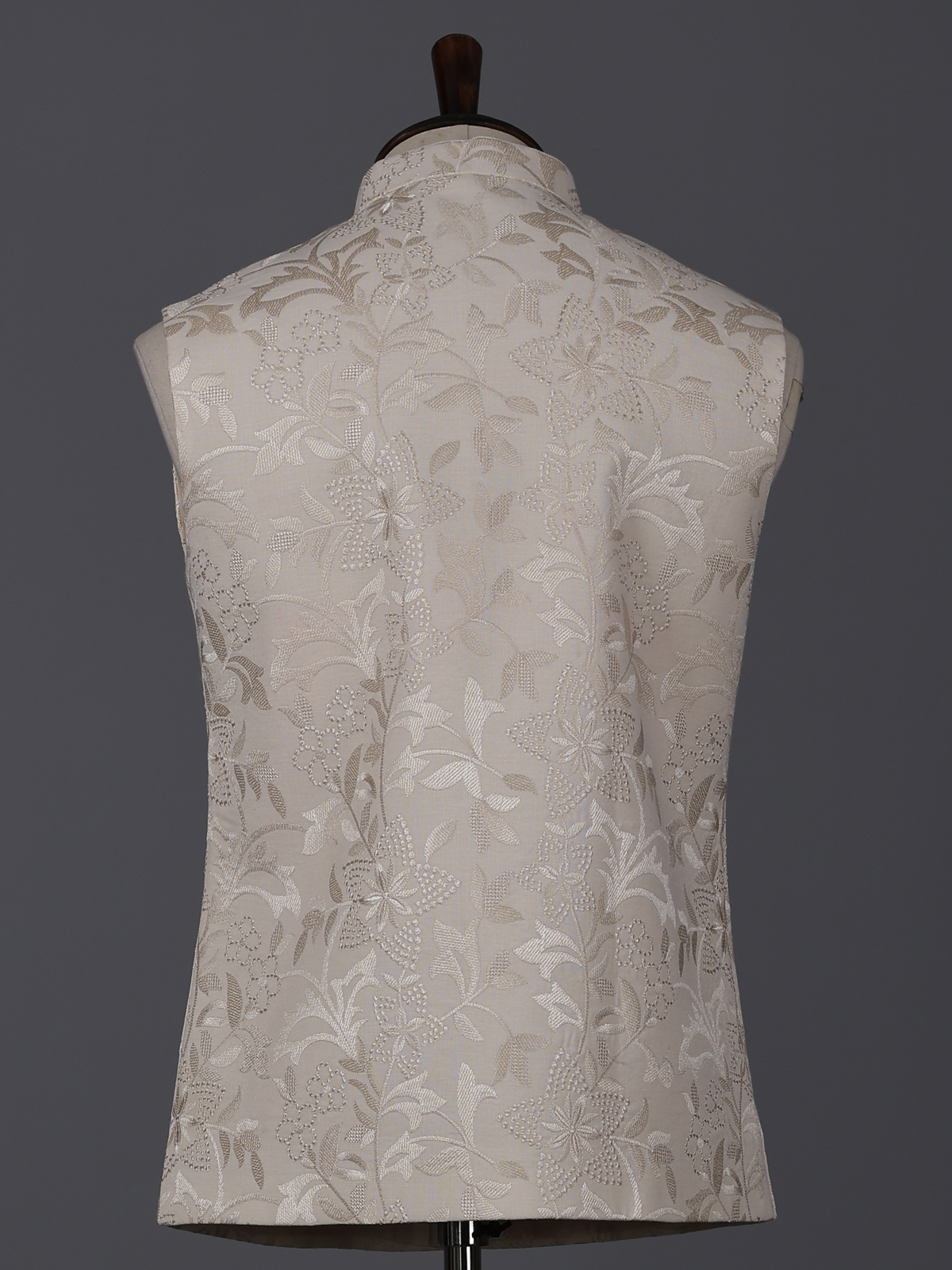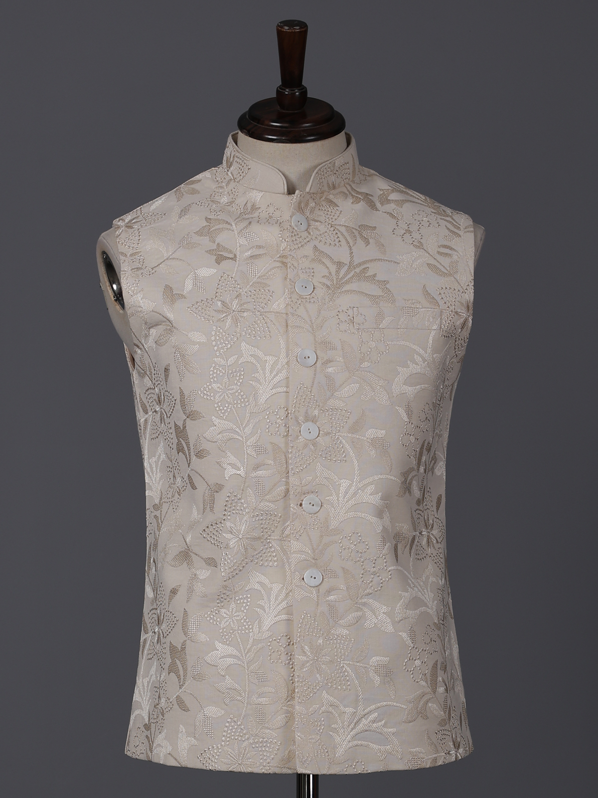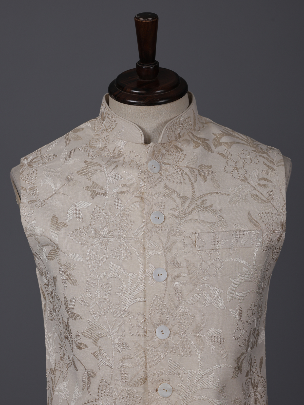 This cream silk embroidery waistcoat is not only stylish but also comfortable, perfect for any occasion. It features a mandarin collar, full buttoned placket and sleeveless pattern, adding functionality to your wardrobe.