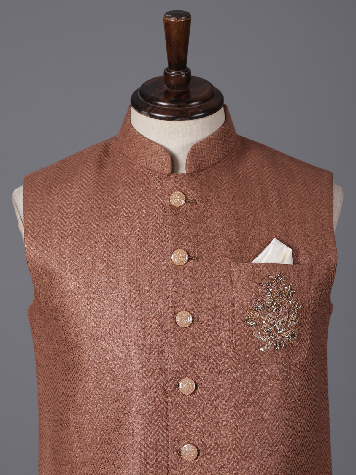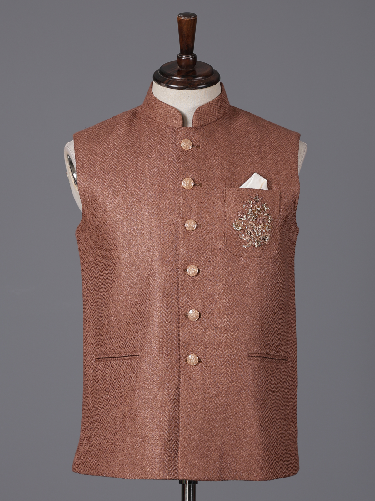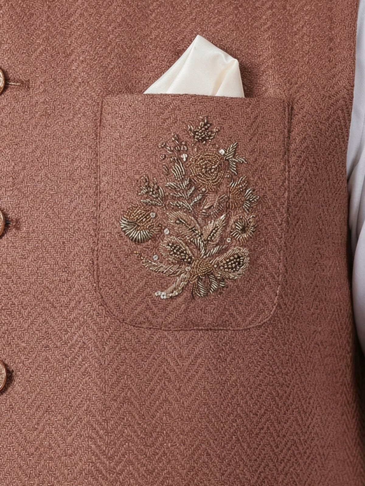 Warm light brown tones highlight the understated charm of this cotton waistcoat designed with a subtle textured finish. Adorned with thread, sequins, beads and zardosi detailing on the pocket. It reflects refined artistry. The structured silhouette ensures a polished look. Perfect for weddings, receptions and festive gatherings. This waistcoat blends elegance with timeless ethnic style.