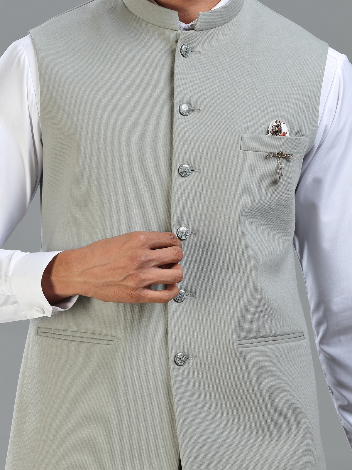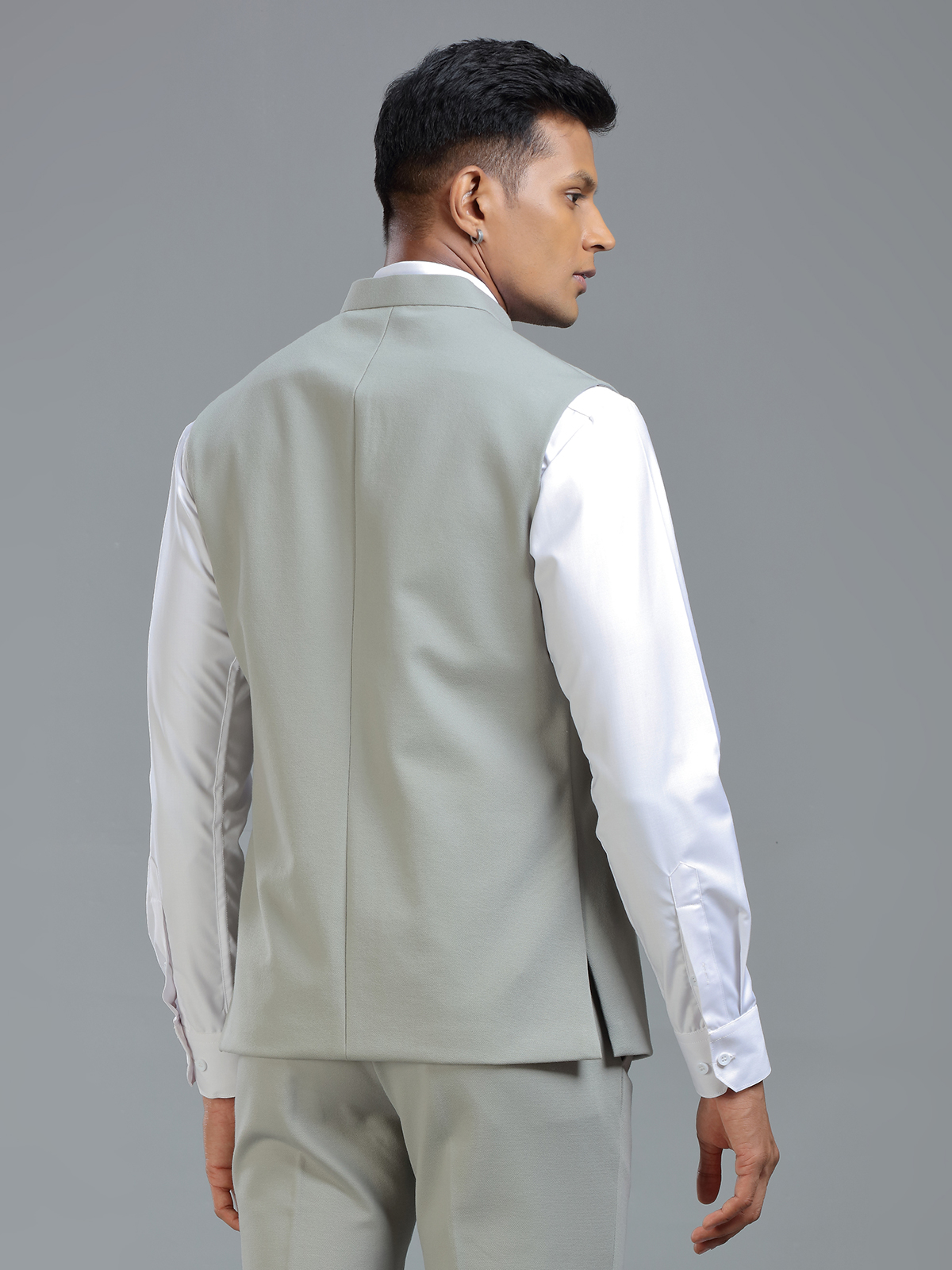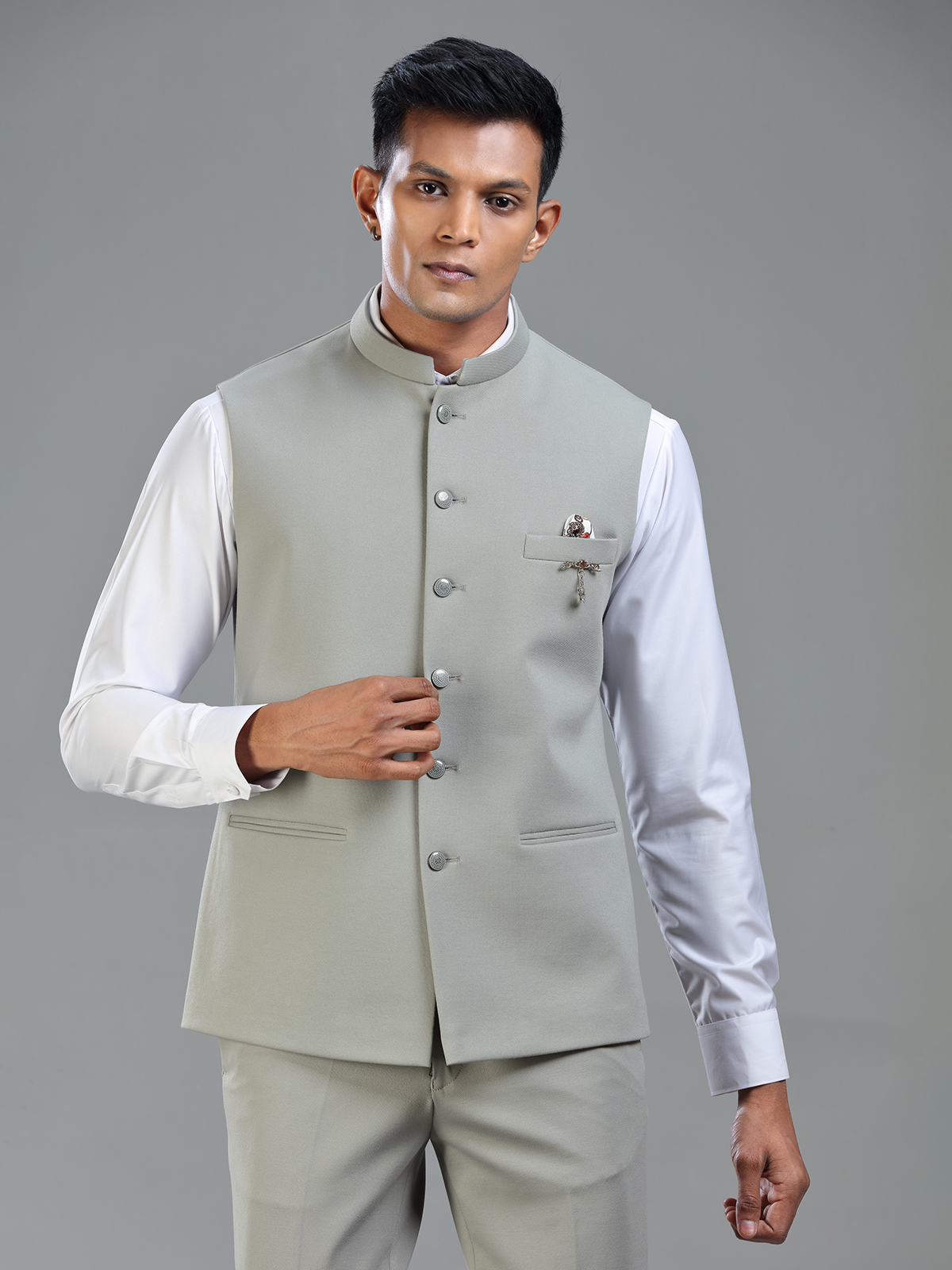 A light grey waistcoat made from terry rayon fabric combines minimalist design with a hint of sophistication. Its clean Bandhgala or Nehru jacket cut enhances its versatility, ensuring you look both stylish and comfortable for weddings and special occasions. This piece is ideal for those who appreciate simplicity with a touch of elegance.