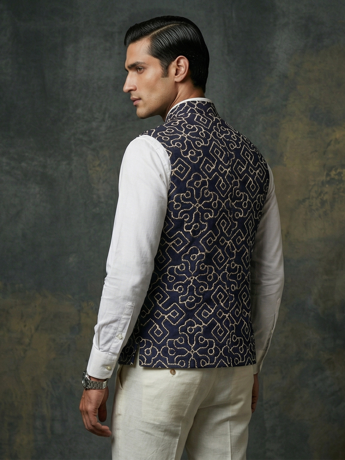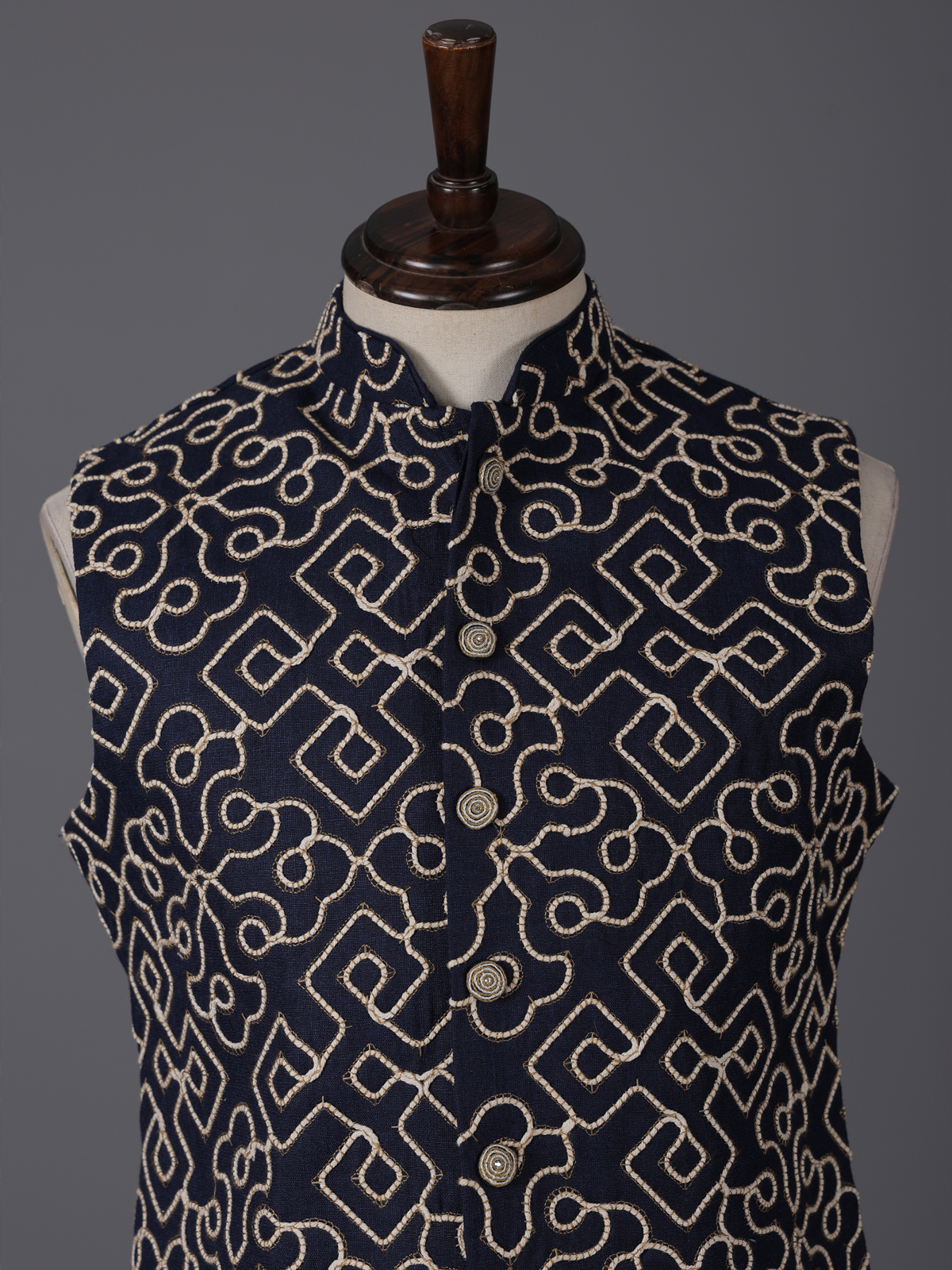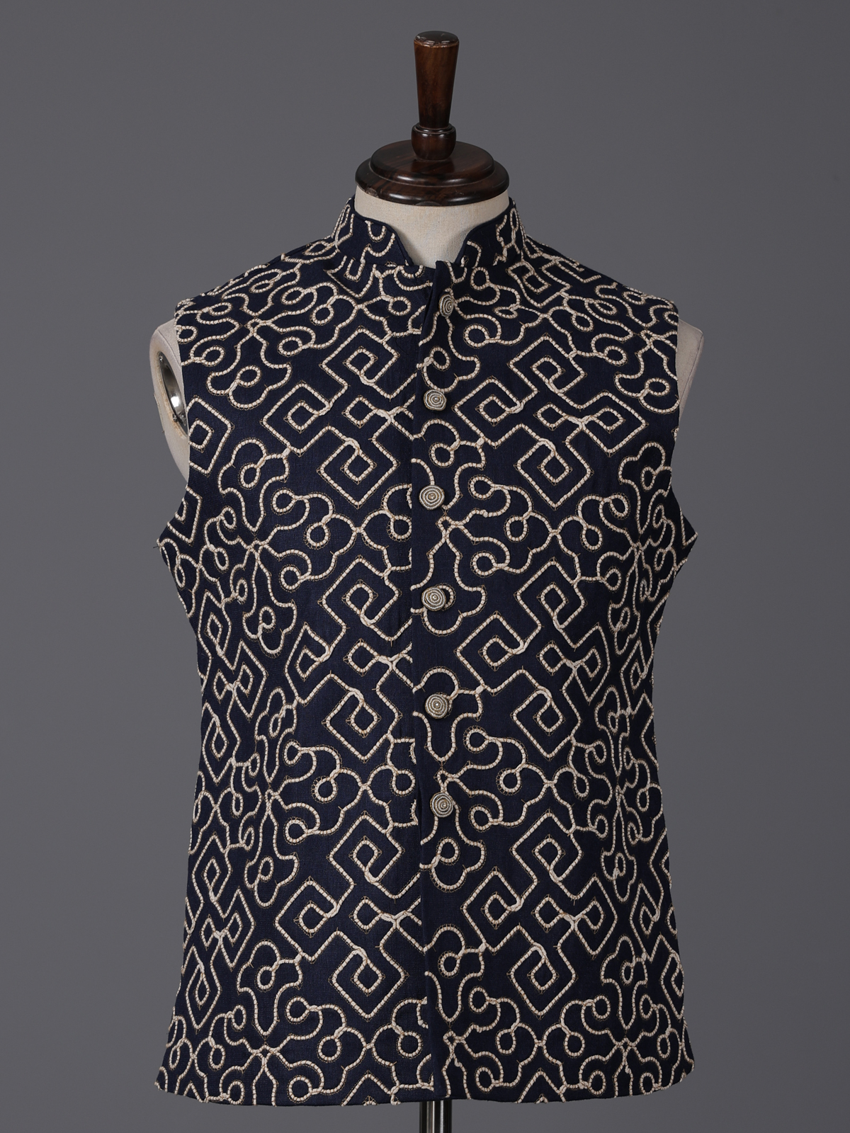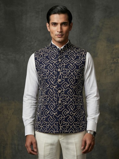 Classic navy blue defines the sophistication of this cotton waistcoat designed for wedding and festive occasions. Enhanced with delicate thread work. It showcases understated artistry and timeless charm. The tailored fit adds structure, while the lightweight fabric ensures ease of wear. Layered over a kurta. This waistcoat delivers a sharp and elegant ethnic statement for special celebrations.