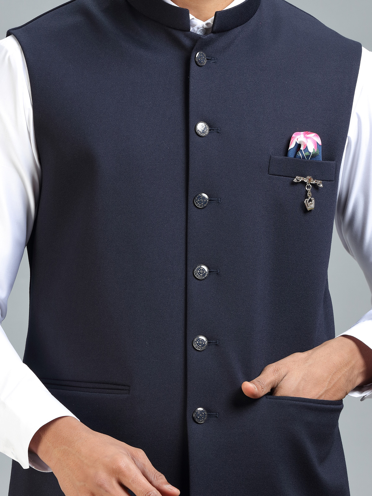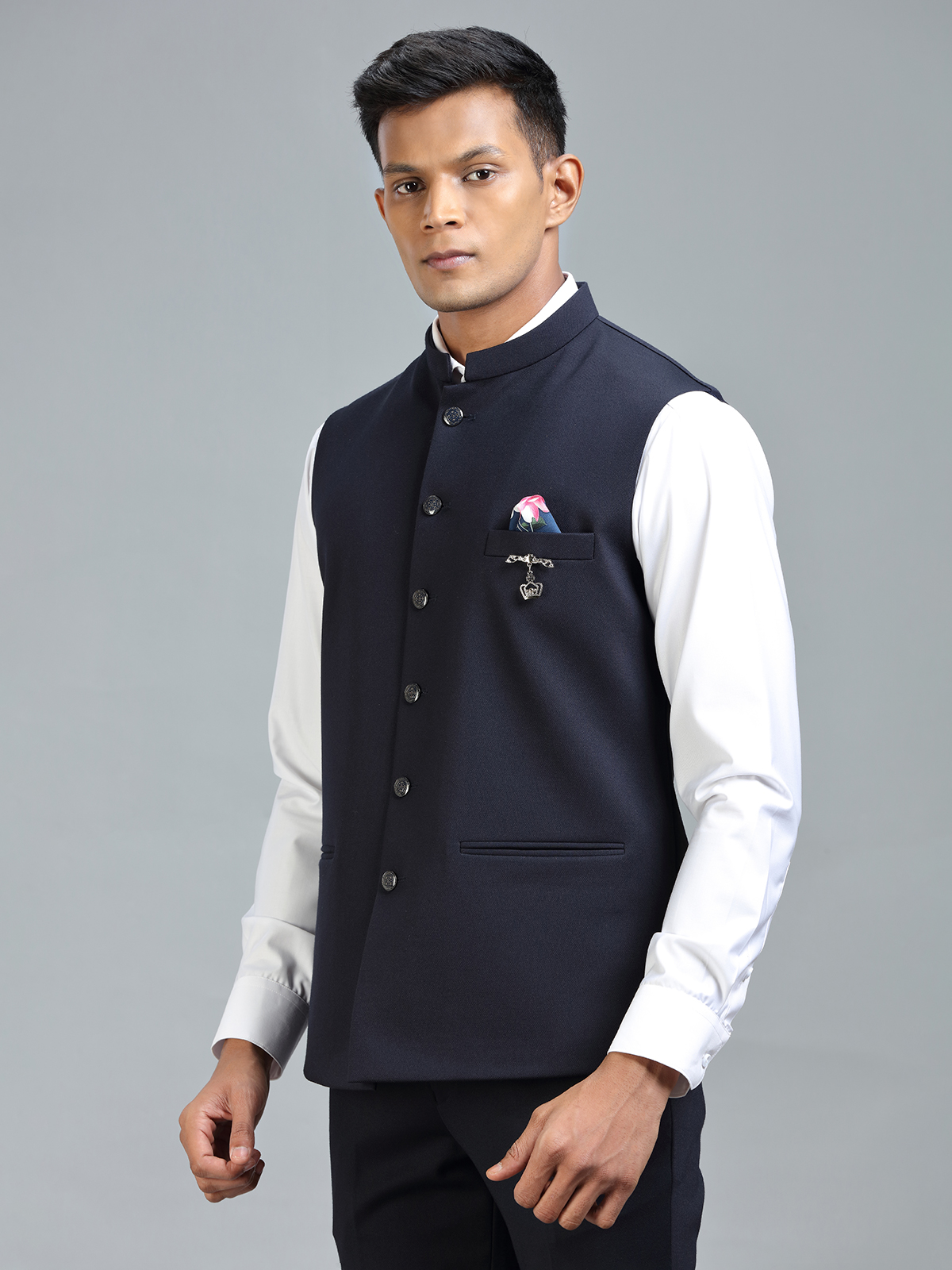 Navy is the perfect color for a classic and refined look. This navy waistcoat, crafted from terry rayon fabric, combines the Bandhgala or Nehru jacket silhouette with deep blue tones, making it an excellent choice for weddings, festivals, and other special events. This waistcoat exudes timeless style while embracing modern elegance.