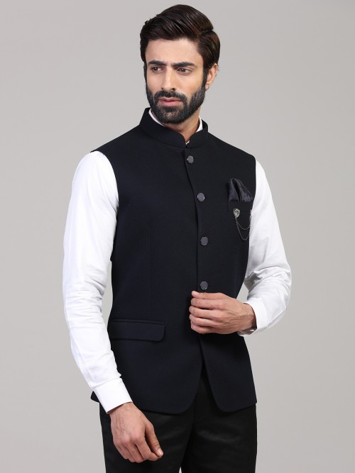 This solid navy knitted party wear waistcoat has a simple design with a stand collar, full buttoned placket, welt pocket, sleeveless and vented hem, perfect for a refined look.
