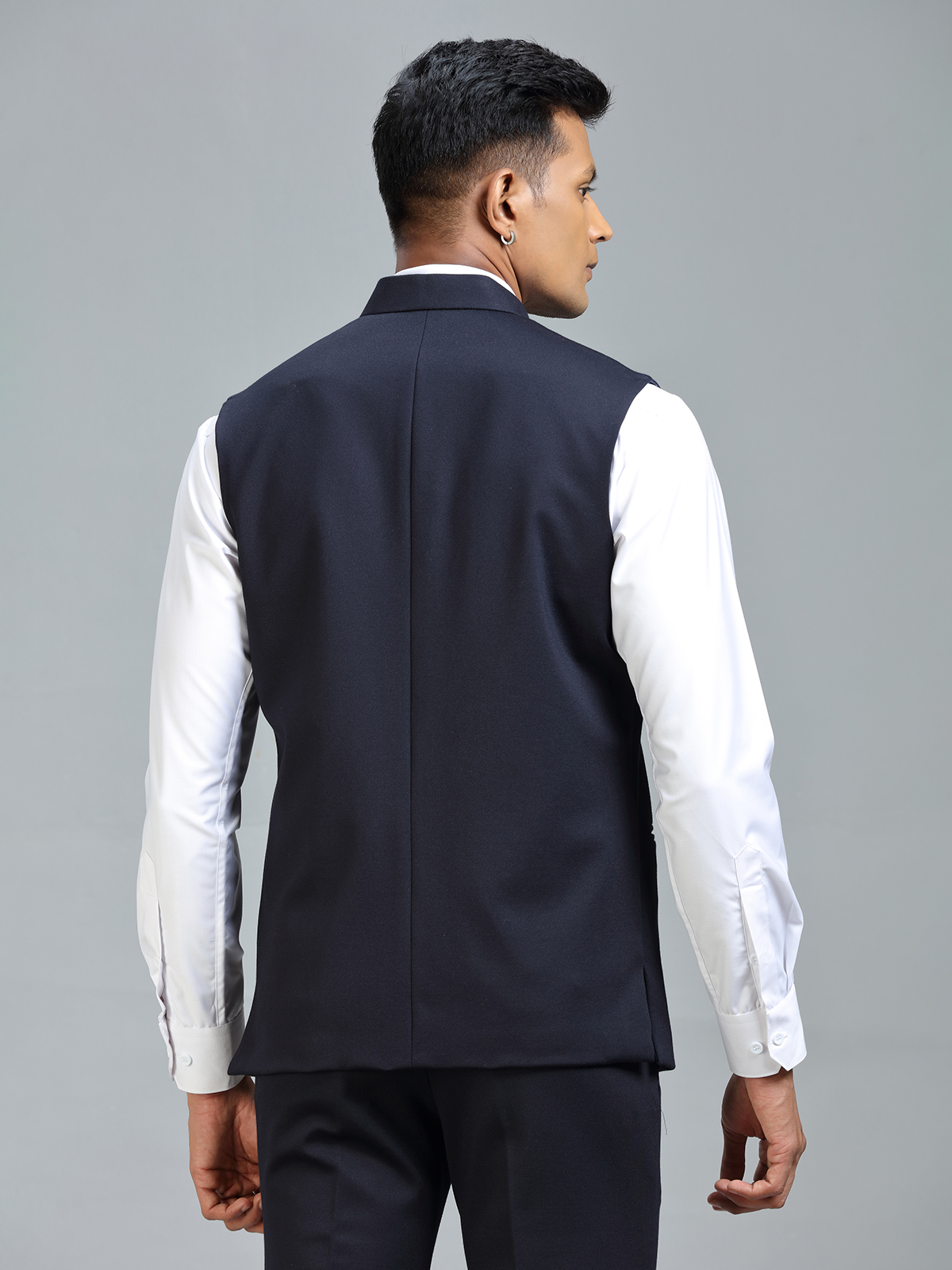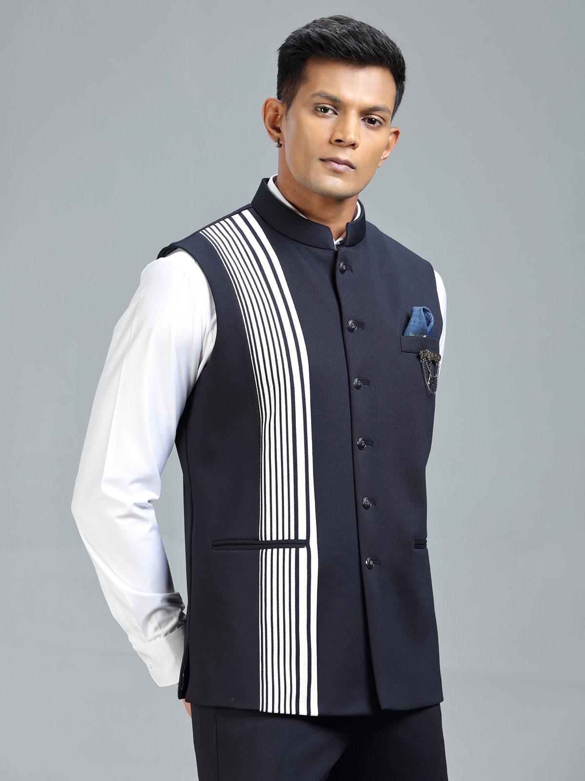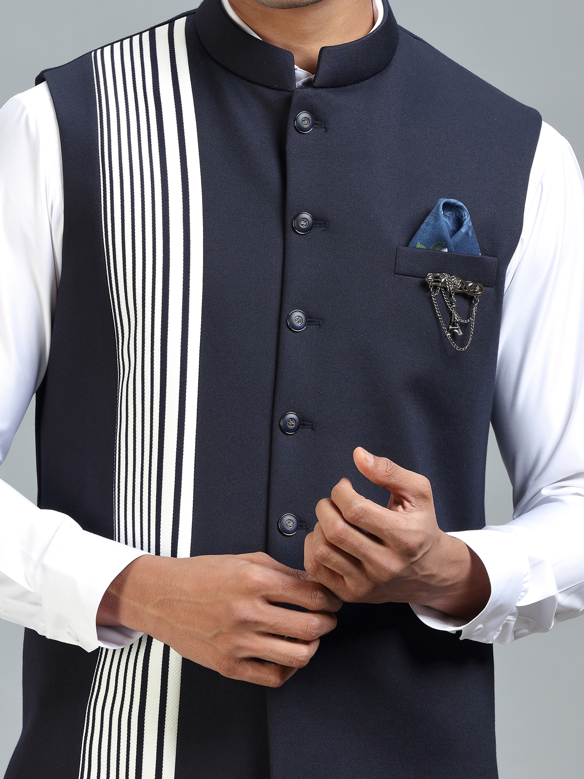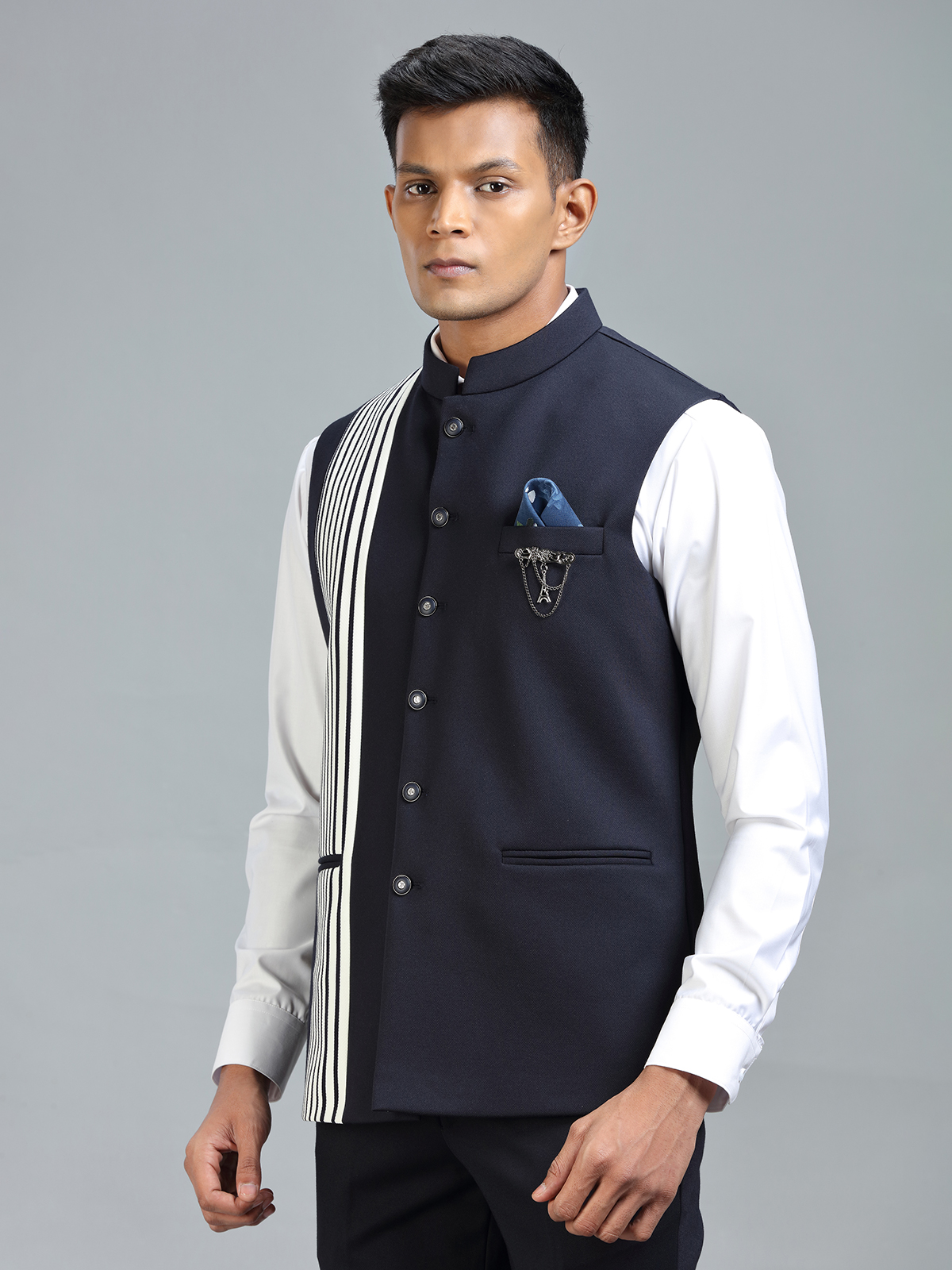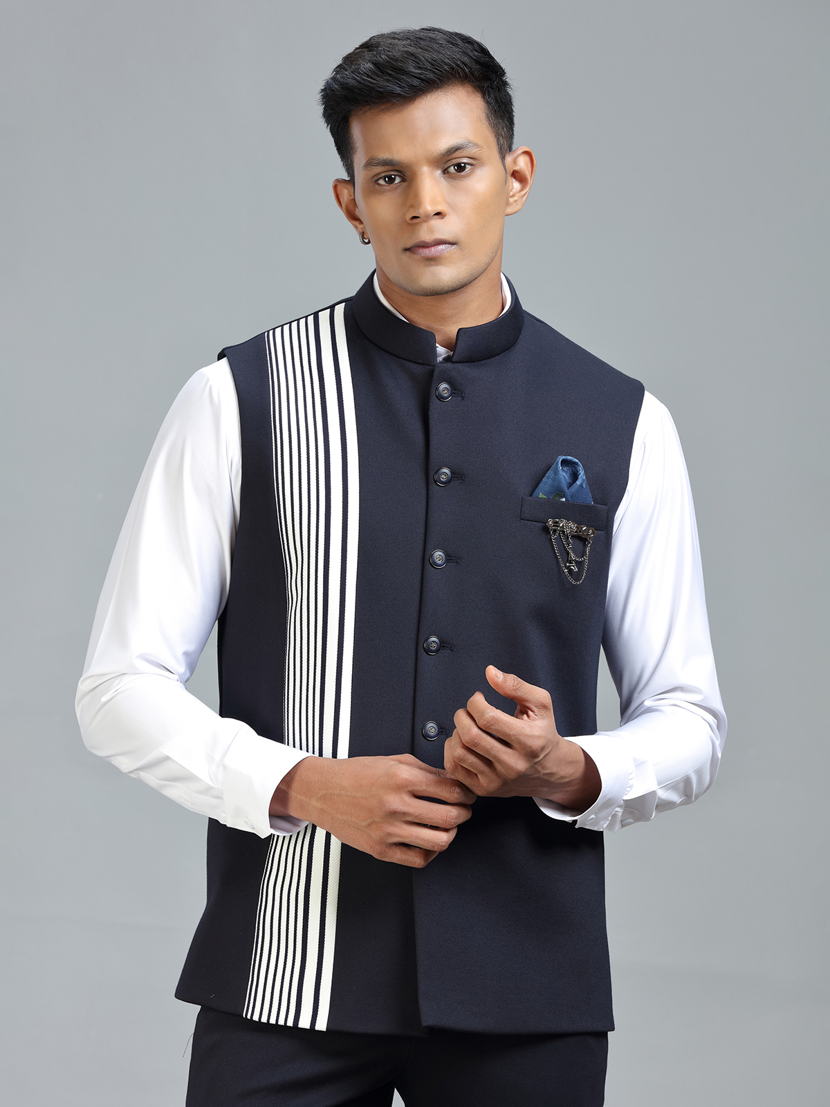 The navy striped waistcoat made from terry rayon fabric combines timeless elegance with a modern twist. The Bandhgala or Nehru jacket design ensures you look sharp and sophisticated for weddings, festivals, and other special occasions. The subtle stripes add a touch of contemporary style to the classic navy hue, making it a versatile wardrobe staple.