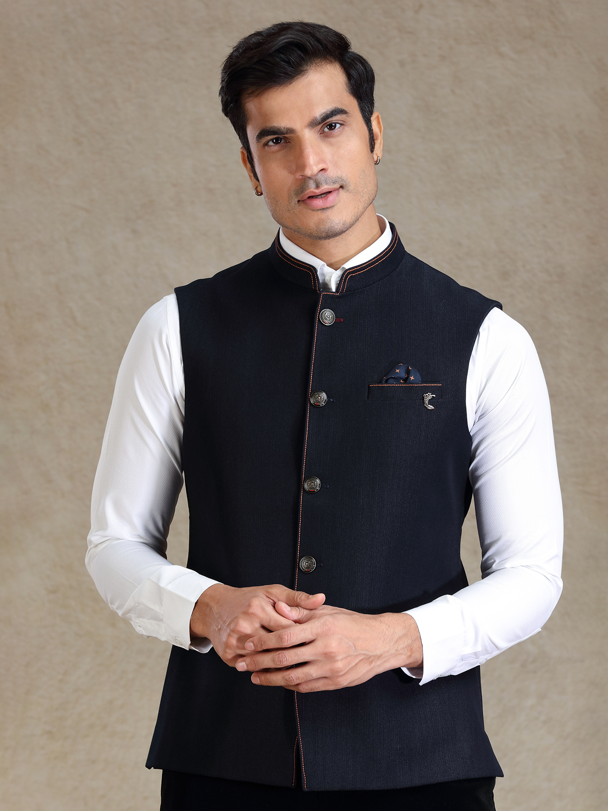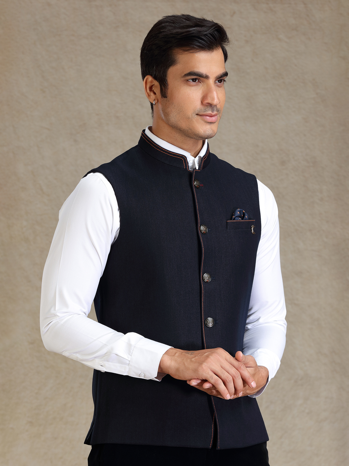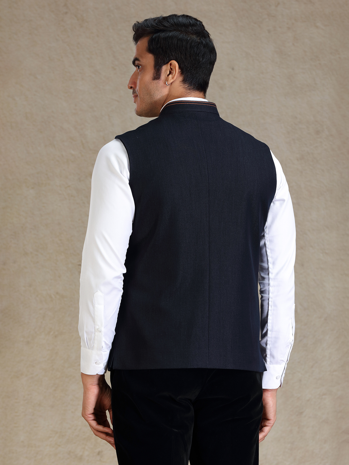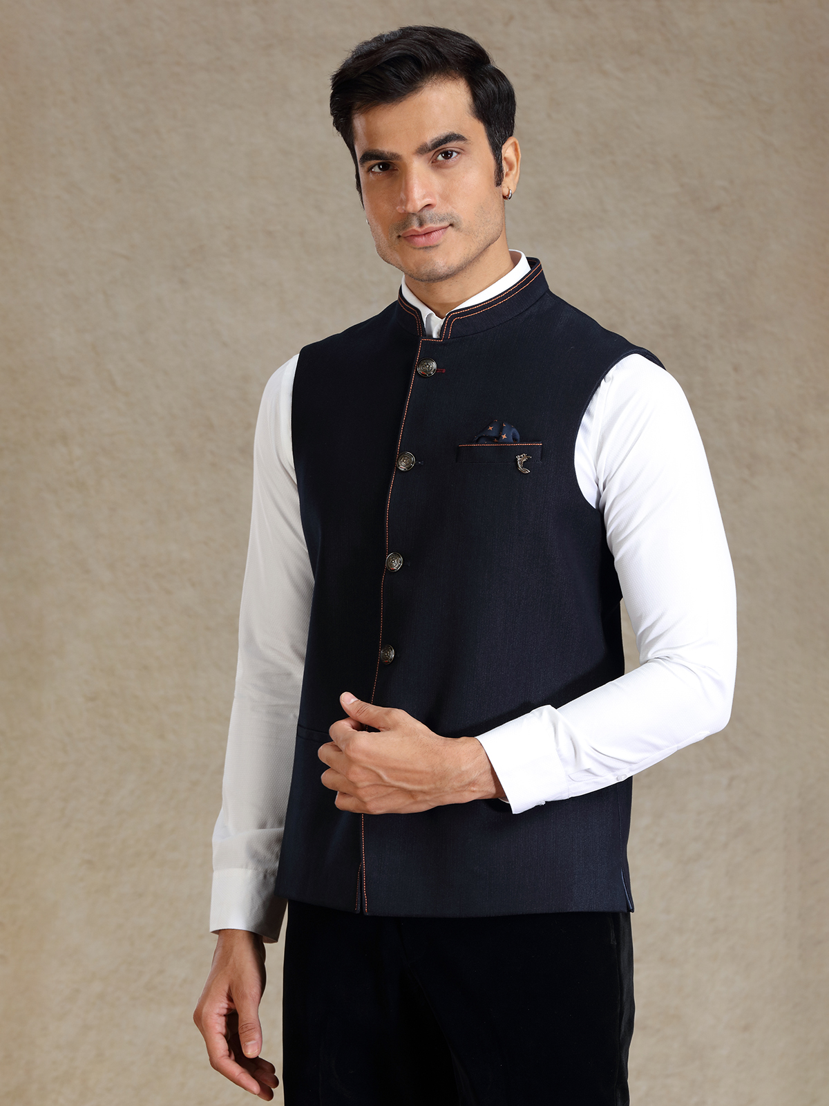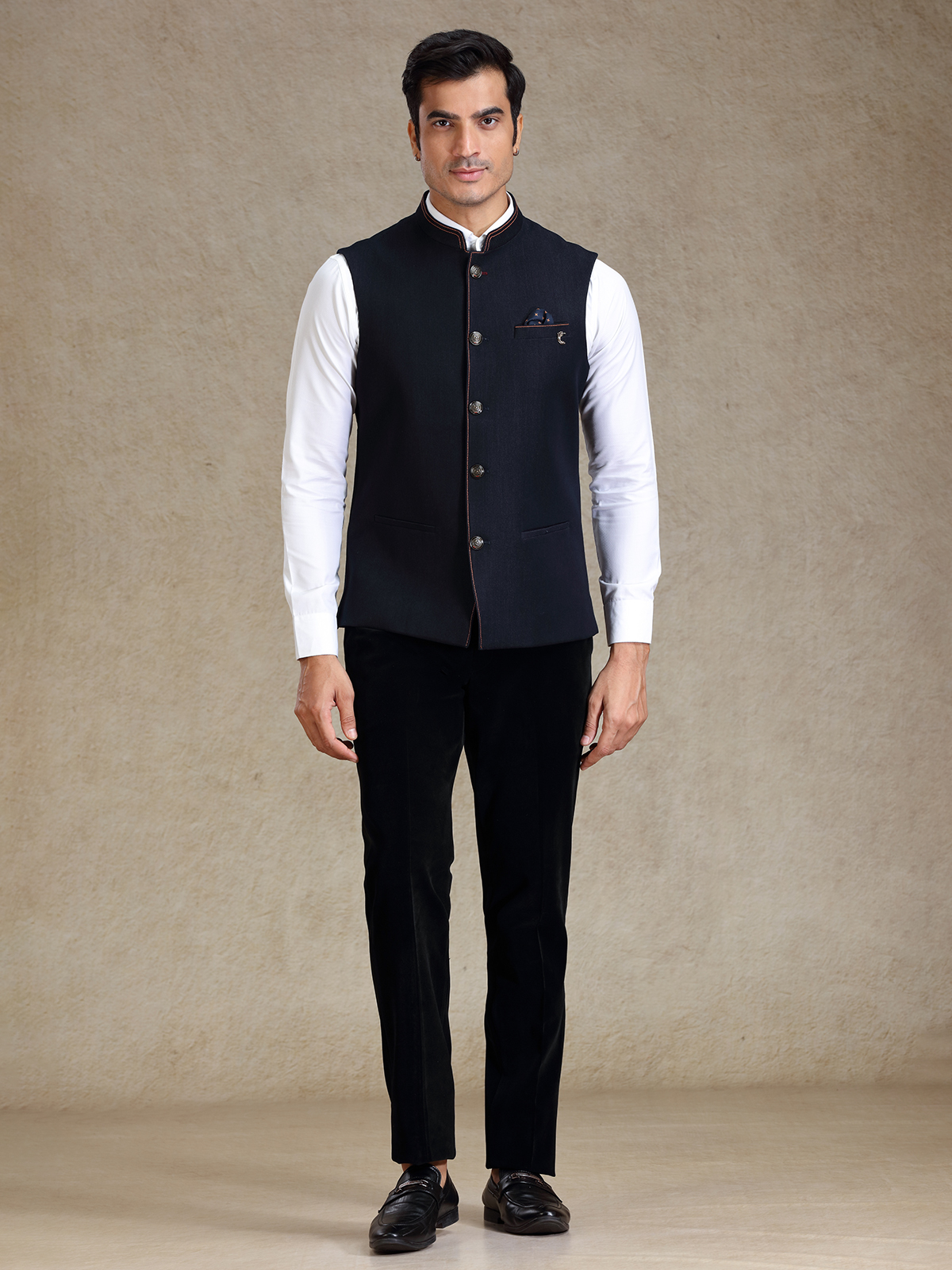 Versatile and refined, this navy waistcoat crafted from terry rayon textured fabric fits seamlessly into any festive wardrobe. The Bandhgala or Nehru jacket design ensures a smart, comfortable look for weddings and special events. Please note, the waistcoat is sold separately; shirt and pants are for styling purposes.