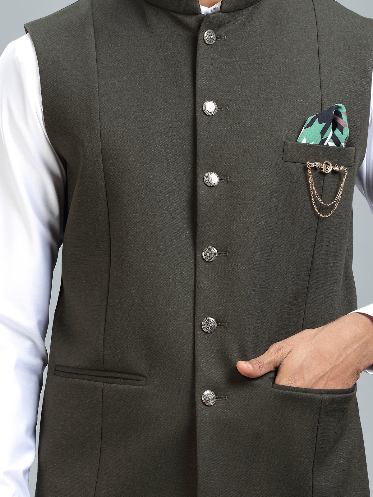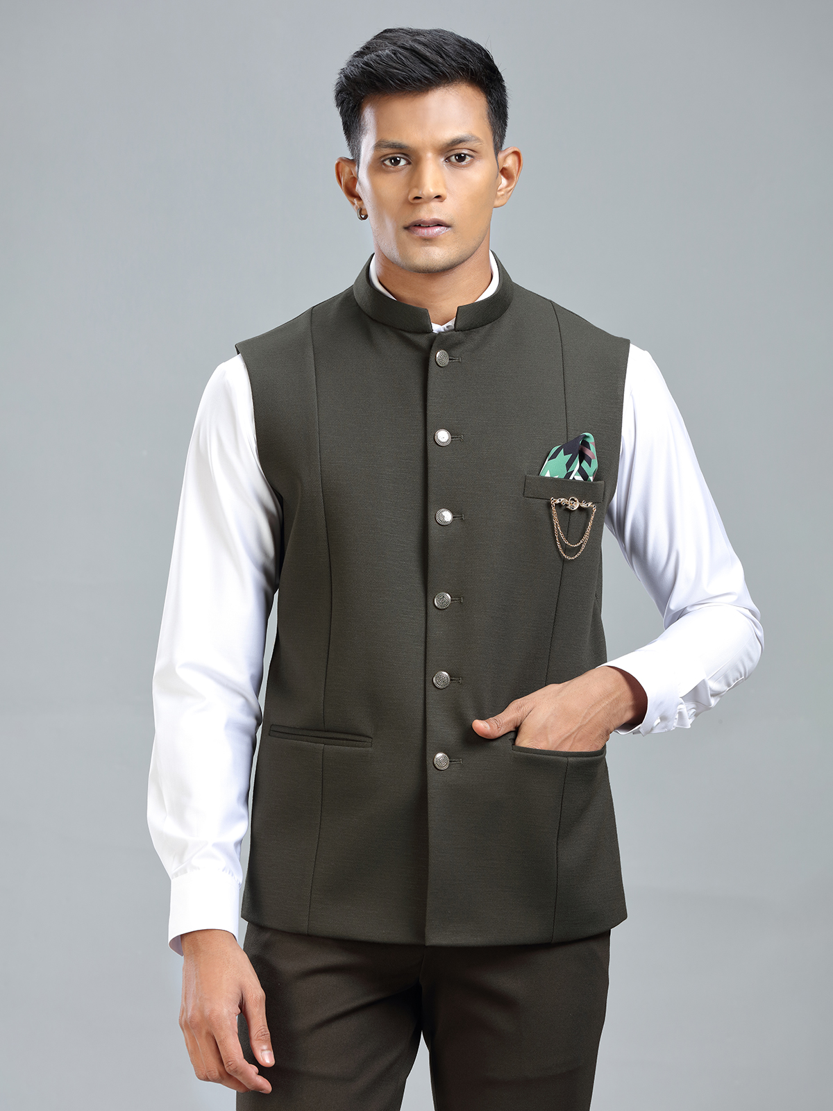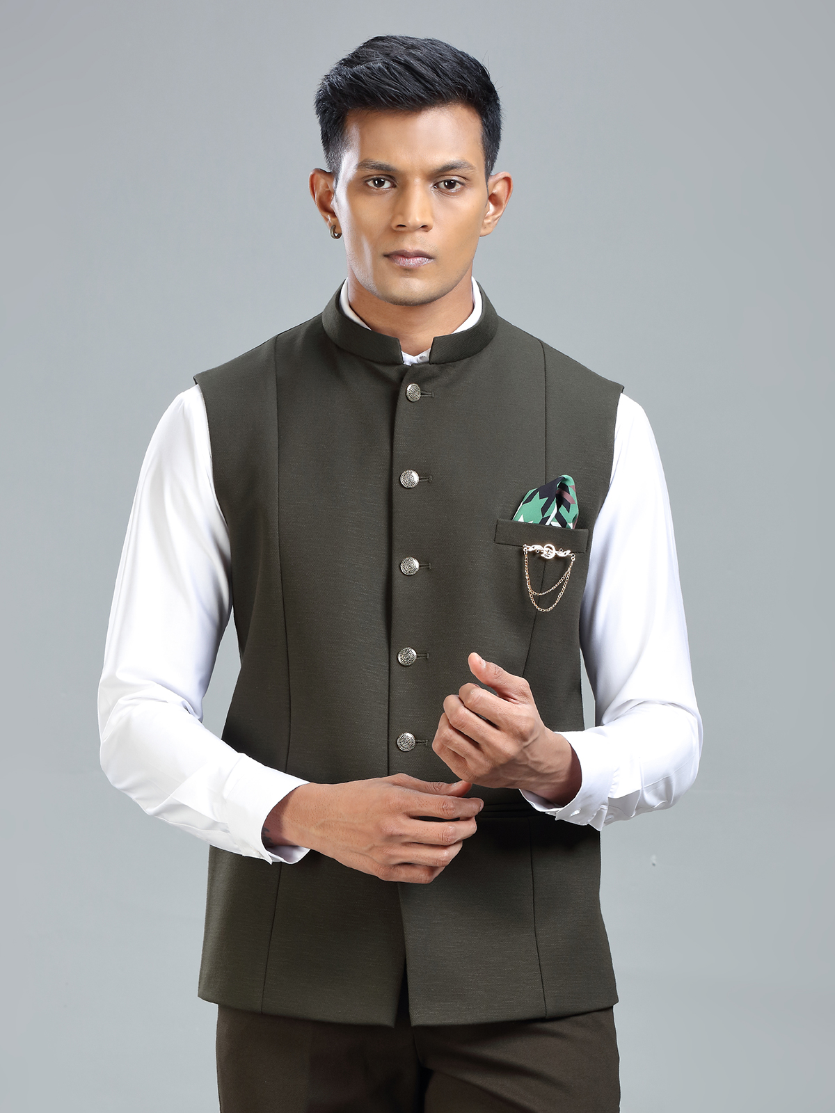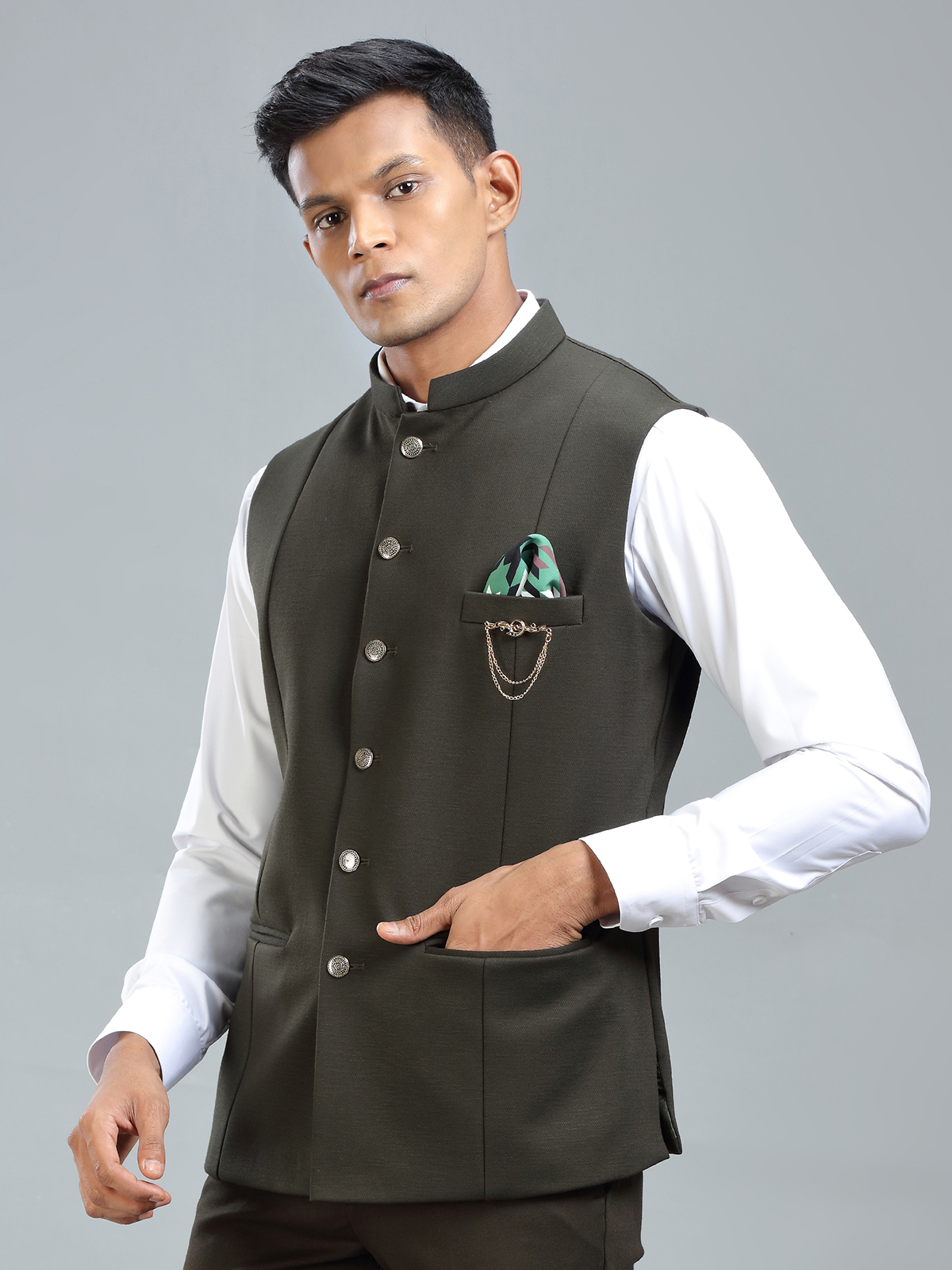 Olive green offers a unique earthy tone that adds a cool, modern flair to your festive wardrobe. Crafted from terry rayon fabric, this waistcoat’s Bandhgala or Nehru jacket design gives it a sharp, stylish look, making it ideal for weddings, festivals, and other celebratory events where you want to make a refined yet contemporary statement.