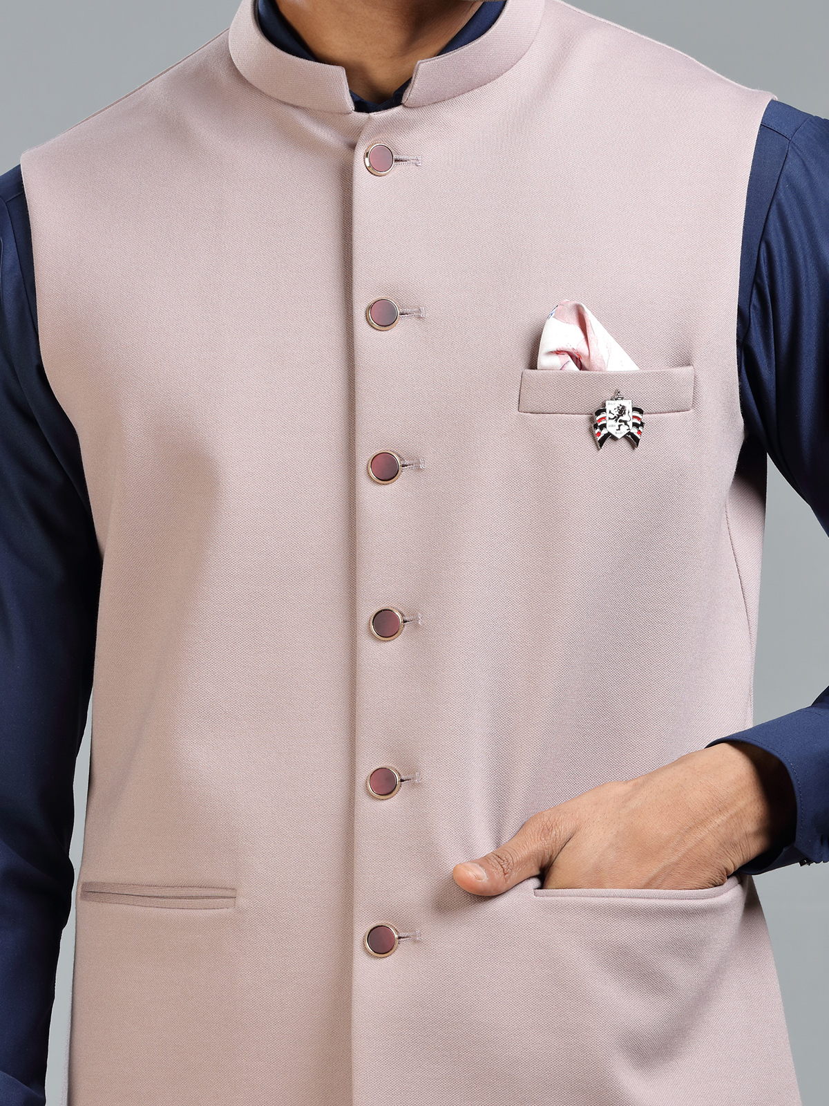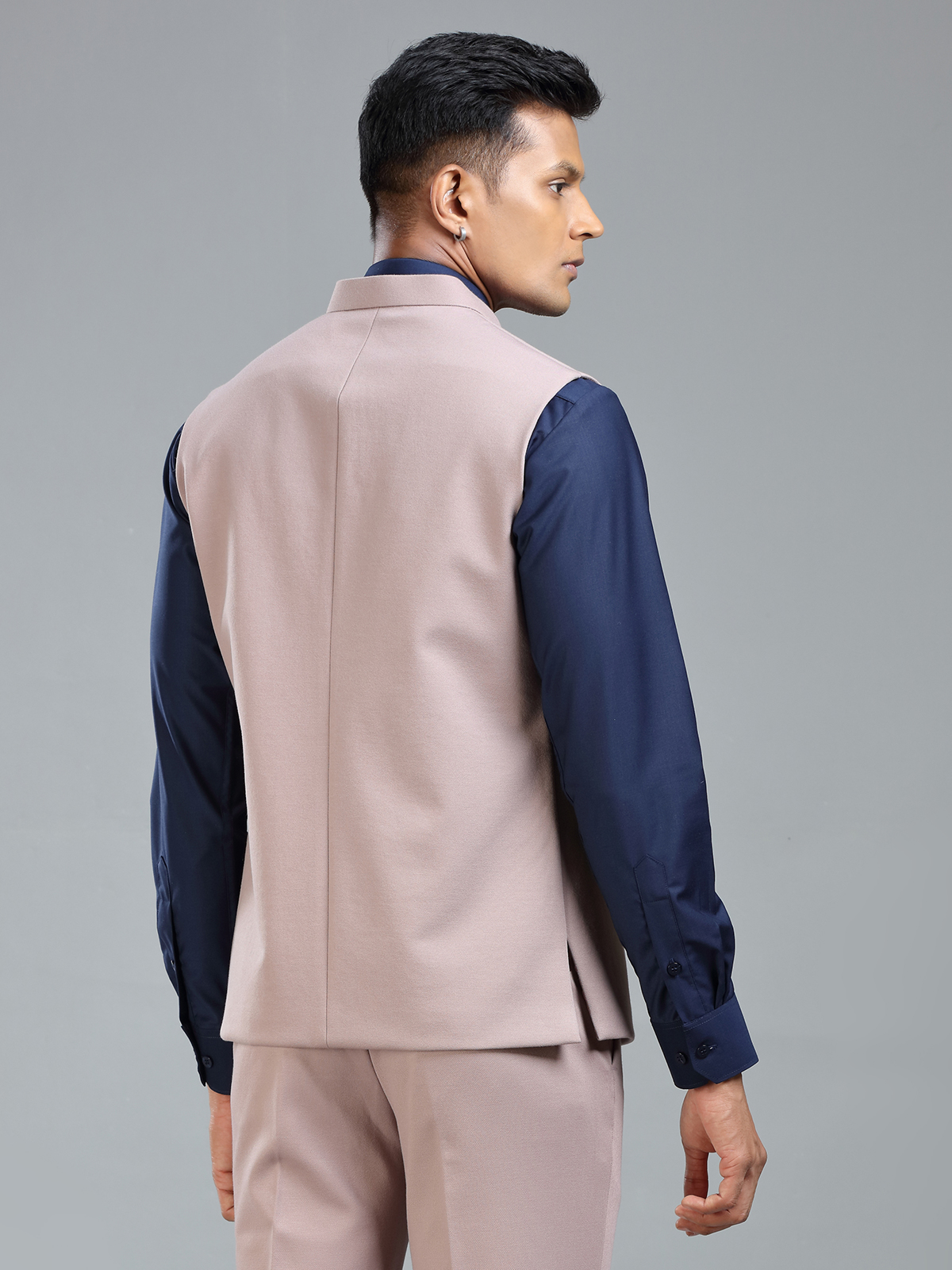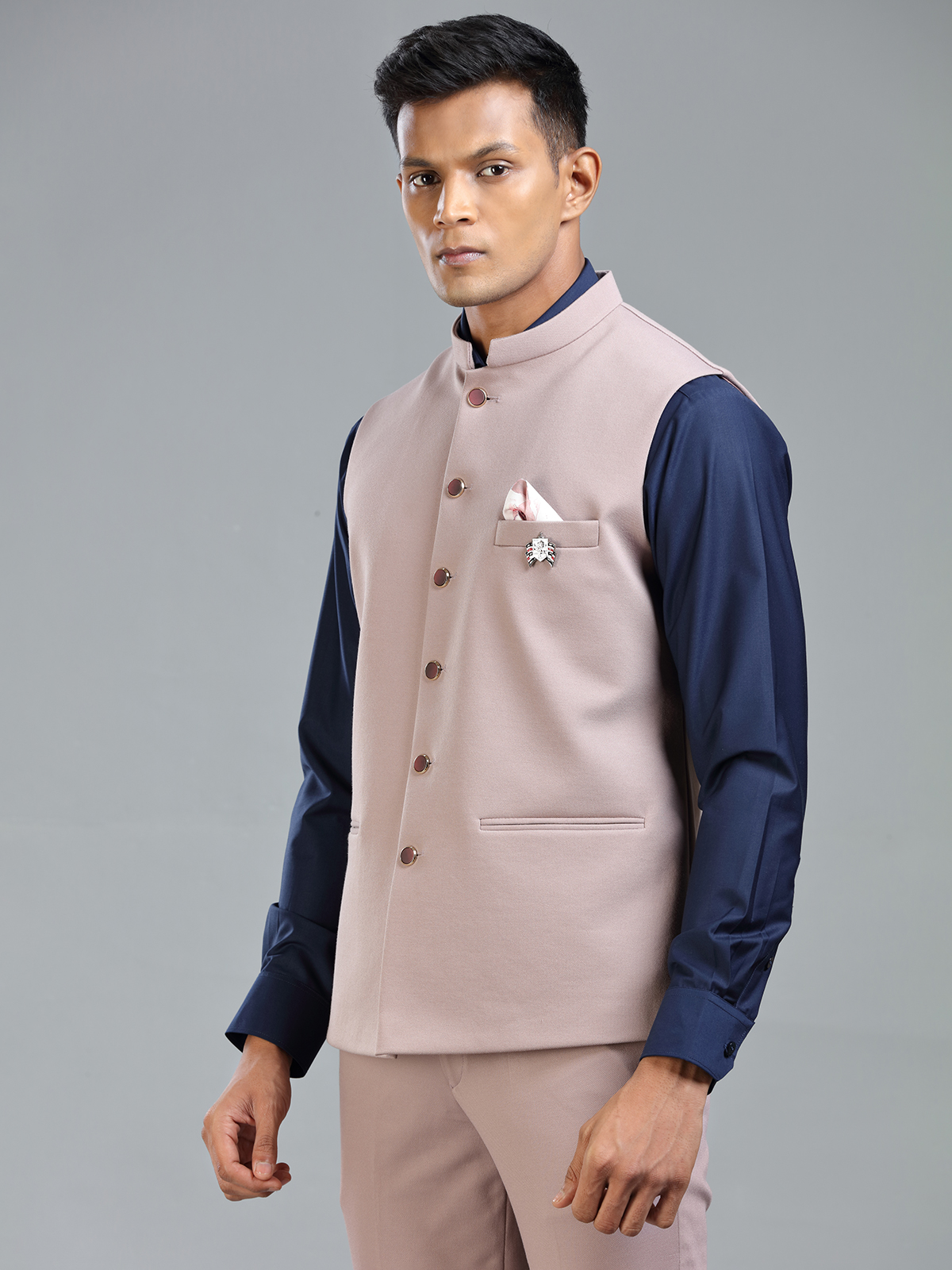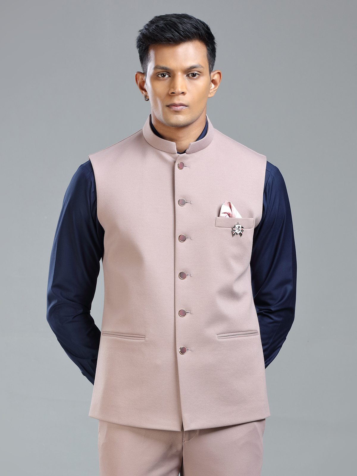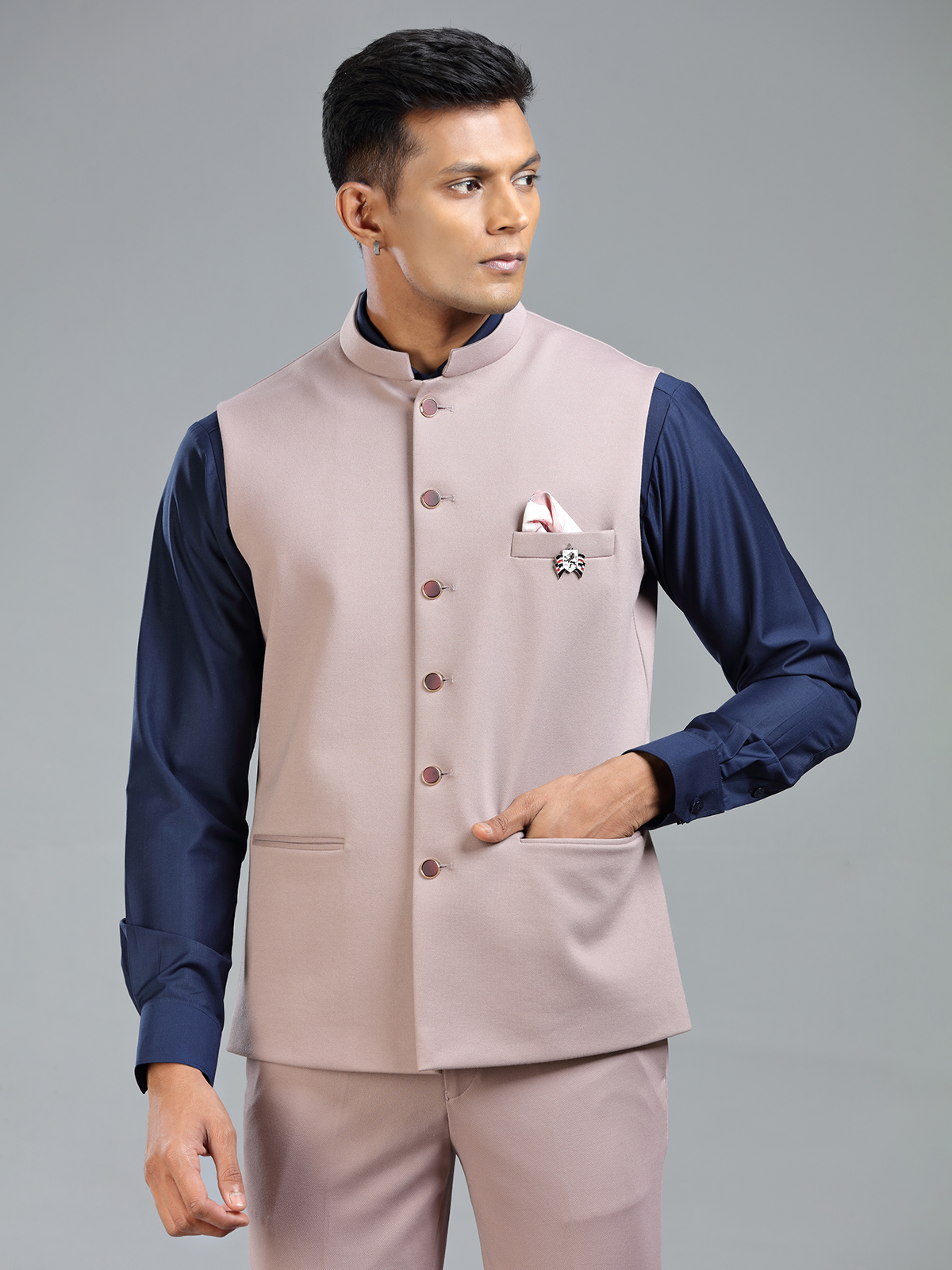 Bring a fresh and cheerful touch to your wardrobe with a peach waistcoat made from terry rayon fabric. The Bandhgala or Nehru jacket cut, paired with the vibrant peach hue, ensures you look stylish and festive for any celebration. It's the perfect choice for those who want to stand out with a bright, polished appearance.