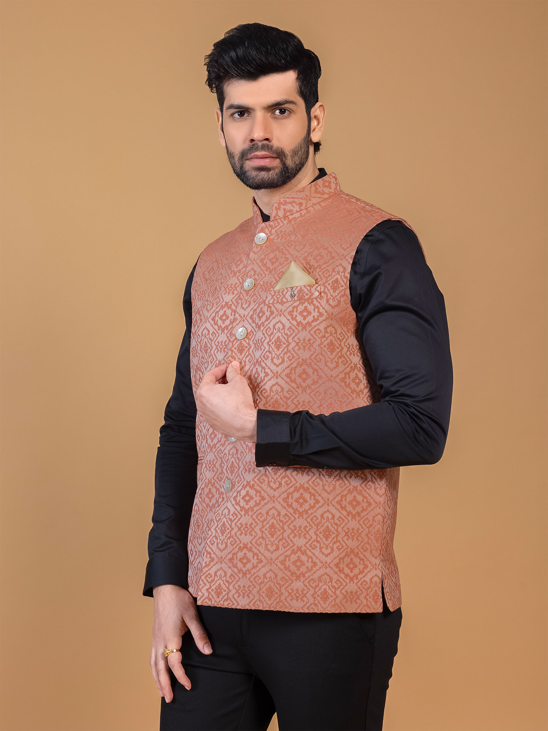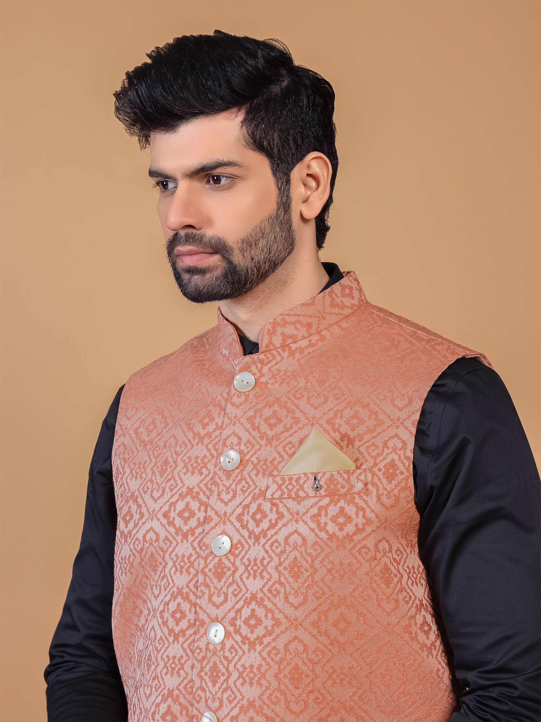 Make a captivating choice with this peach silk waistcoat featuring stunning resham work, mandarin collar, and sleeveless pattern for a fashion forward stance.
